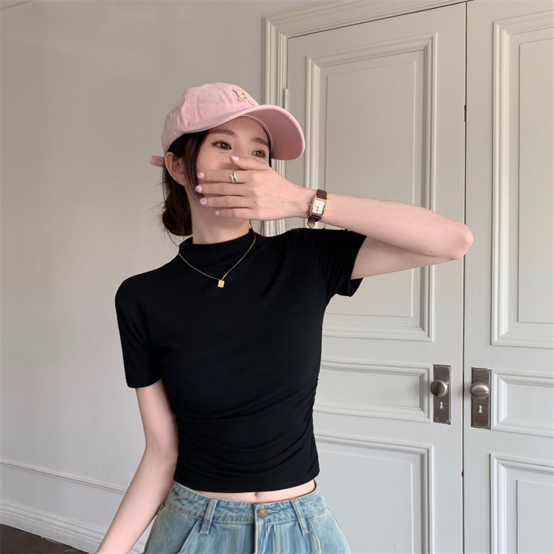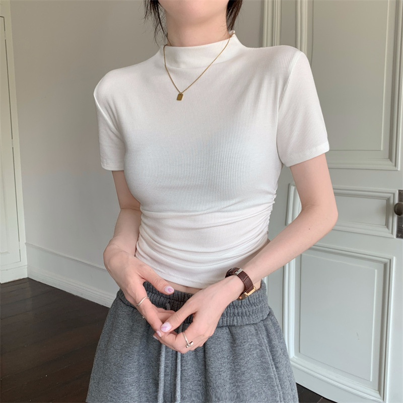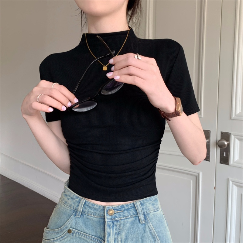半高领短袖t恤女夏季2025年新款打底衫内搭修身短款学生皱褶上衣