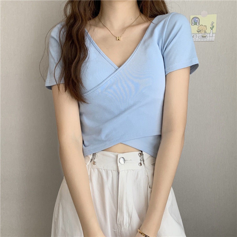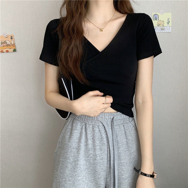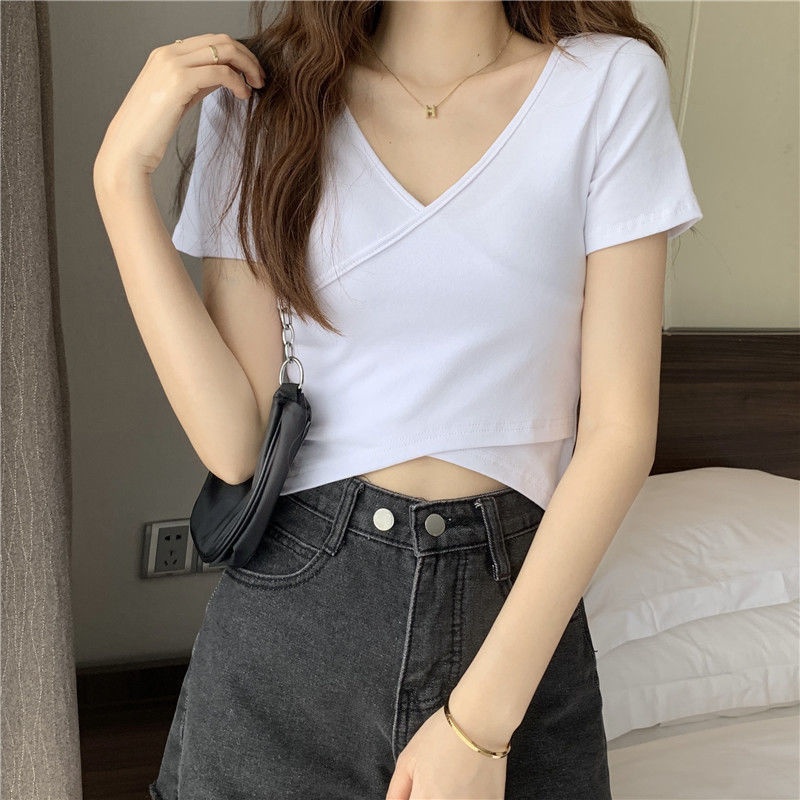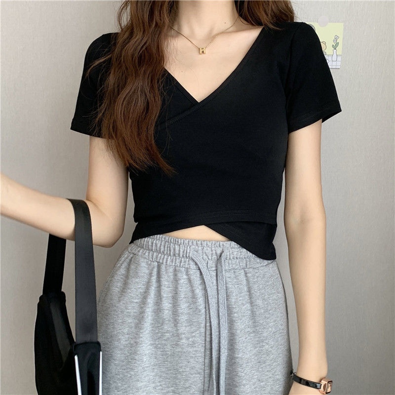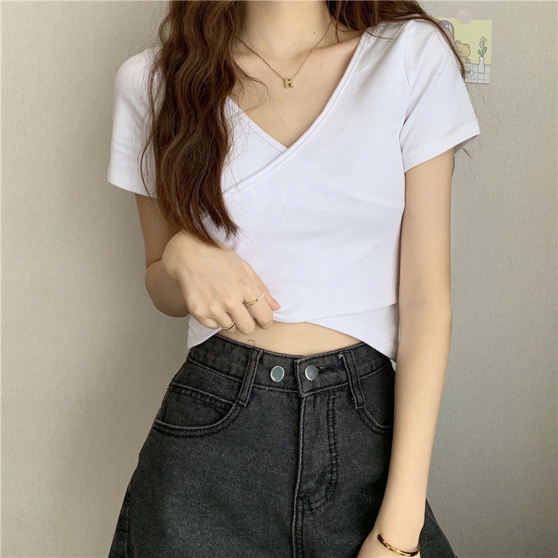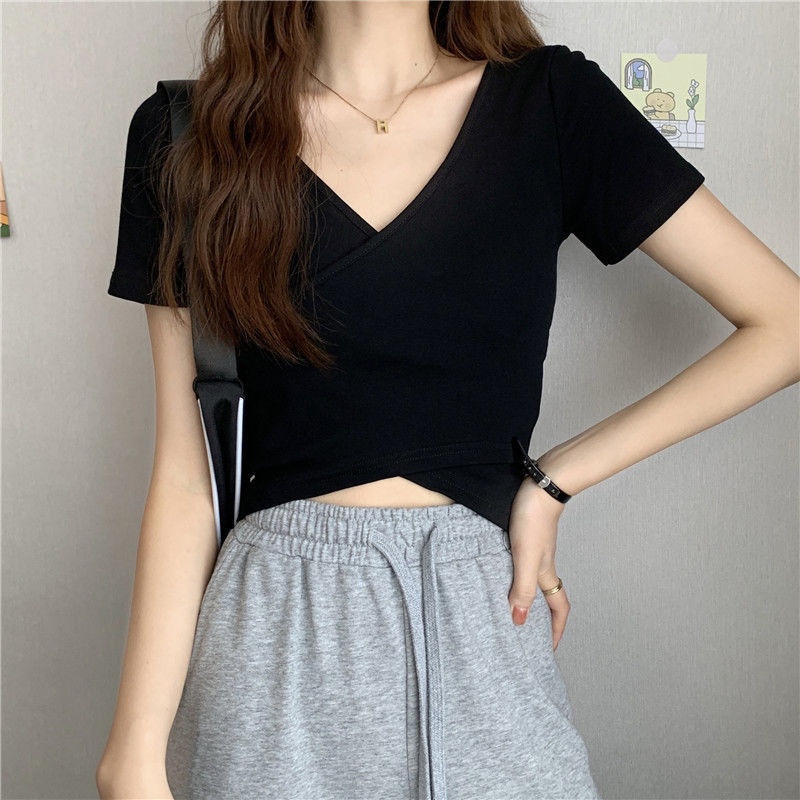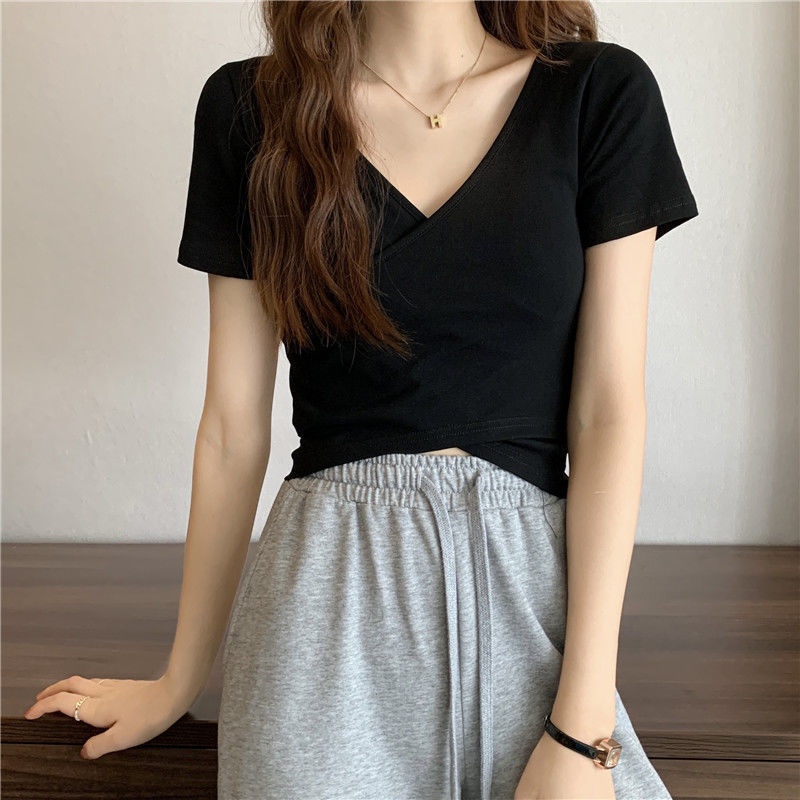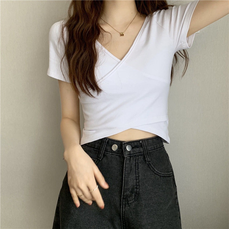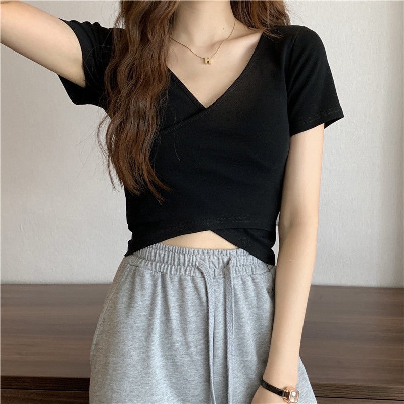 2025夏季新款设计交叉百搭显瘦修身短袖T恤女韩版短款纯色上衣女