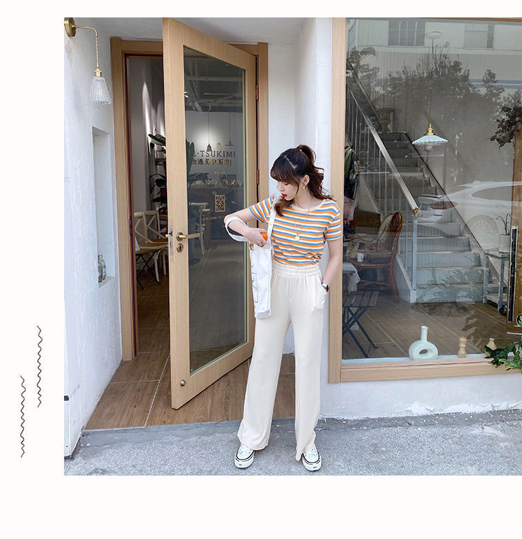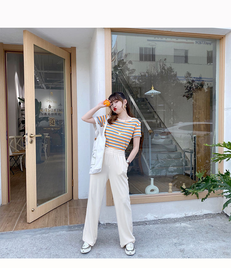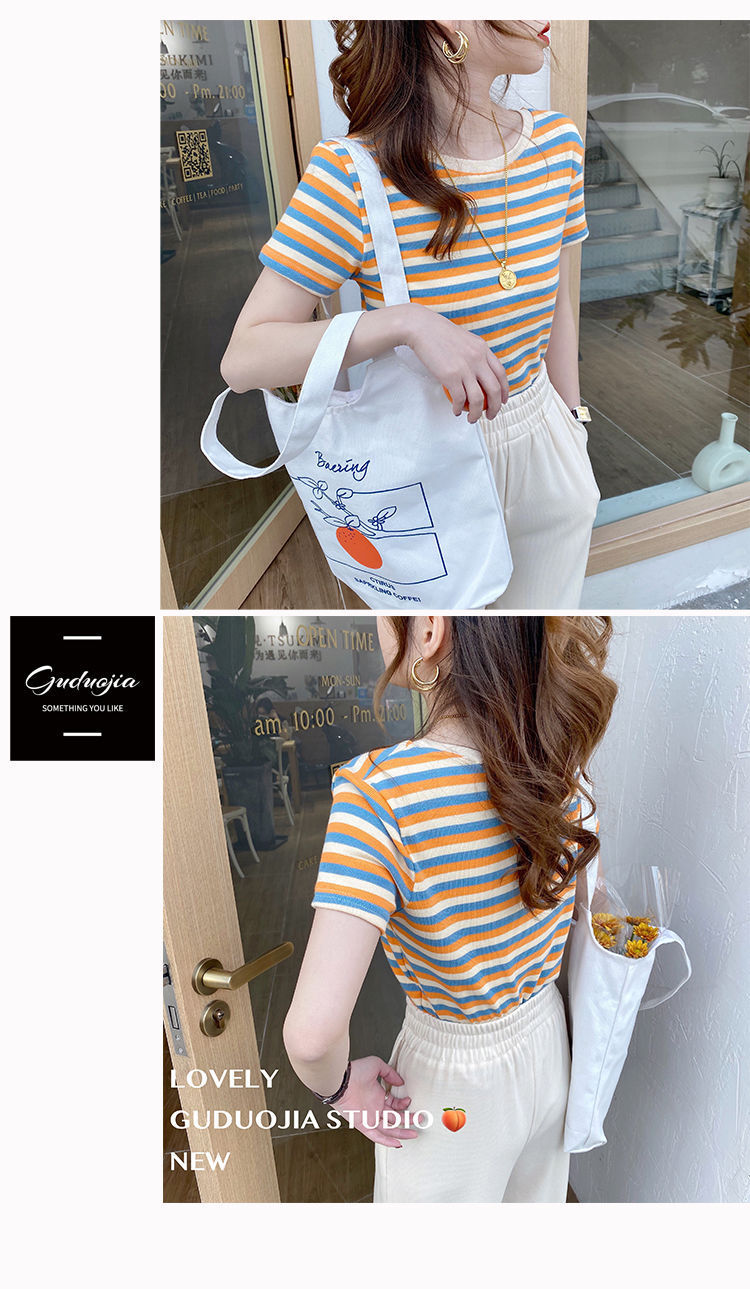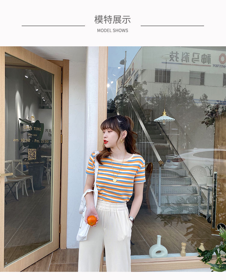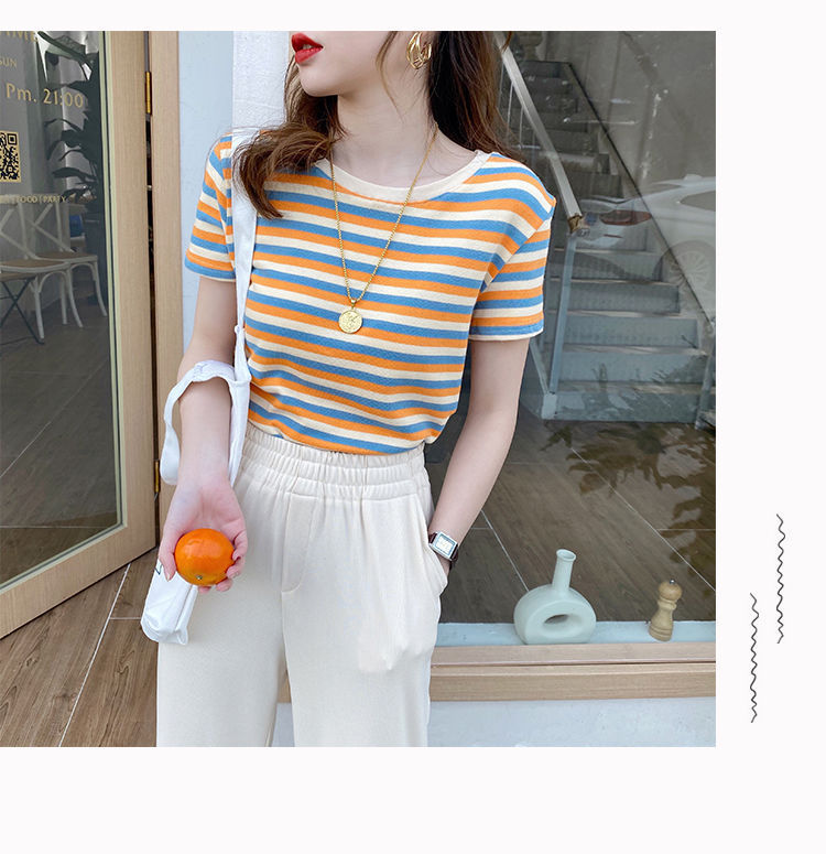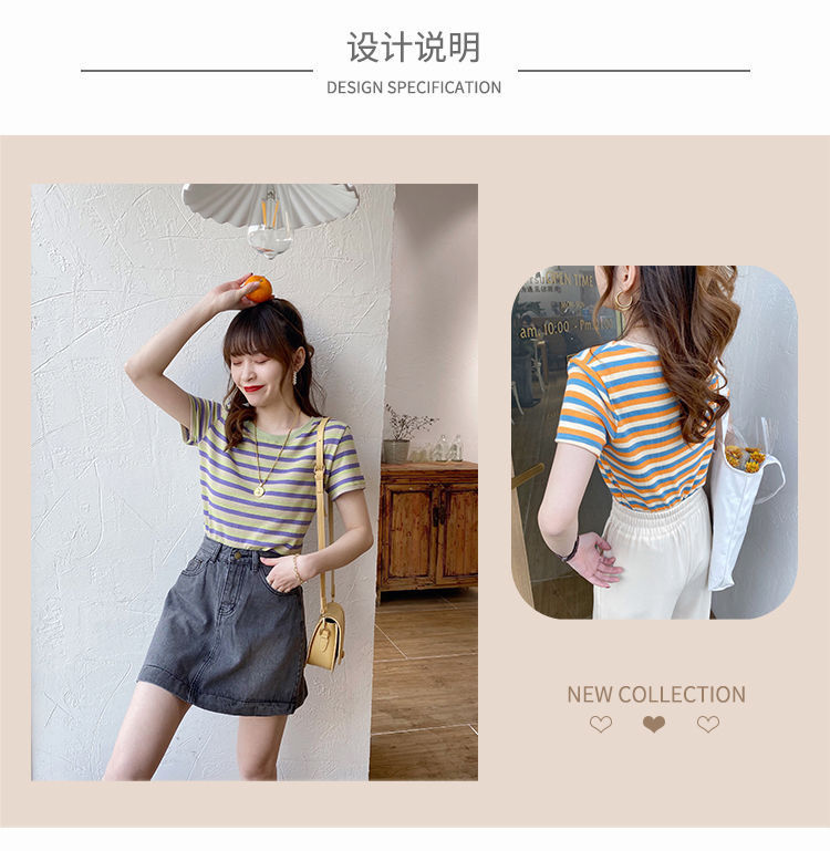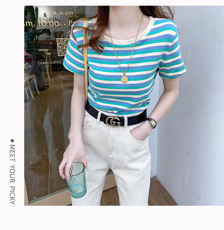 网红条纹短袖t恤女士2021年夏季新款女装修身上衣学生韩版打底衫