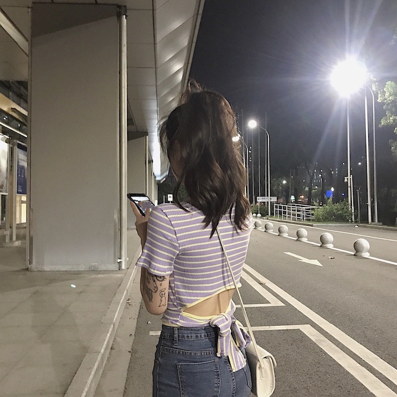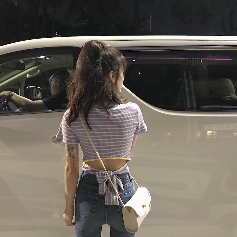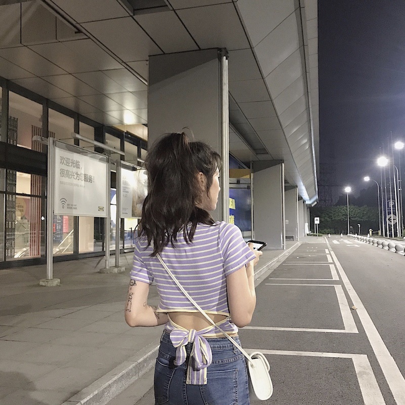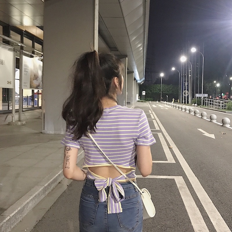 辣妹露背条纹短袖T恤女装夏季2025新款设计感短款学生绑带上衣潮