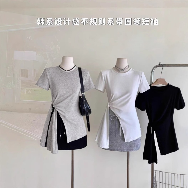 露腰绑带纯色短袖T恤女2025夏季新款韩版圆领百搭套头学生上衣潮