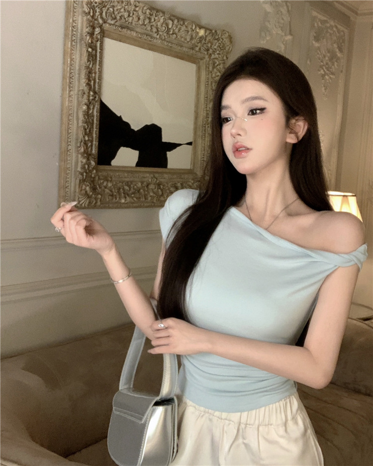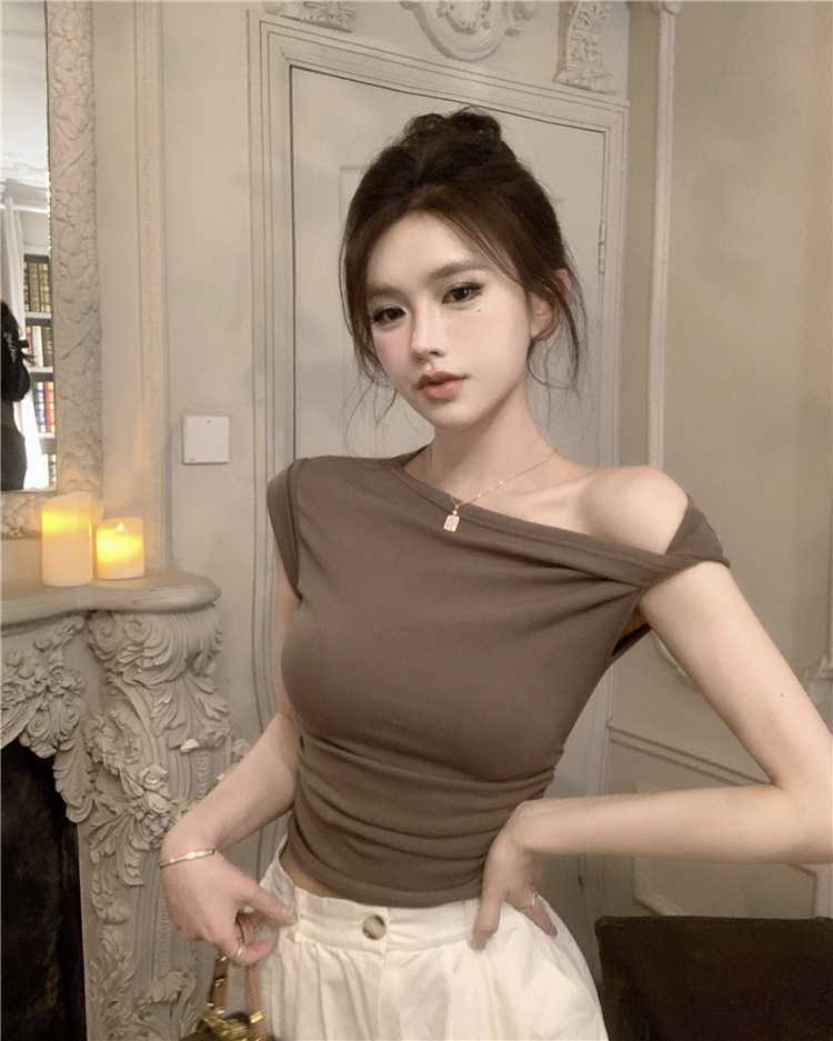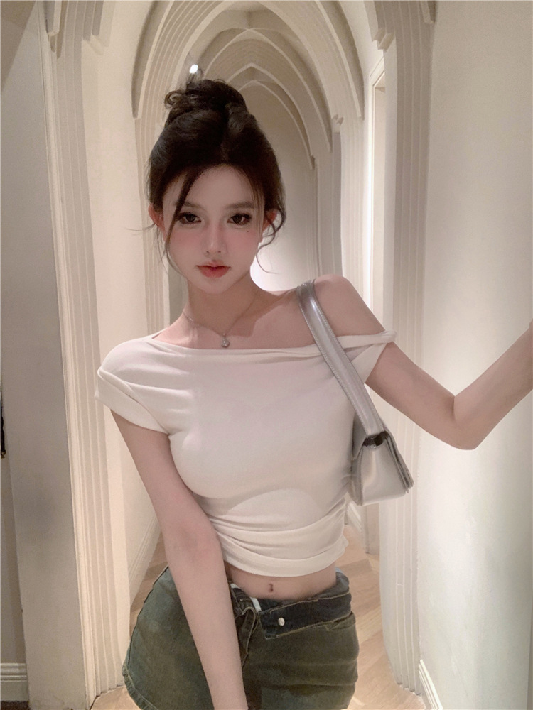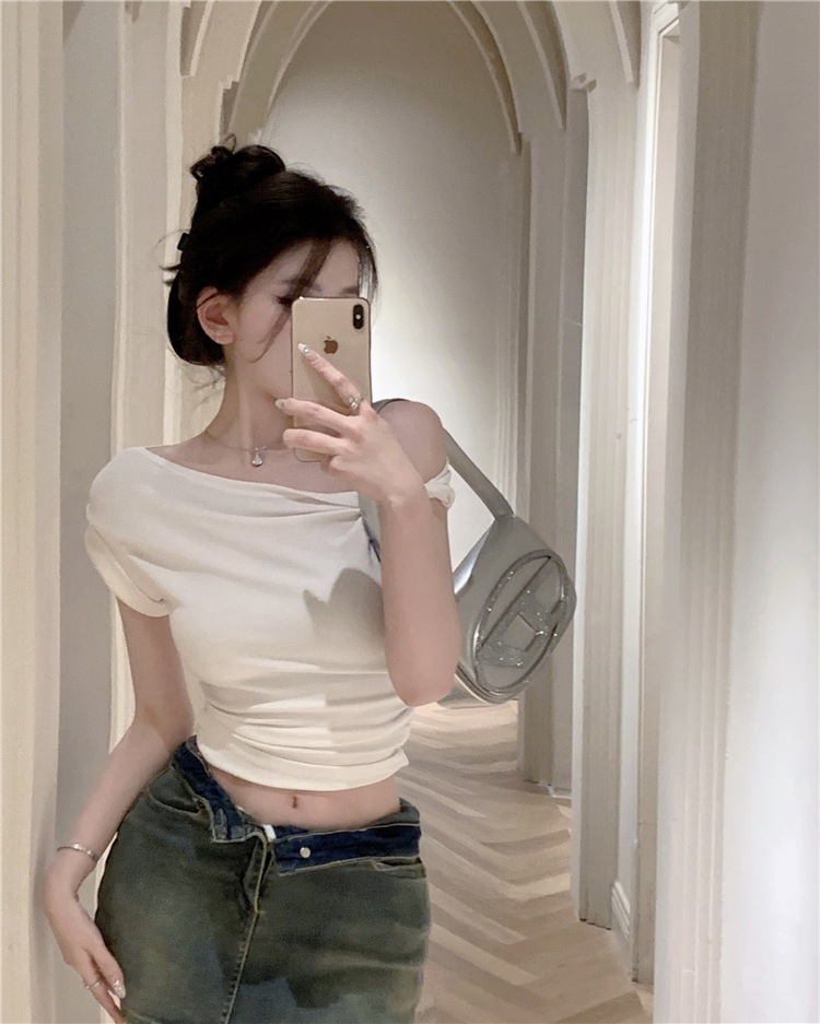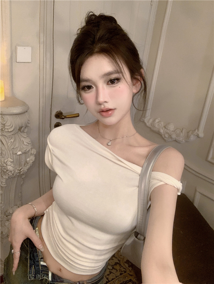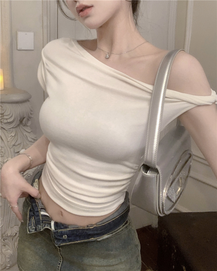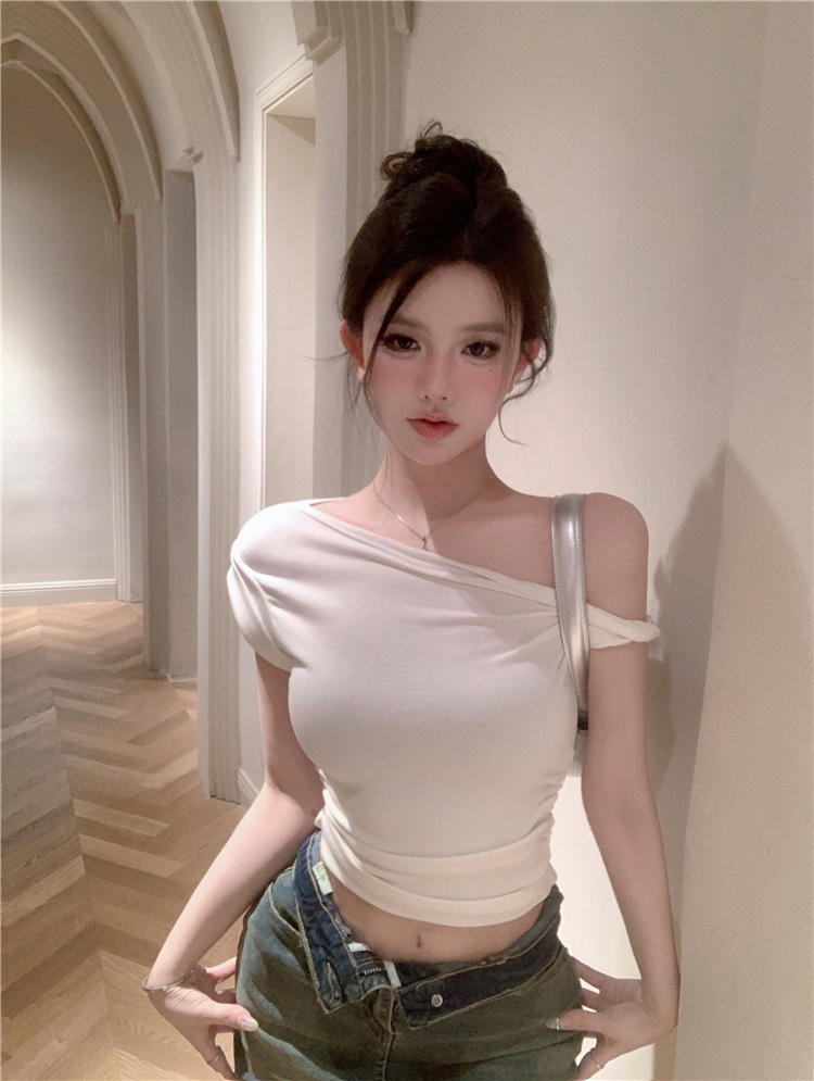 辣妹斜肩短袖t恤女2025夏季纯欲风性感不规则设计感皱褶短款上衣