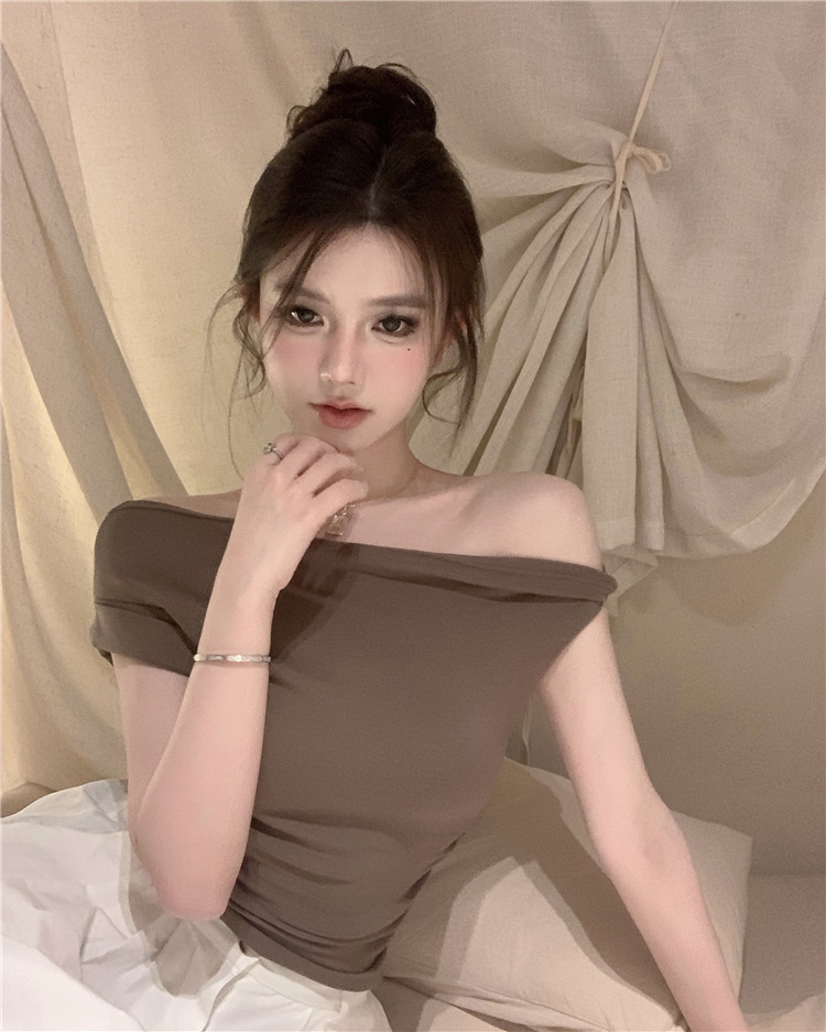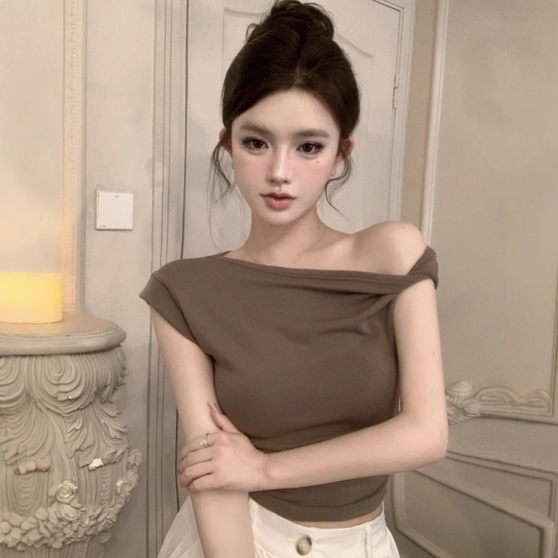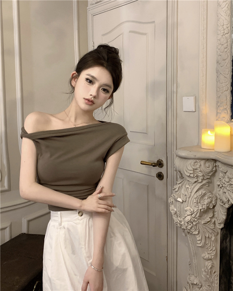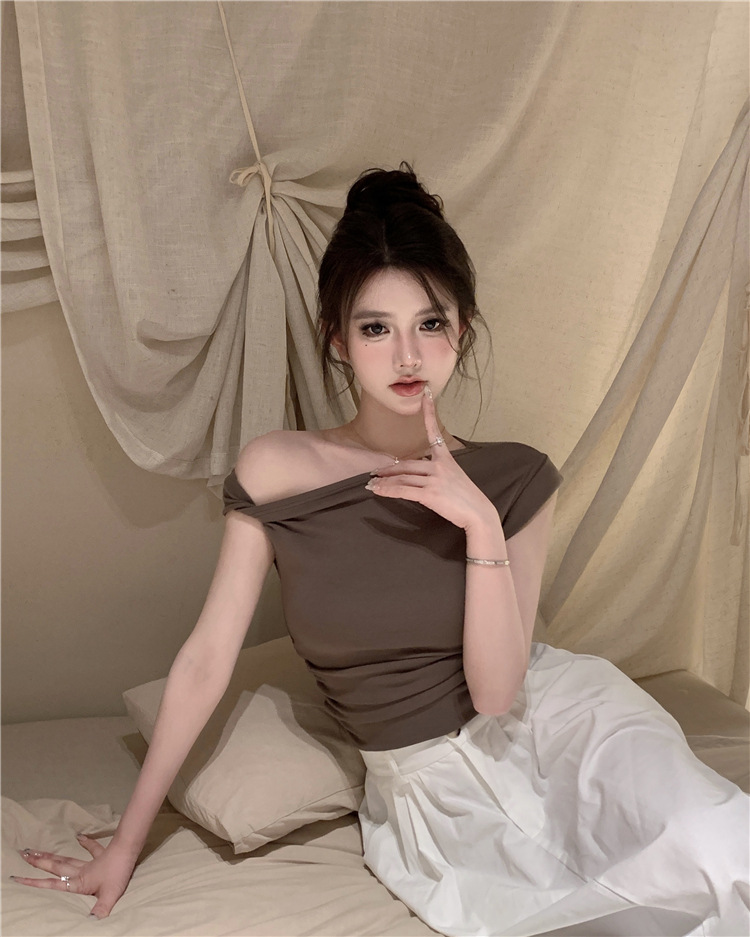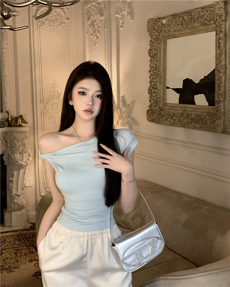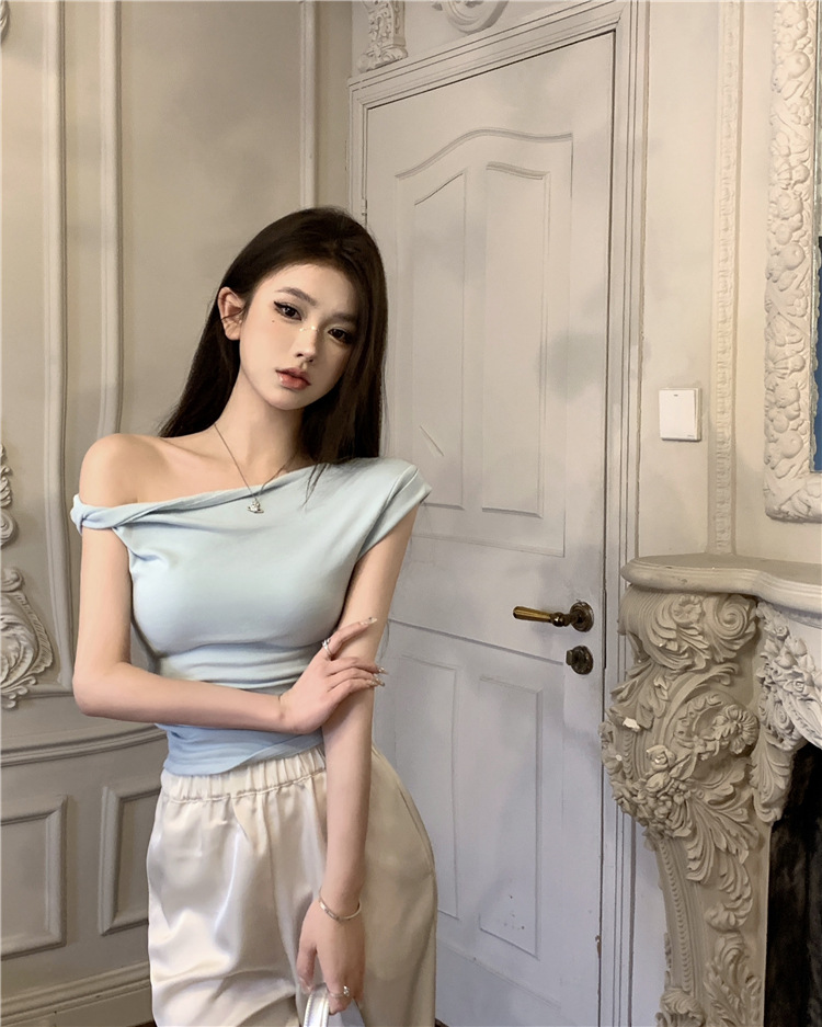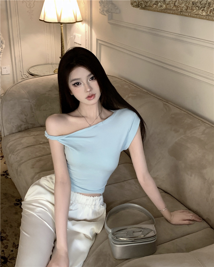 辣妹斜肩短袖t恤女2025夏季纯欲风性感不规则设计感皱褶短款上衣