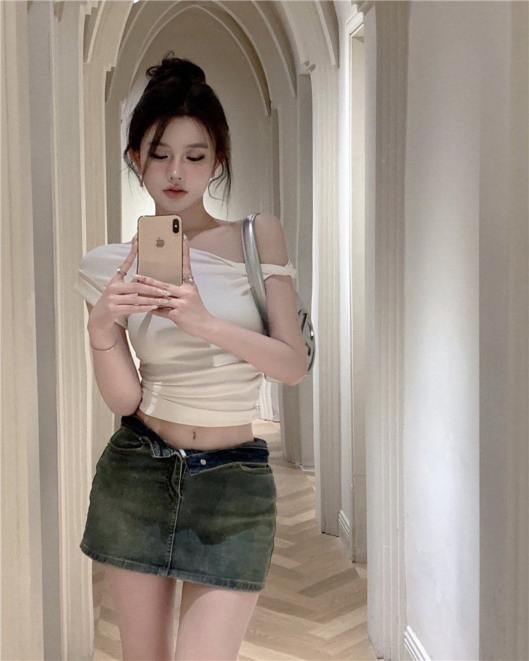 辣妹斜肩短袖t恤女夏季纯欲风绿色性感不规则设计感小众短款上衣