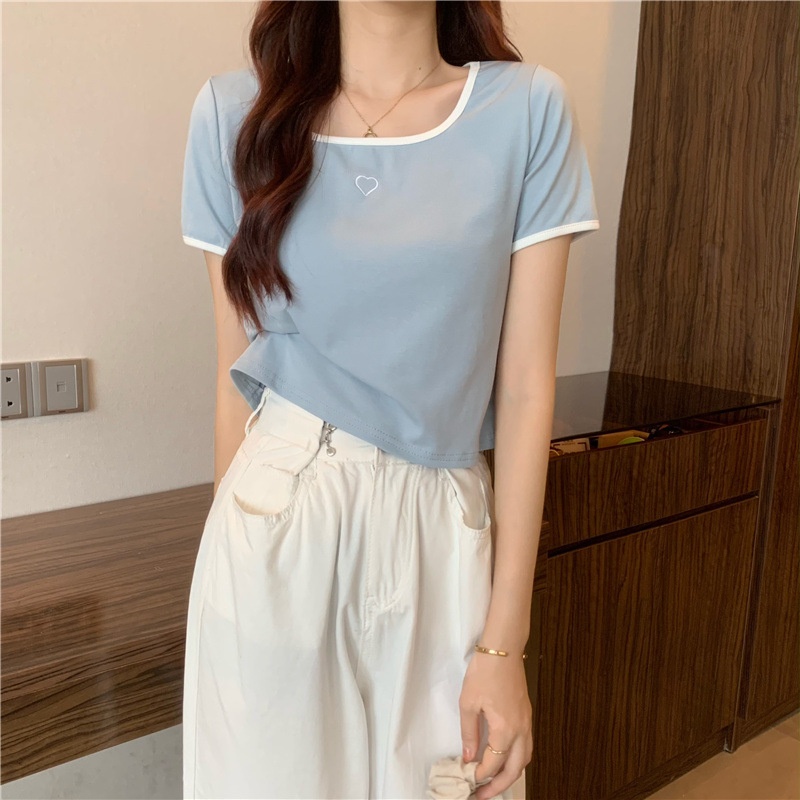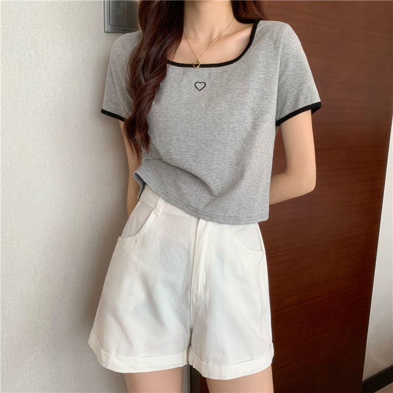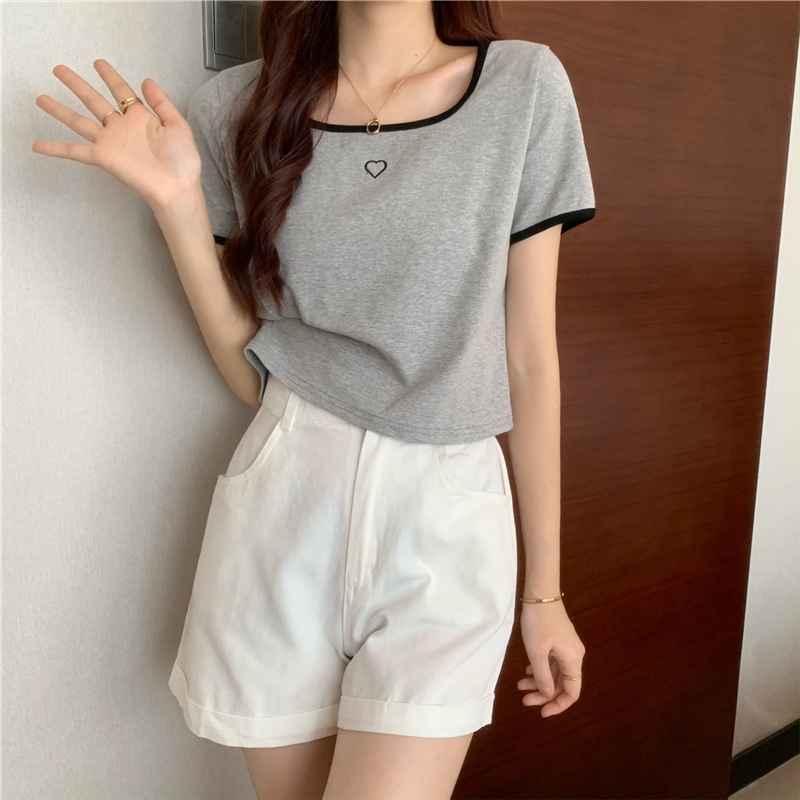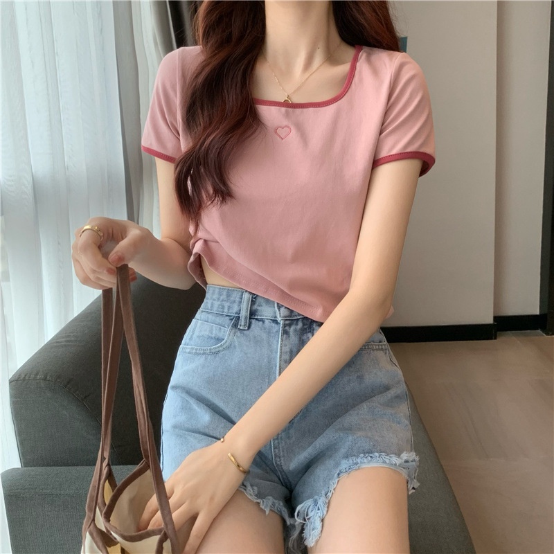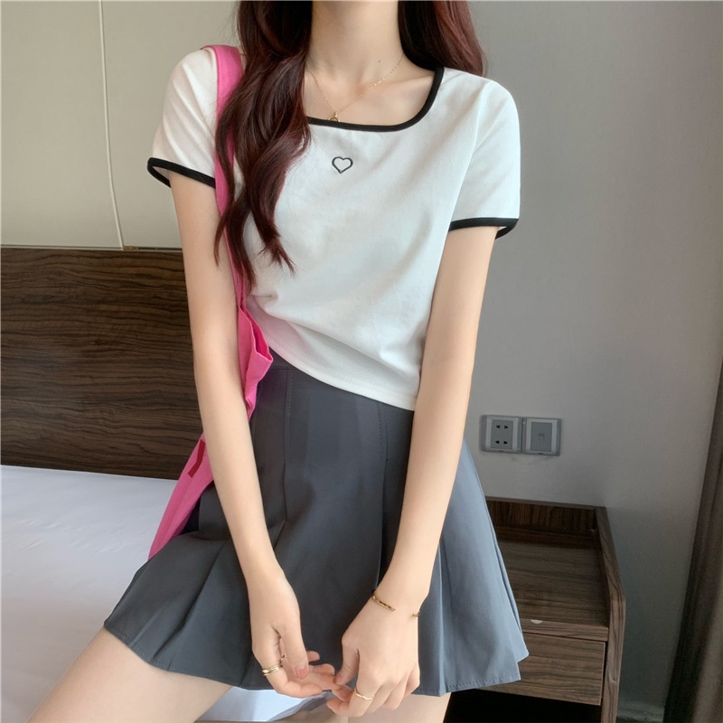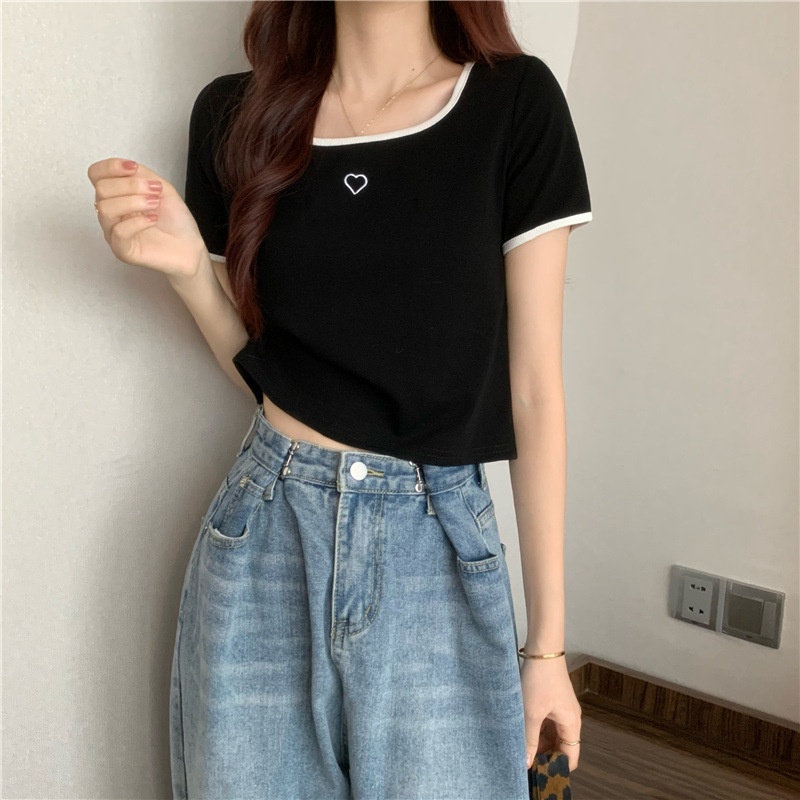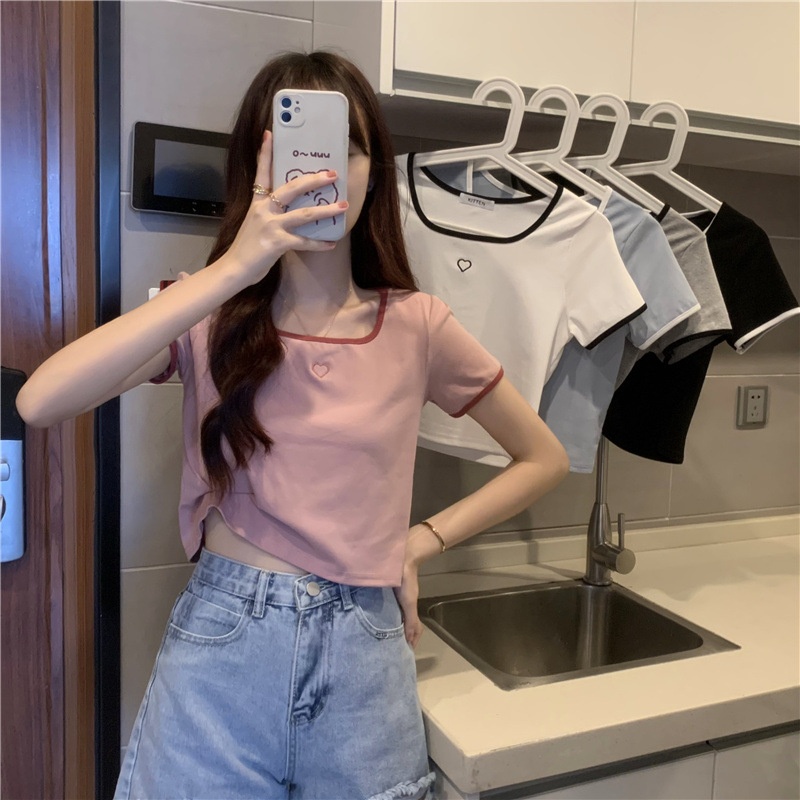 爱心刺绣T恤女ins潮短款辣妹修身纯欲风修身短袖上衣2025夏季新款