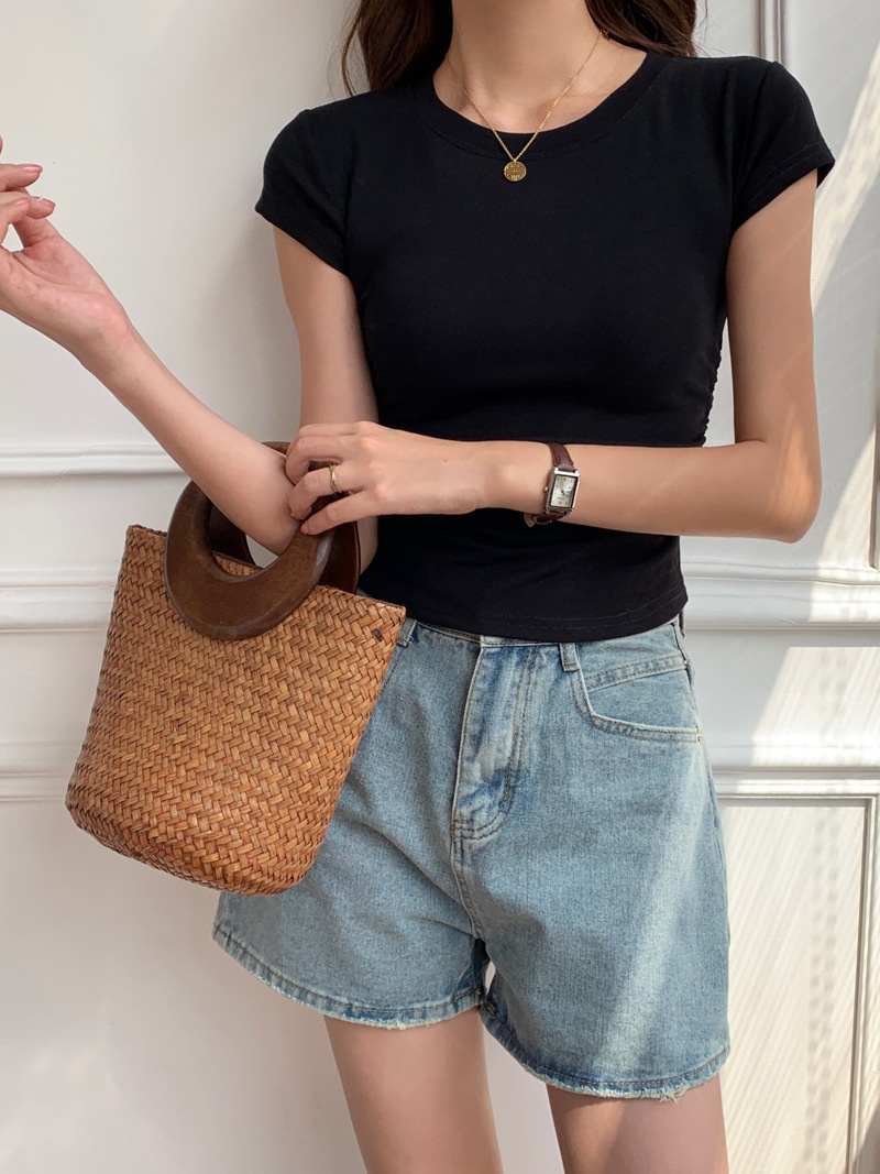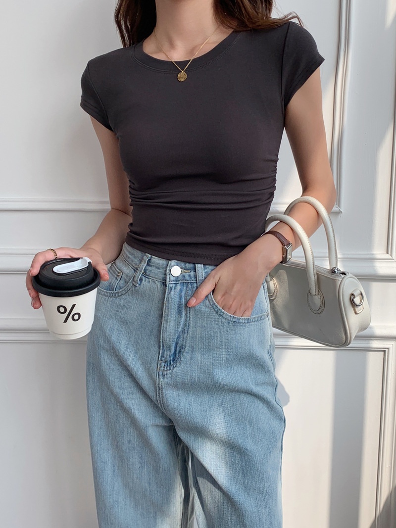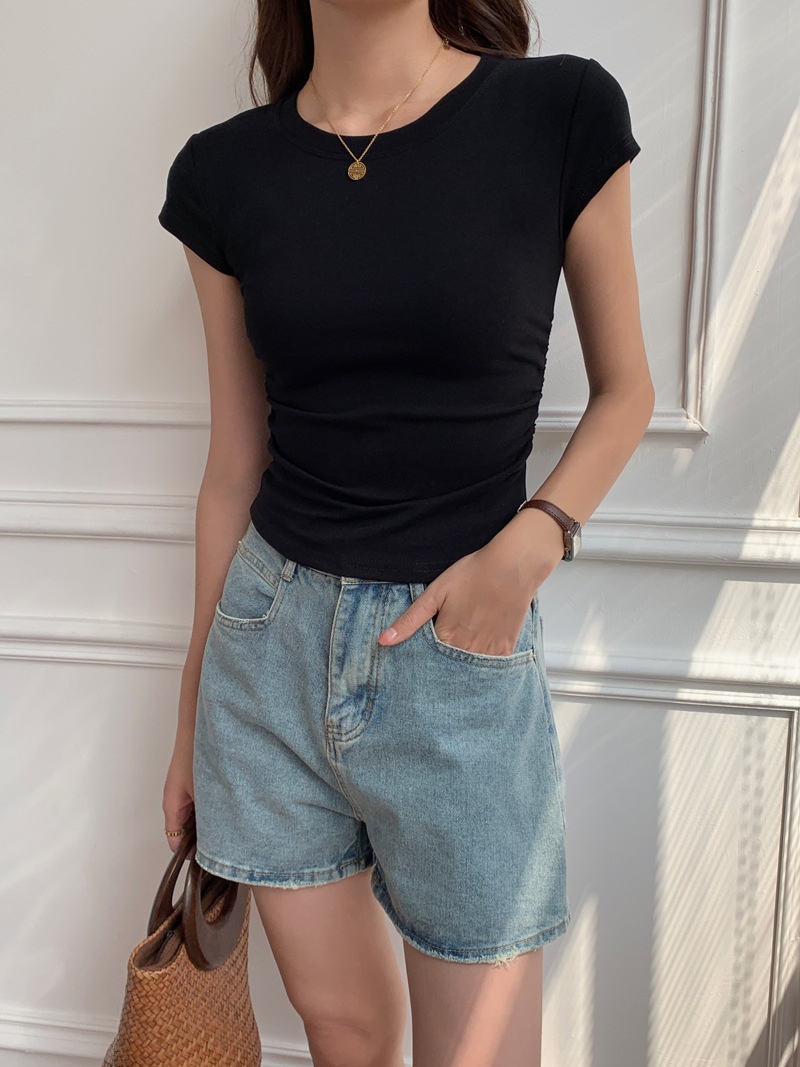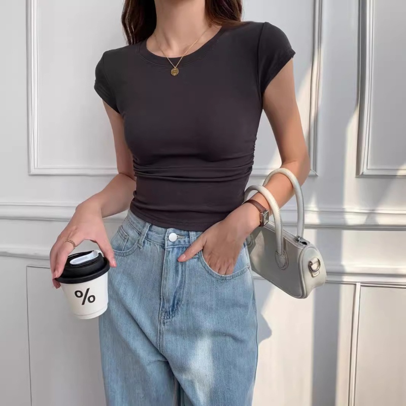 欧美纯色t恤短袖2024春夏显瘦设计感小众短款卡腰收腰正肩上衣ins