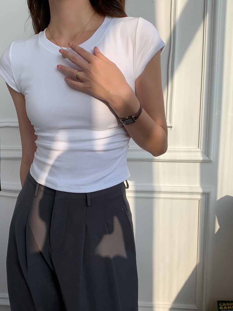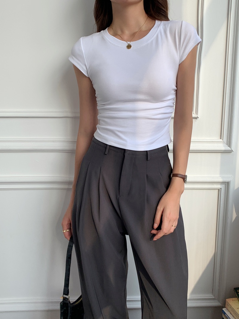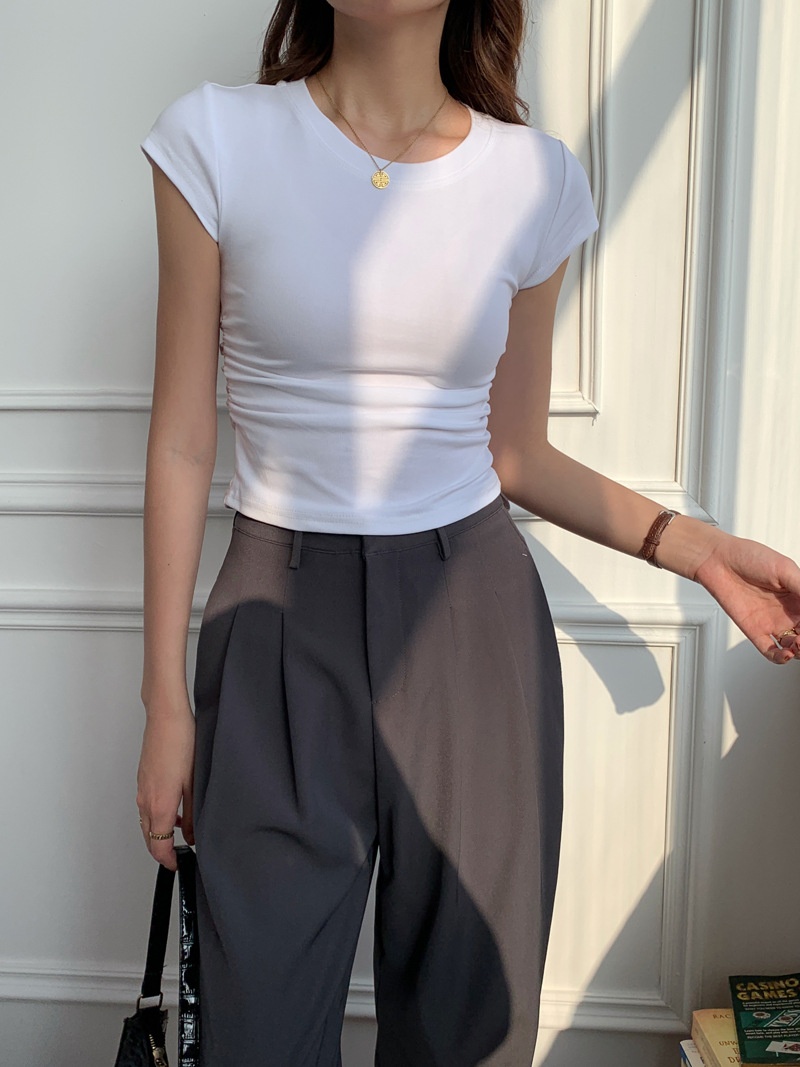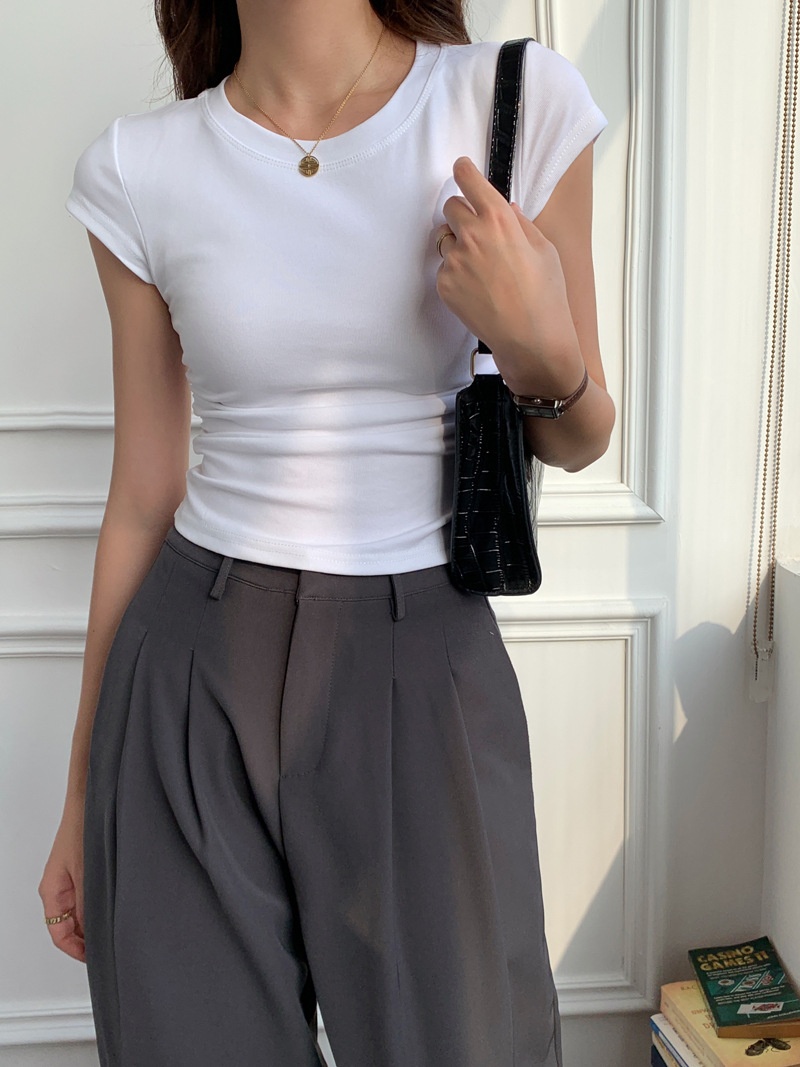 欧美纯色t恤短袖2024春夏显瘦设计感小众短款卡腰收腰正肩上衣ins