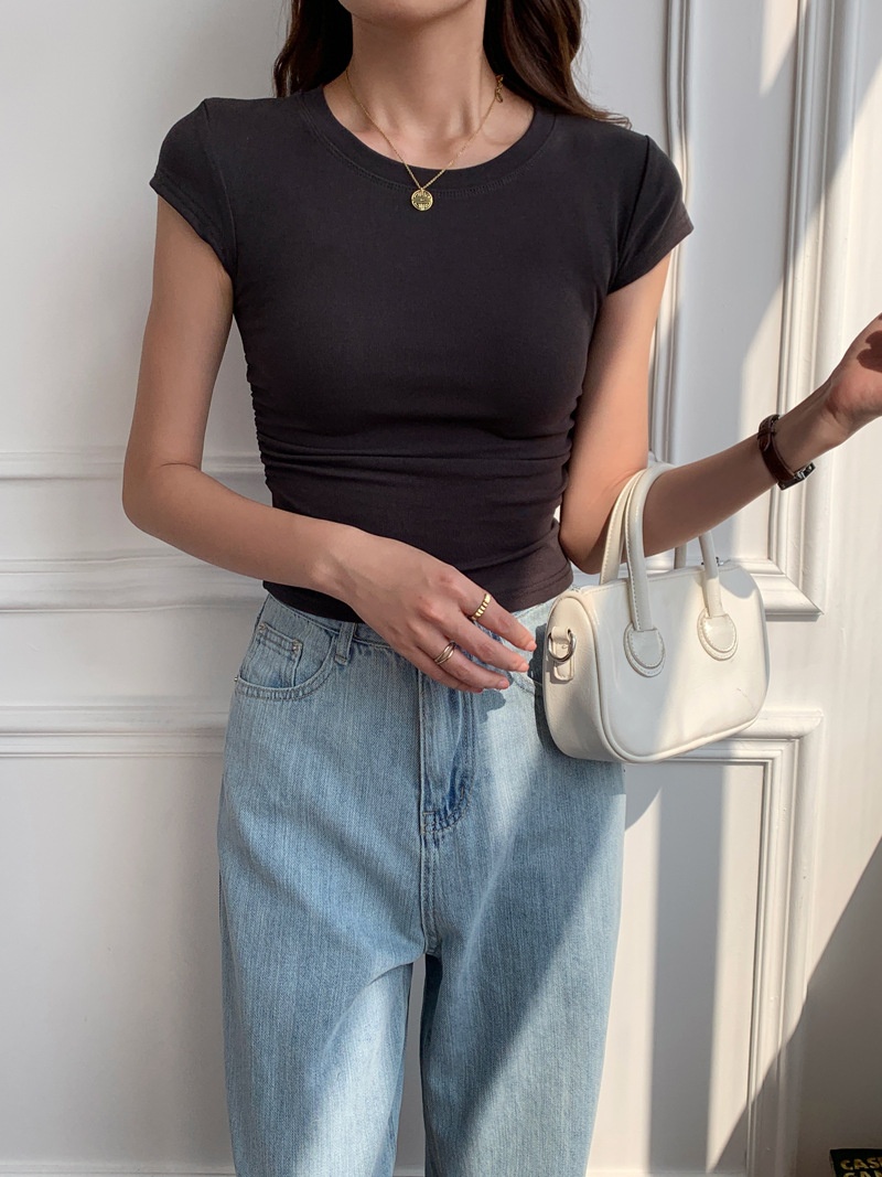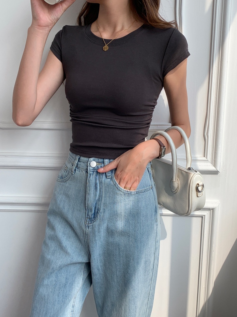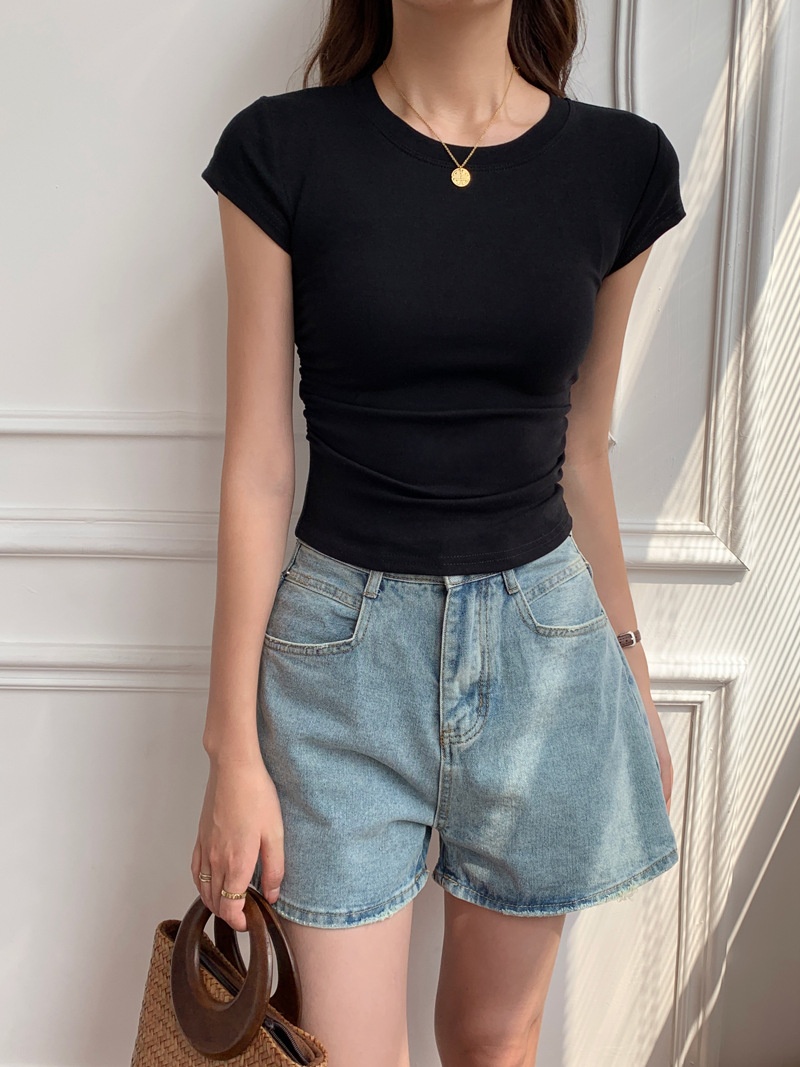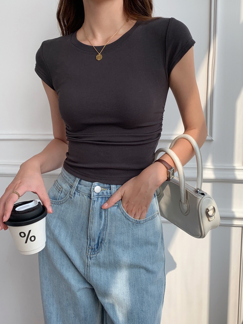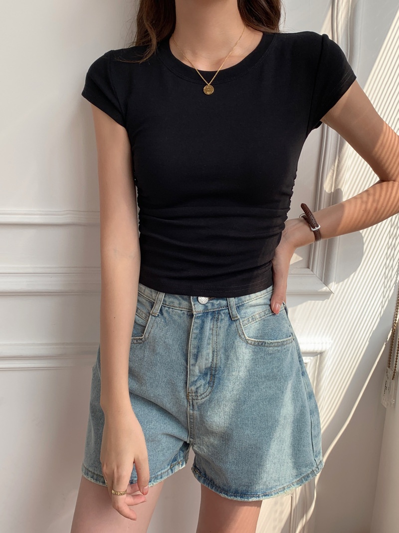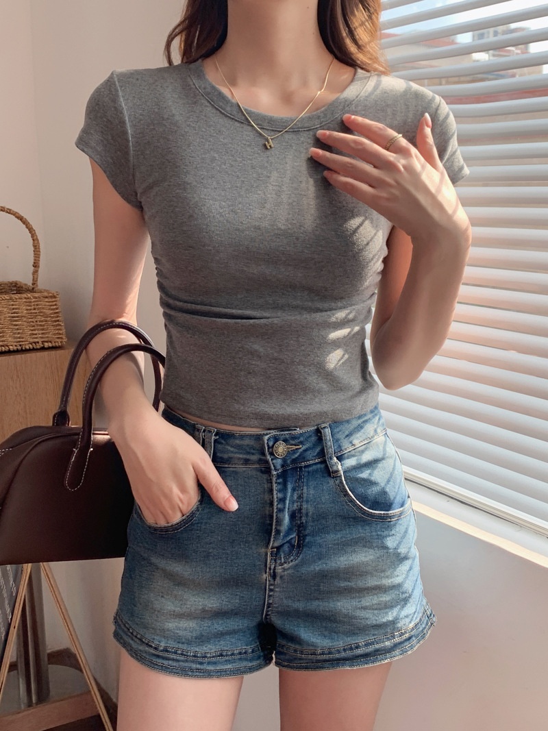 欧美纯色t恤女短袖2025夏季新款显瘦设计感收腰显瘦短款正肩上衣