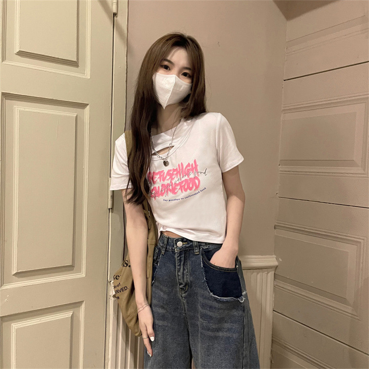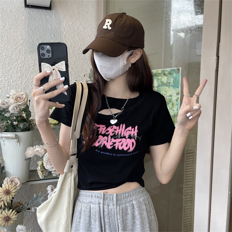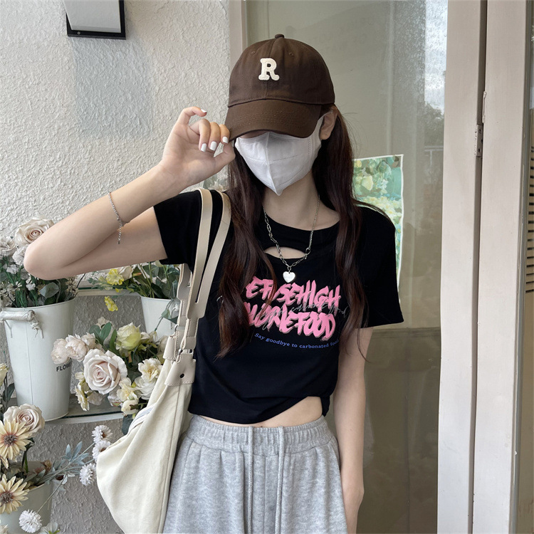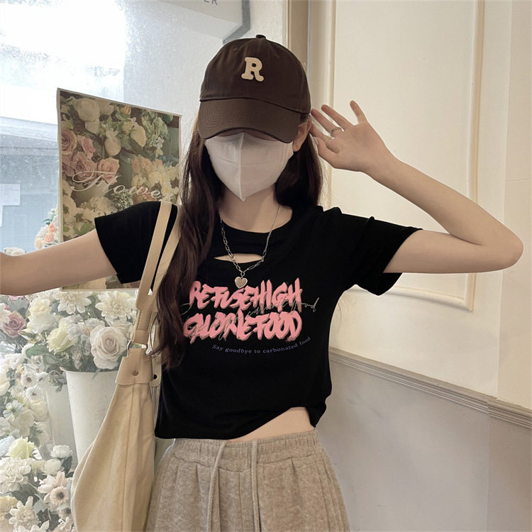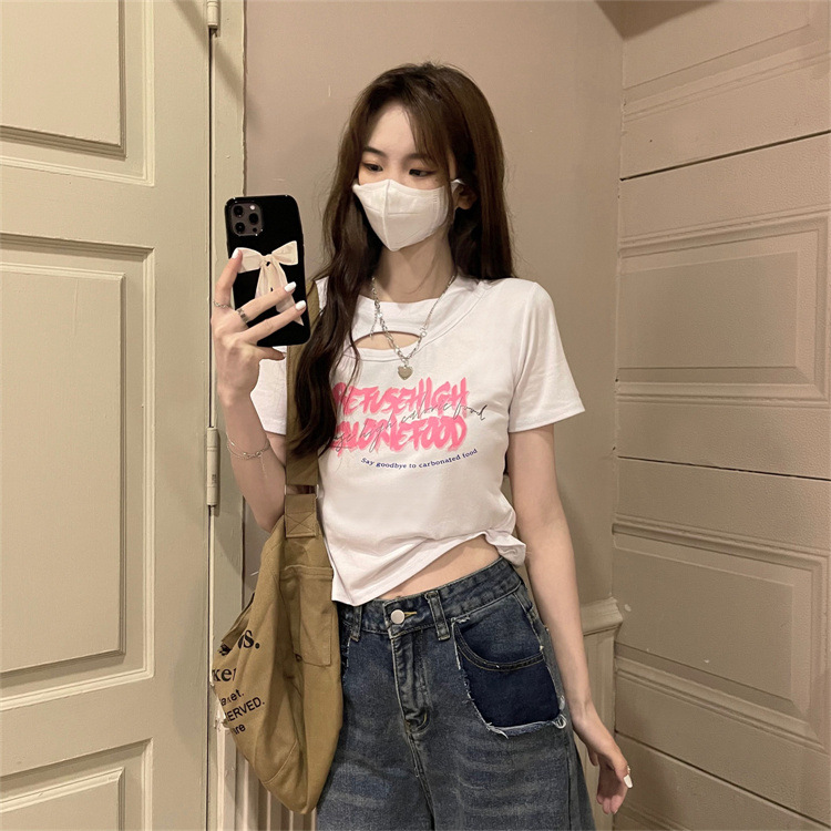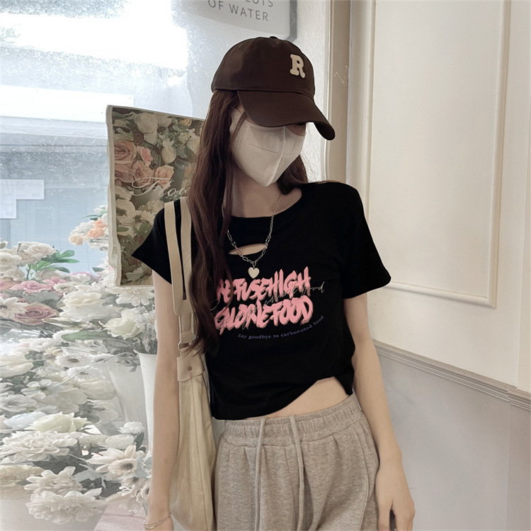 美式辣妹镂空正肩短款T恤女夏季2022新款设计感修身显瘦短袖上衣