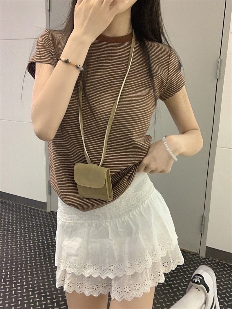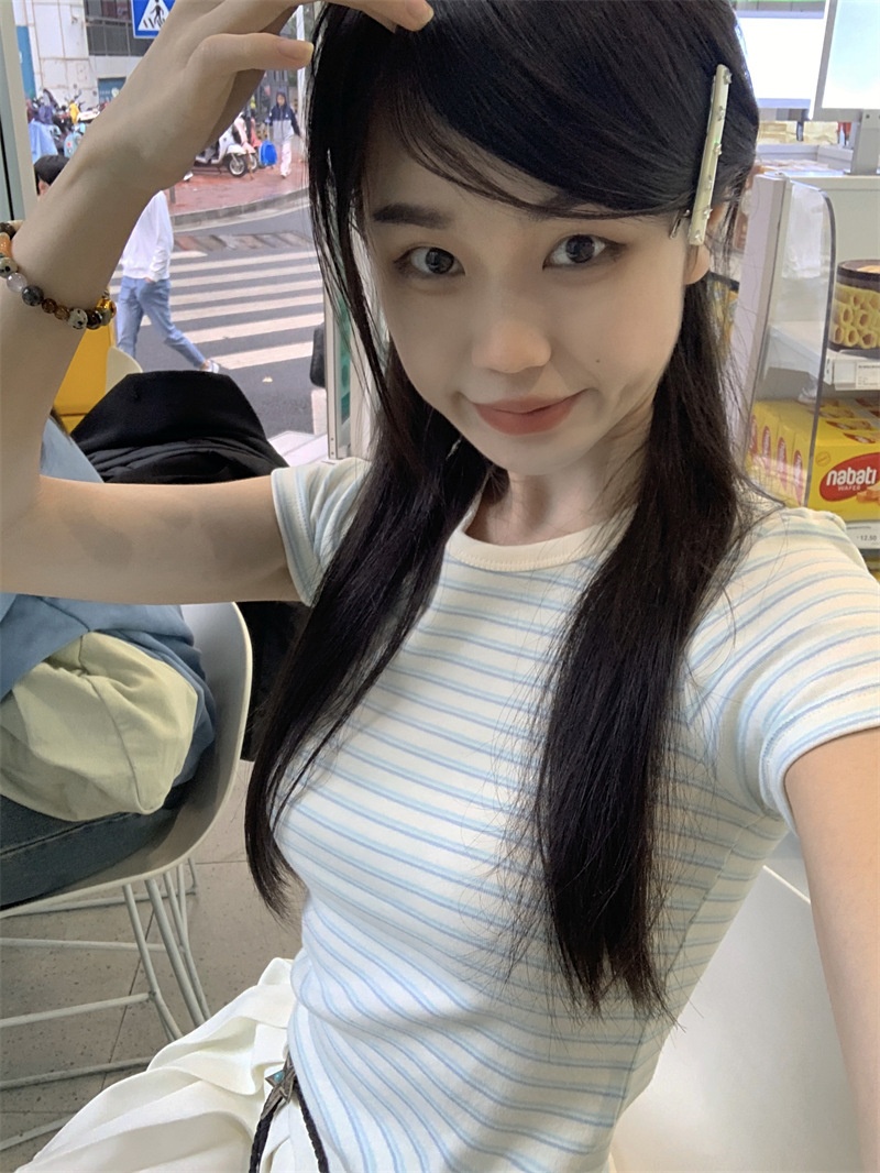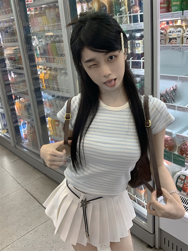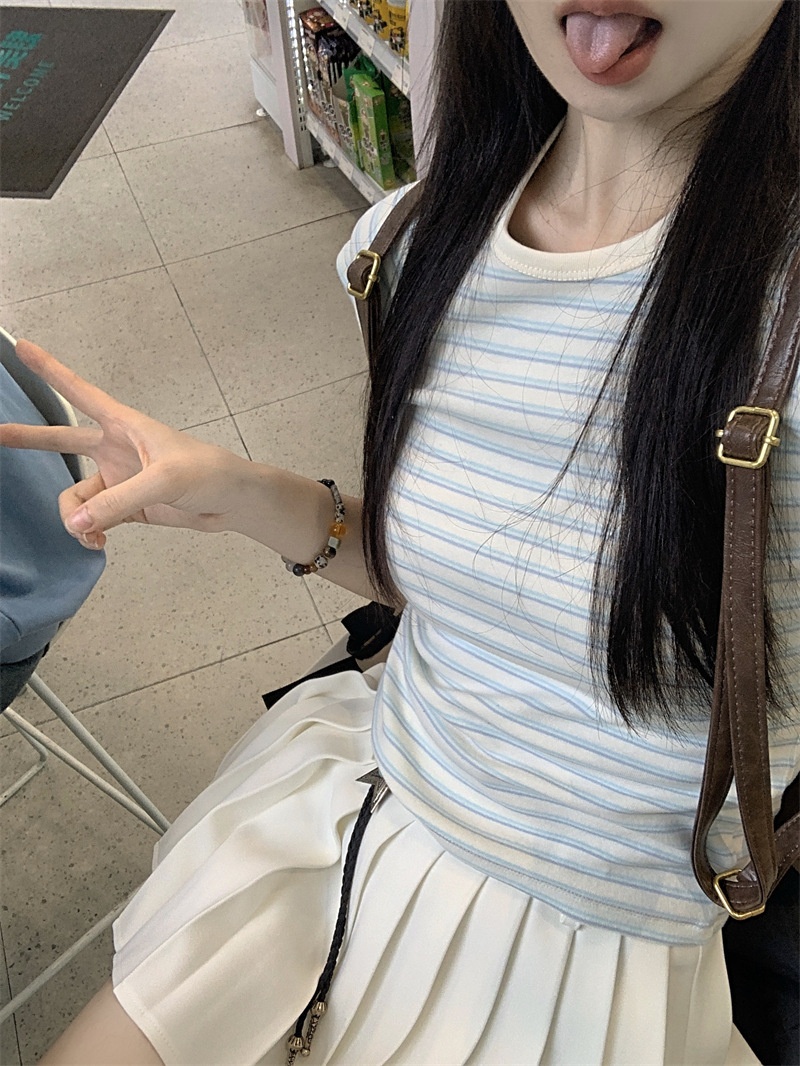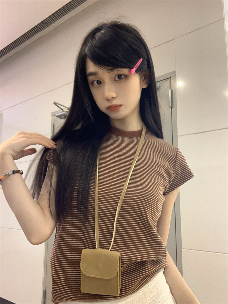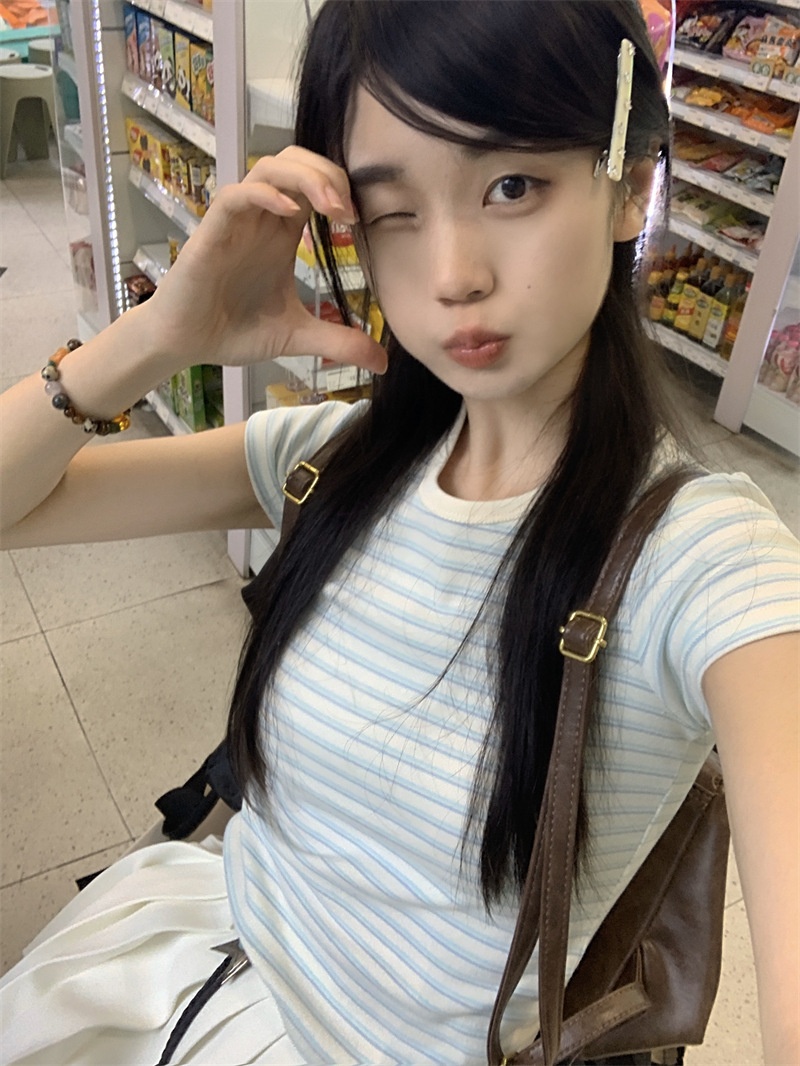 复古短袖条纹T恤女2025夏季辣妹修身显瘦打底衫百搭学生短款上衣
