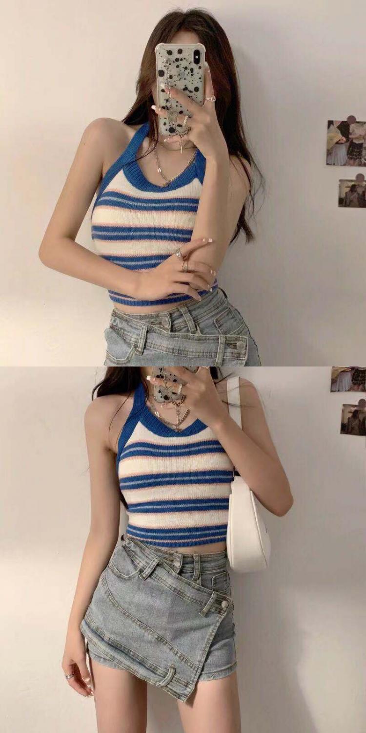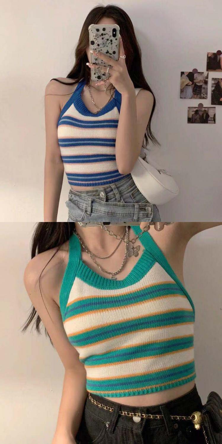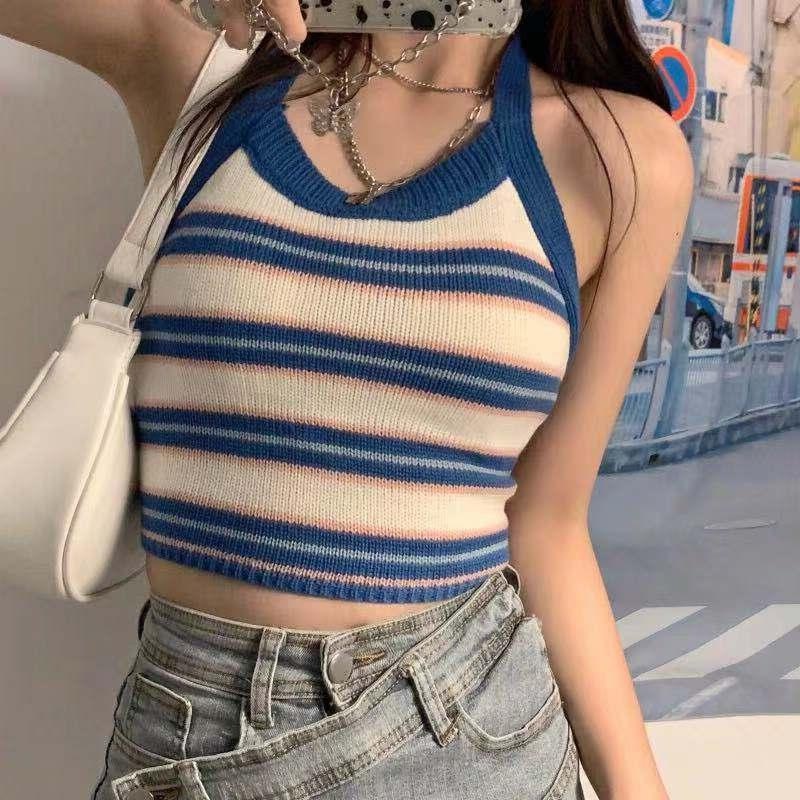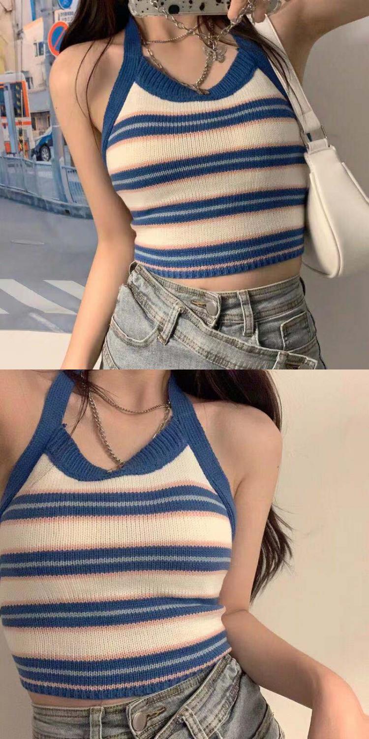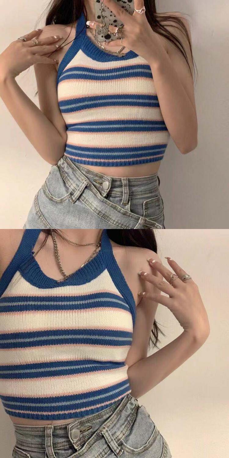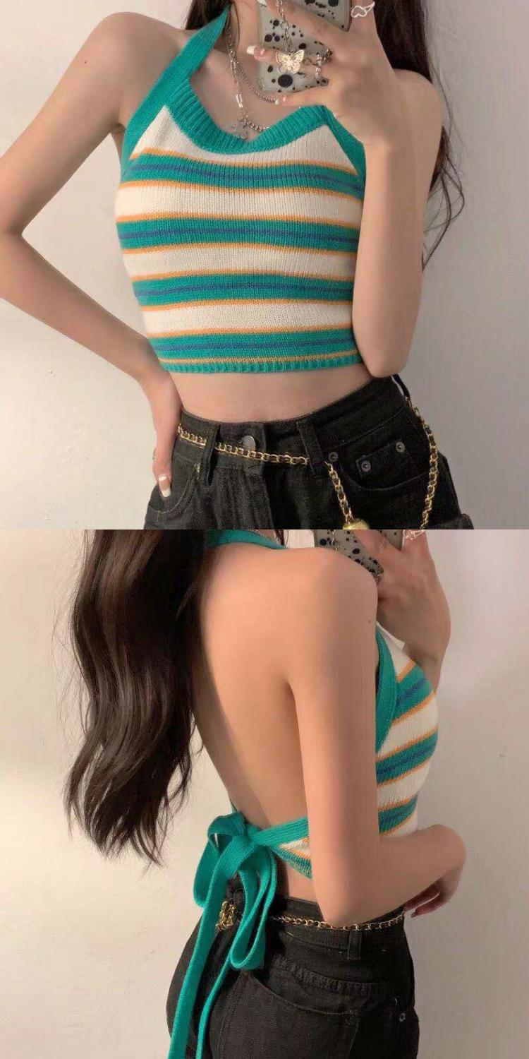 系带挂脖吊带内搭女夏露背条纹拼色短款圆领修身性感辣妹打底上衣