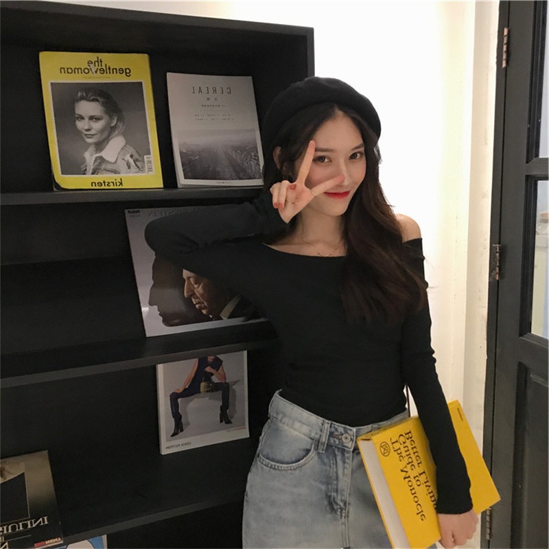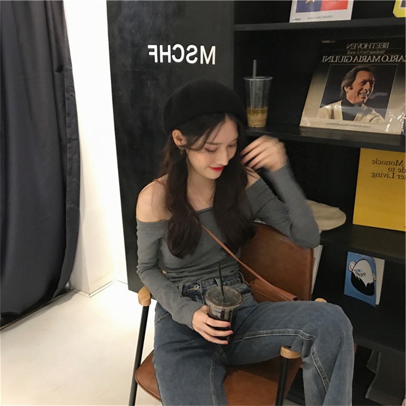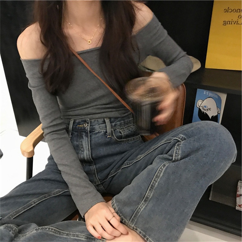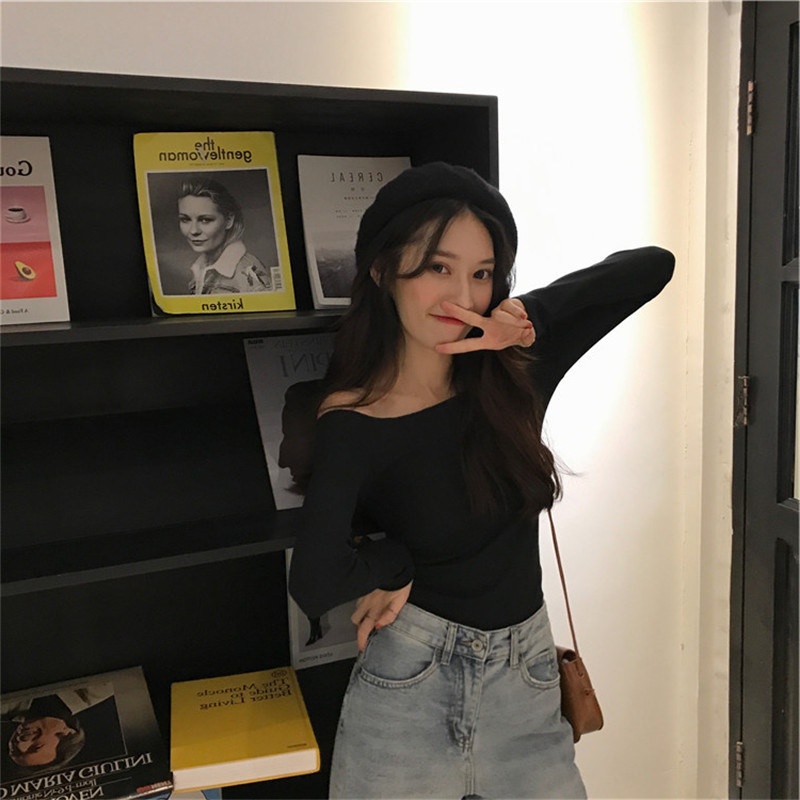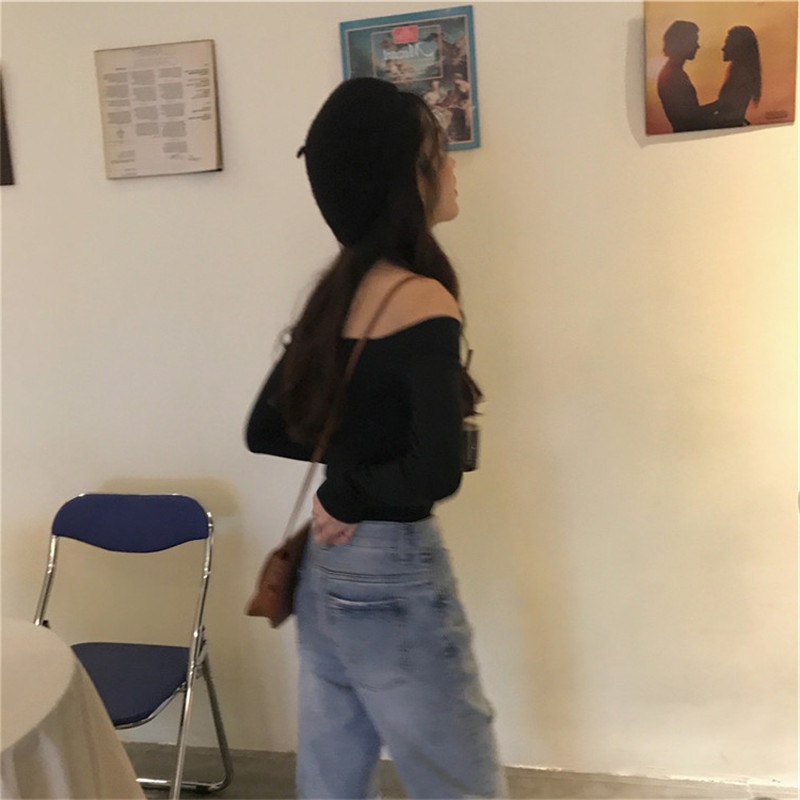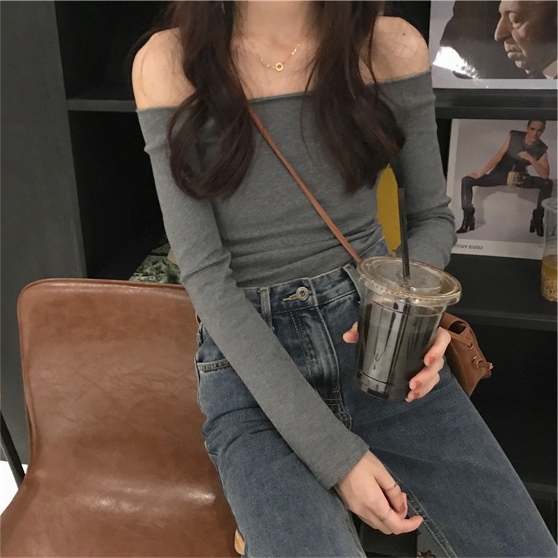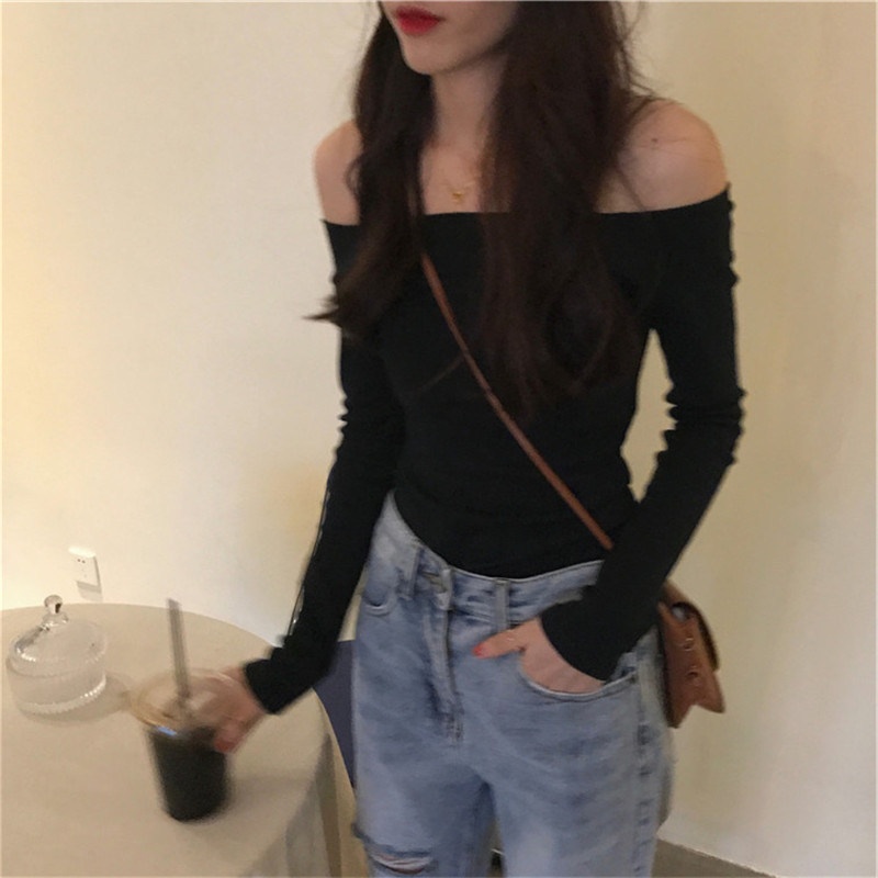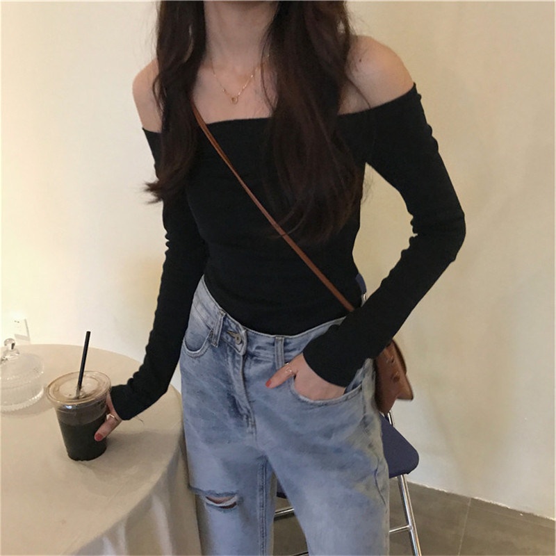 4269#一字肩上衣女夏季2022新款设计感小众短款T恤辣妹长袖打底衫