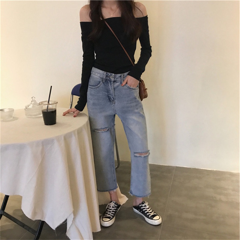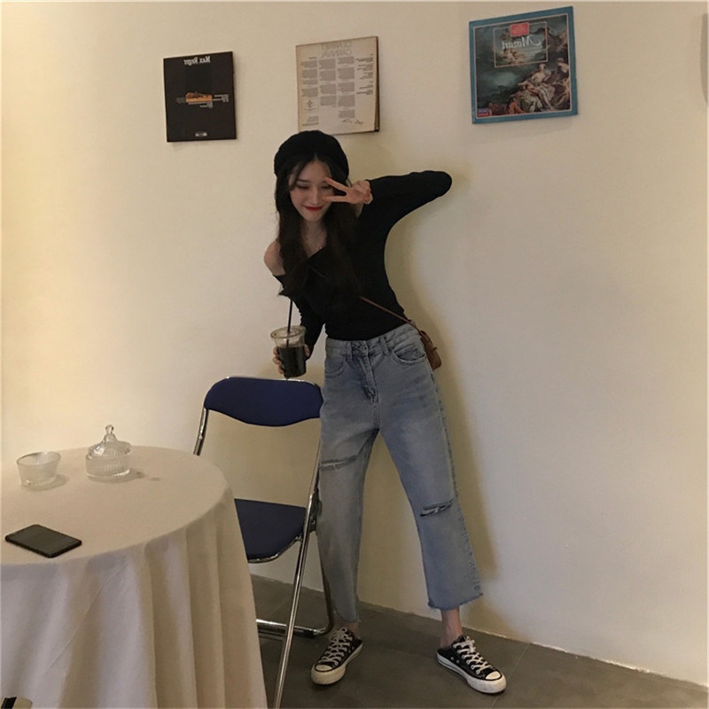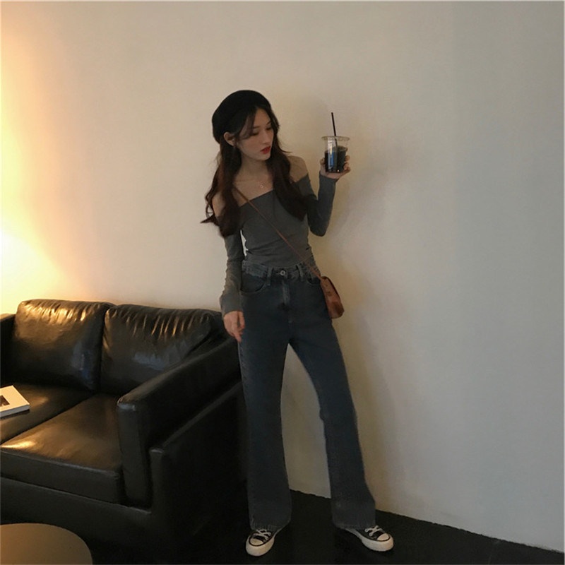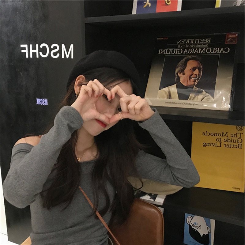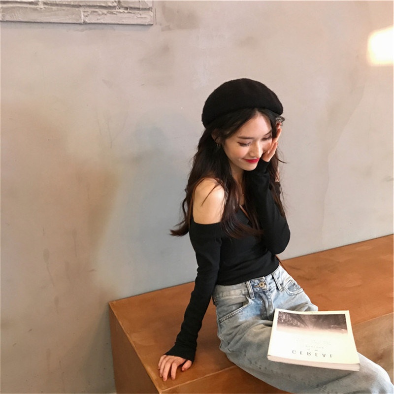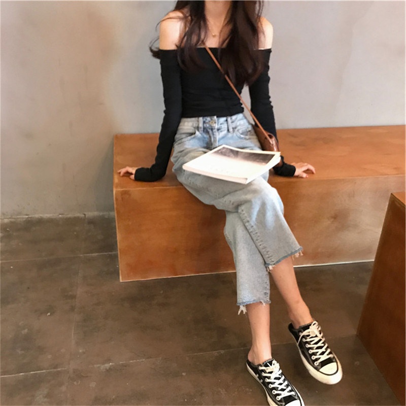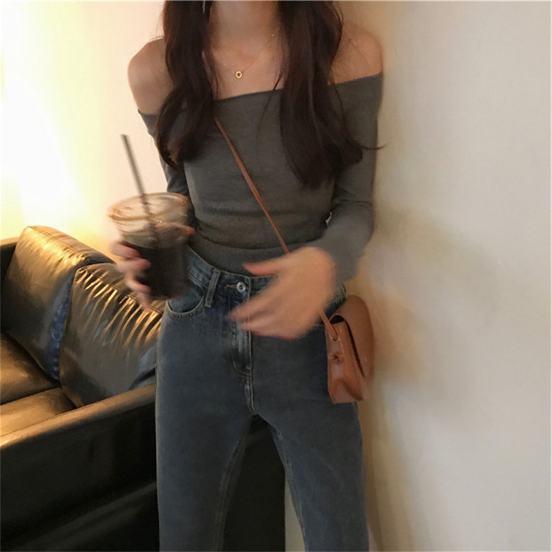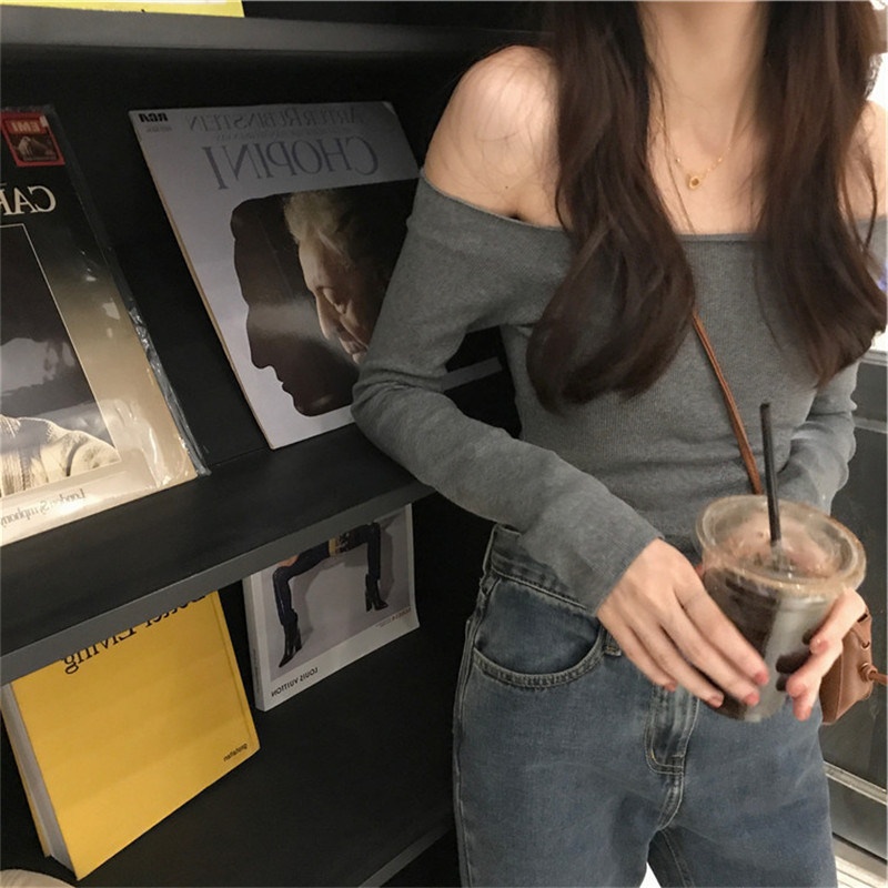 4269#一字肩上衣女夏季2022新款设计感小众短款T恤辣妹长袖打底衫