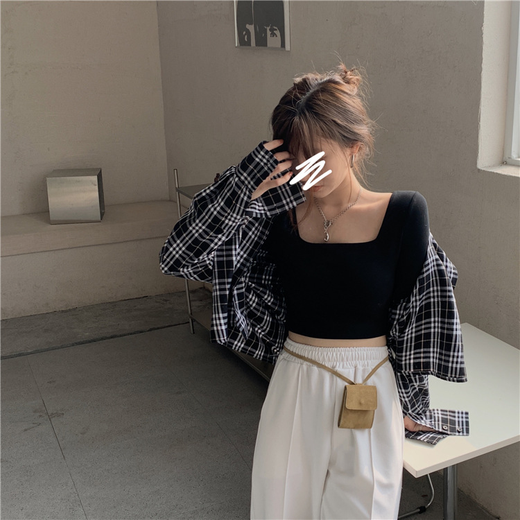 韩版网红辣妹穿搭上衣马甲纯欲气质小个子拼接棋盘针织背心上衣女