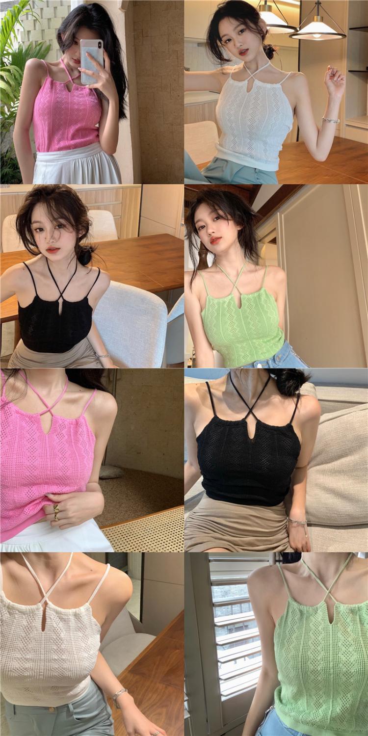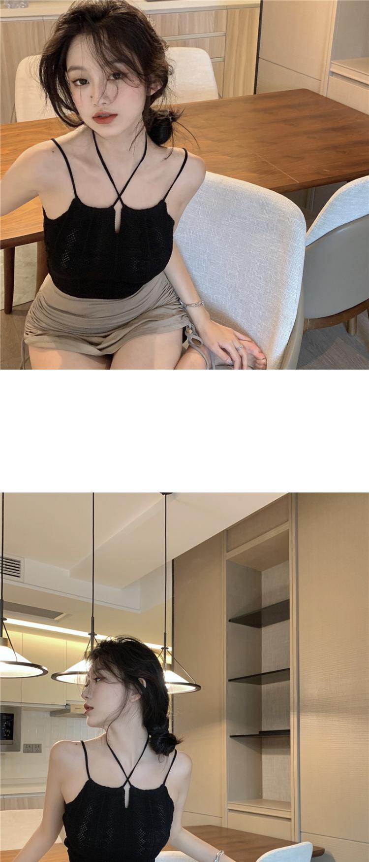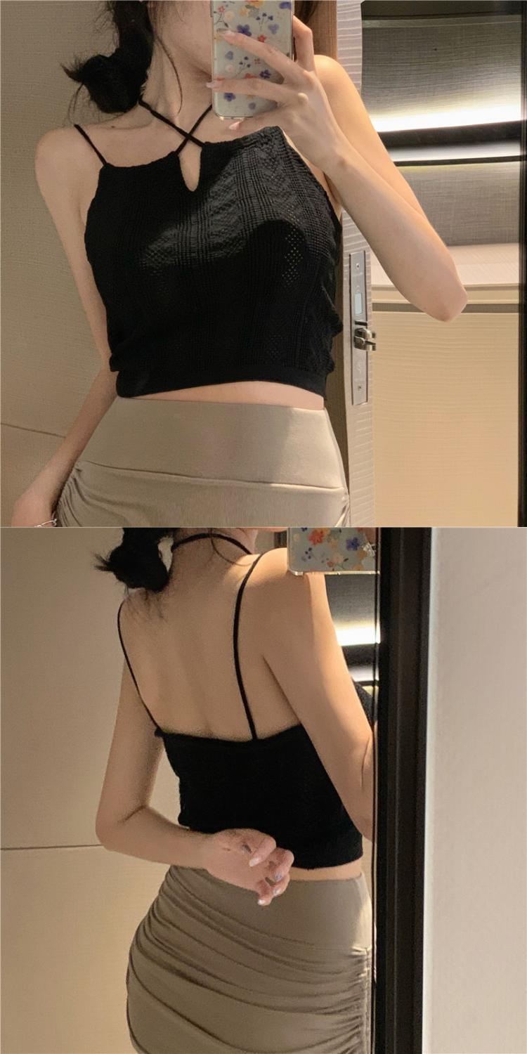 夏季短款纯色法式针织薄款挂脖吊带性感辣妹外穿露背加工定制上衣