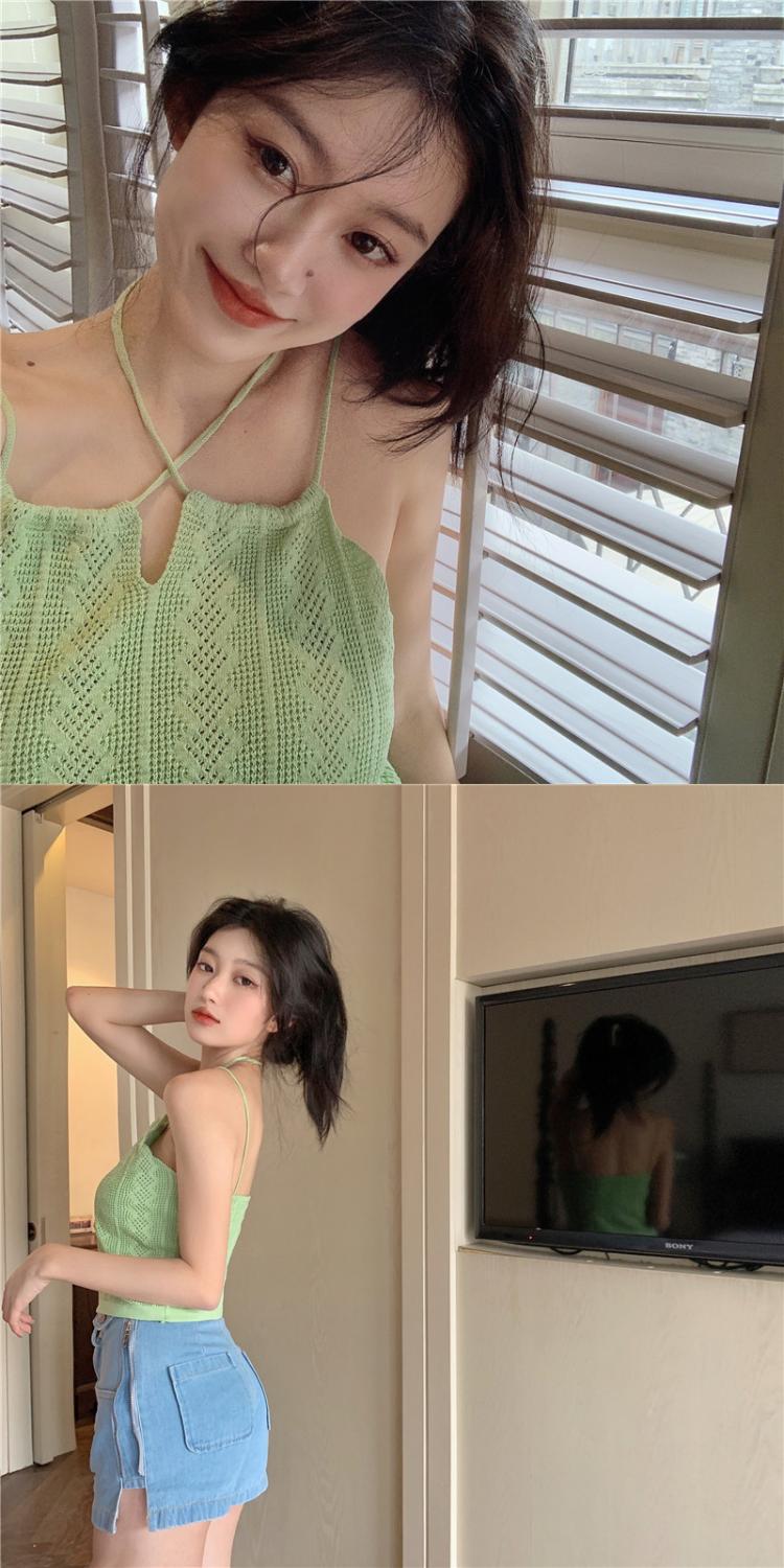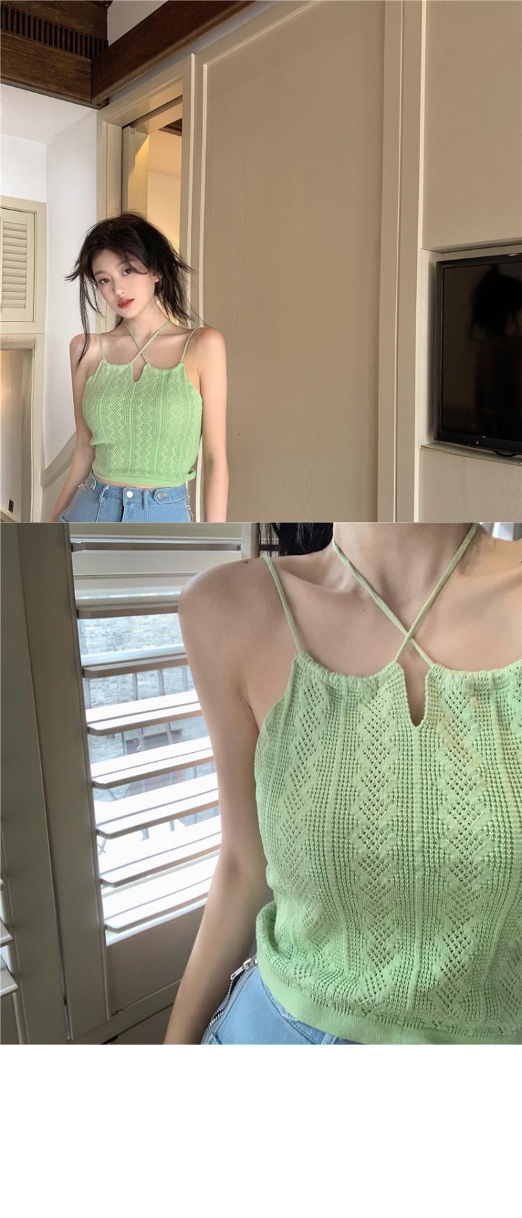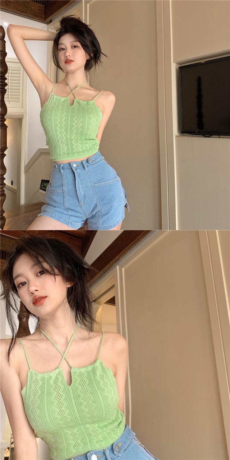 夏季短款纯色法式针织薄款挂脖吊带性感辣妹外穿露背加工定制上衣