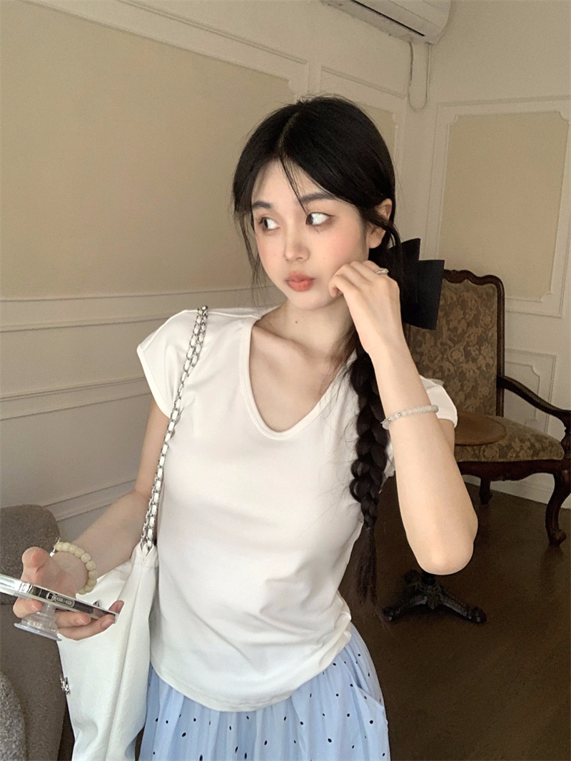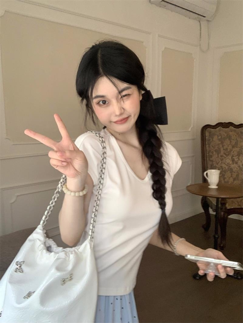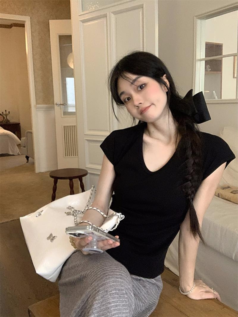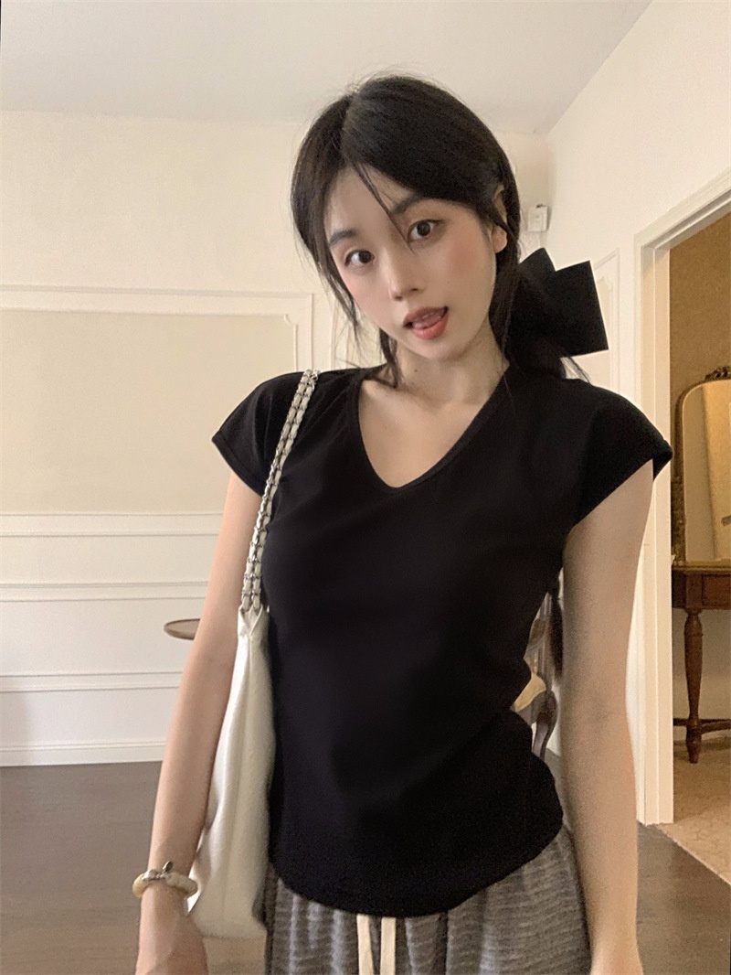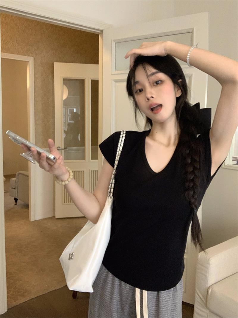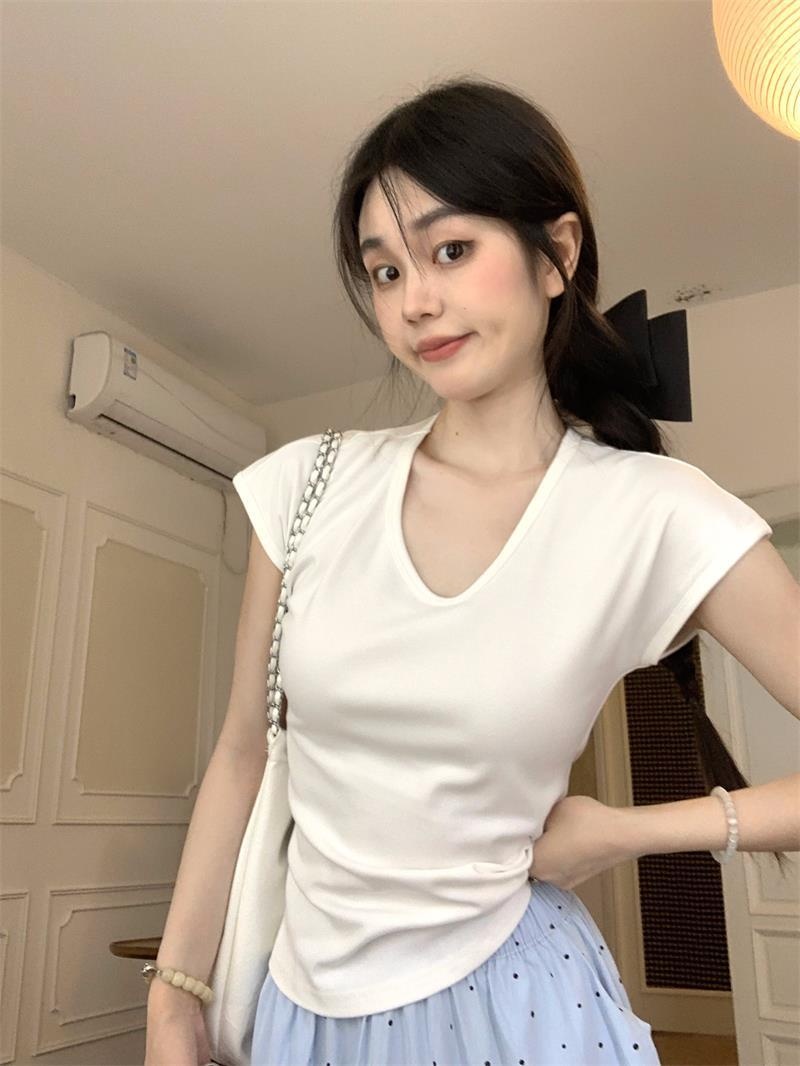 设计感V领短袖T恤女装2025夏季新款不规则短款学生修身上衣ins潮