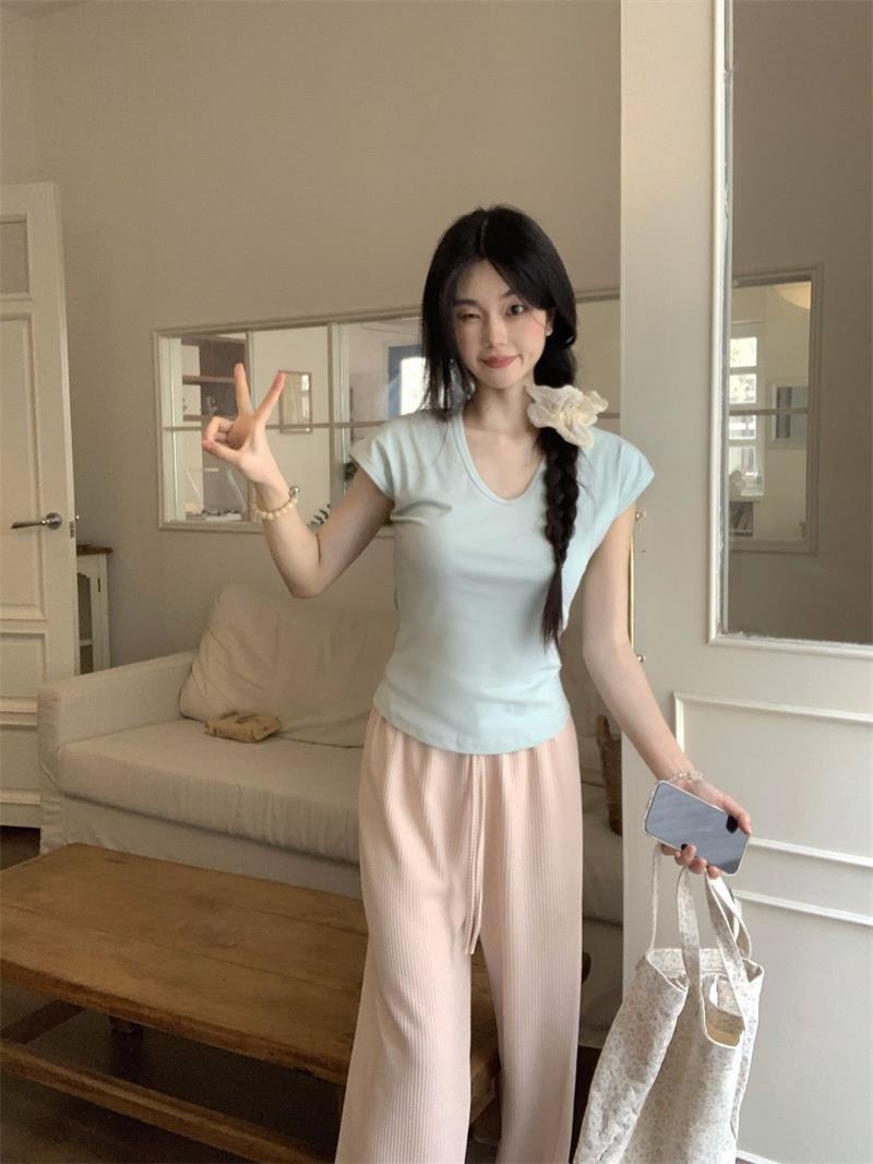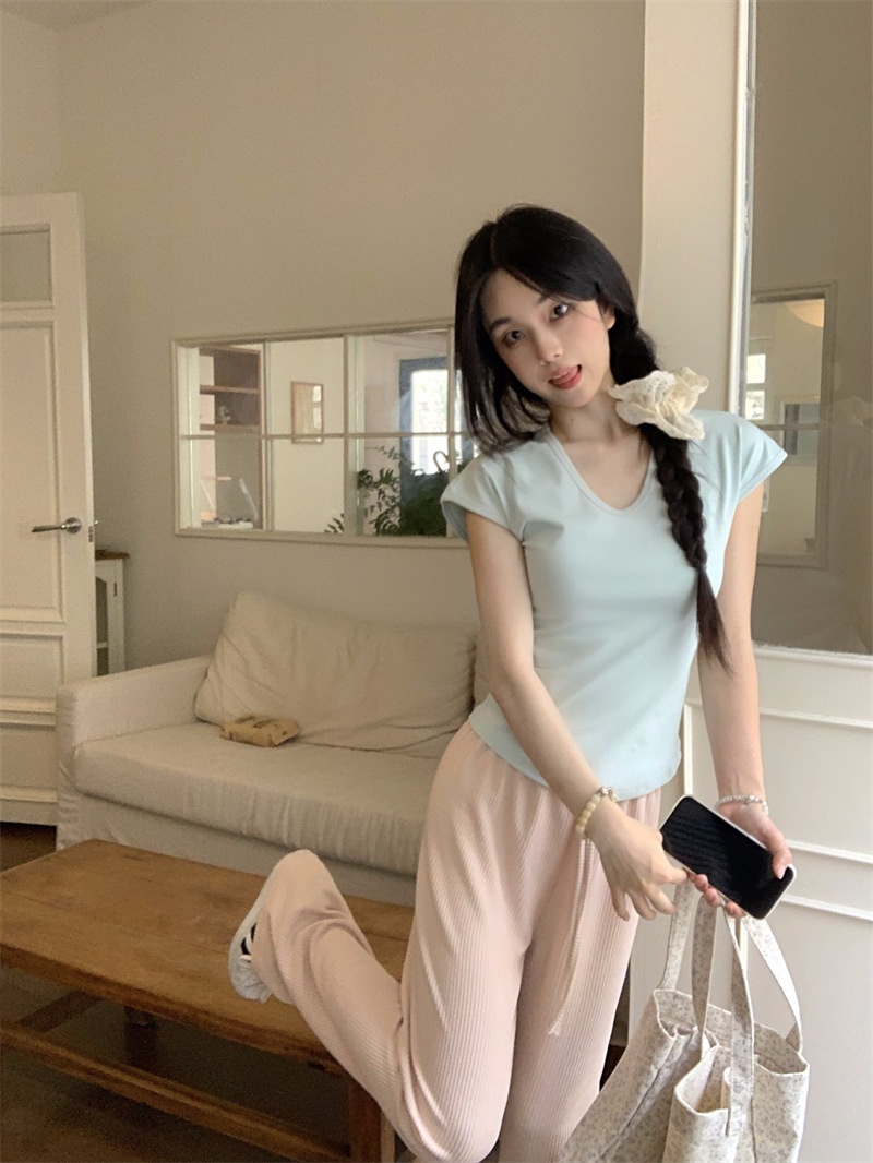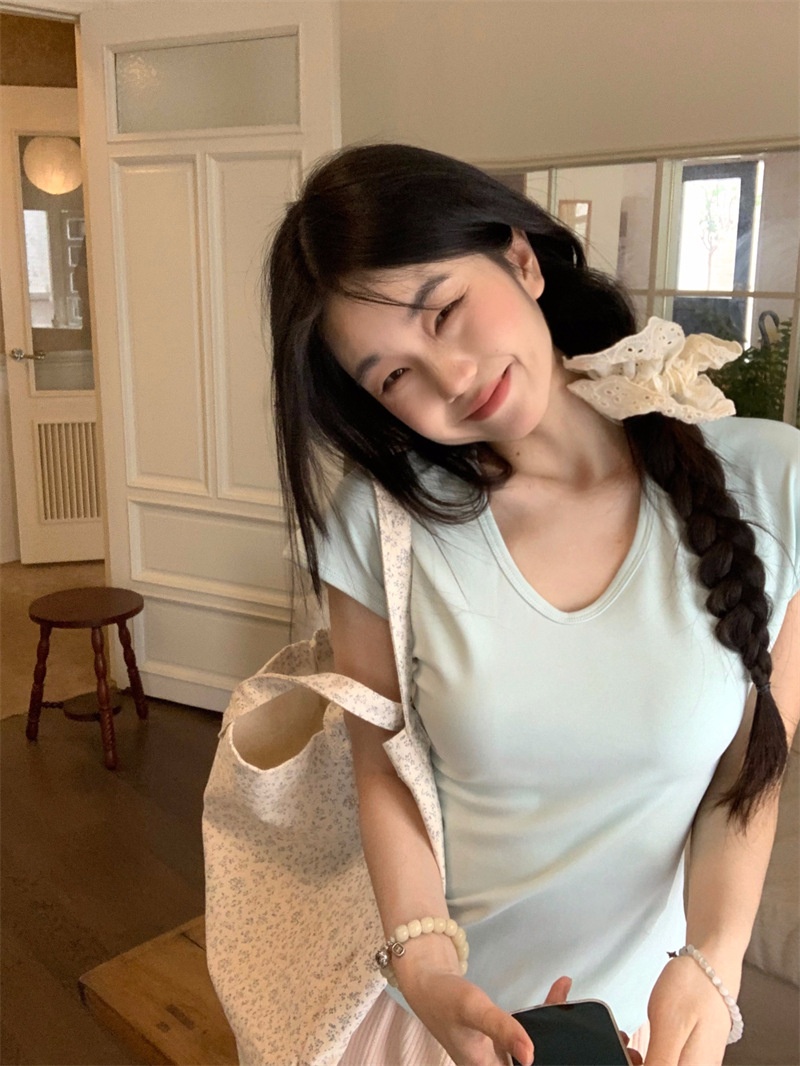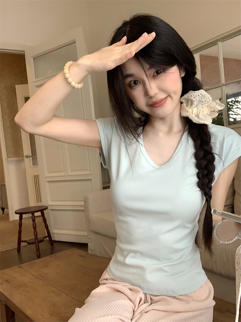 设计感V领薄荷绿T恤女夏季褶皱别致短袖不规则短款白色上衣ins潮