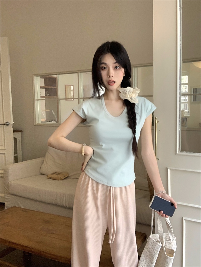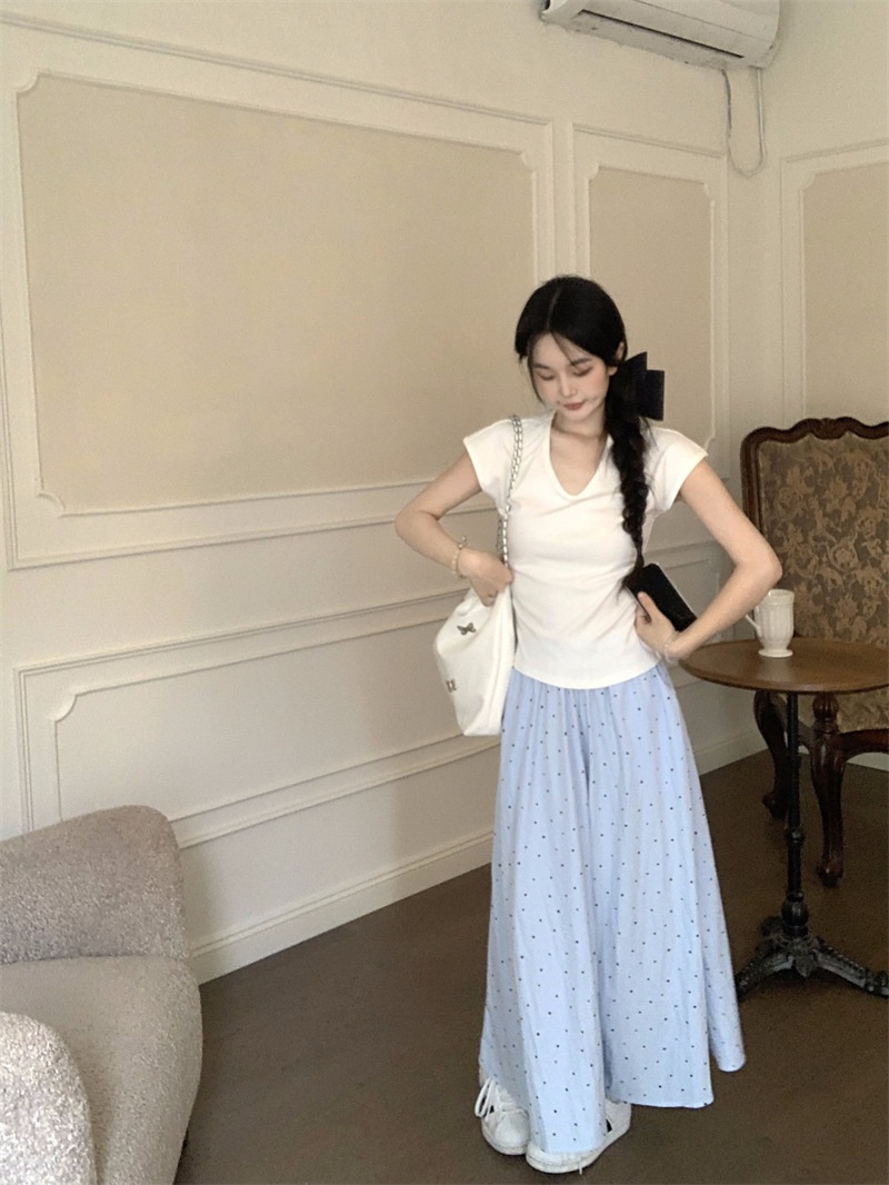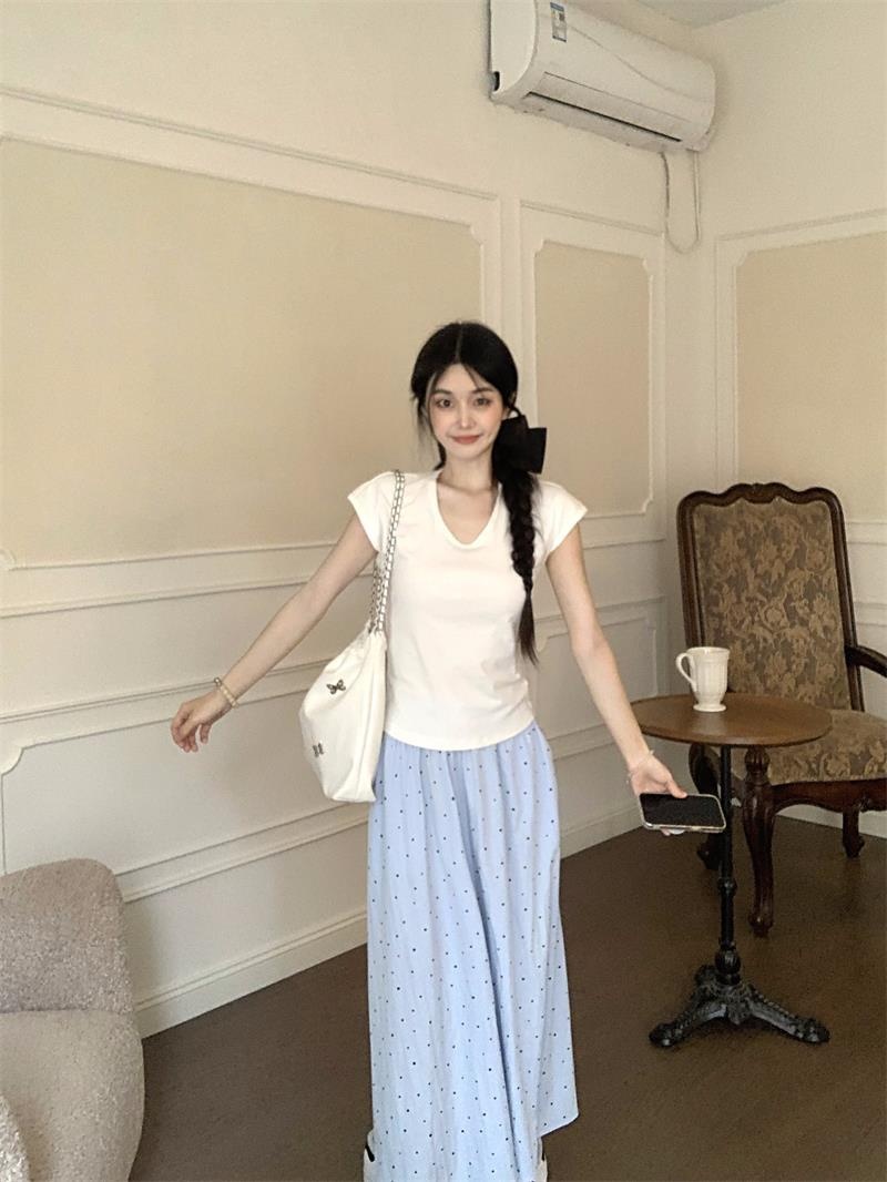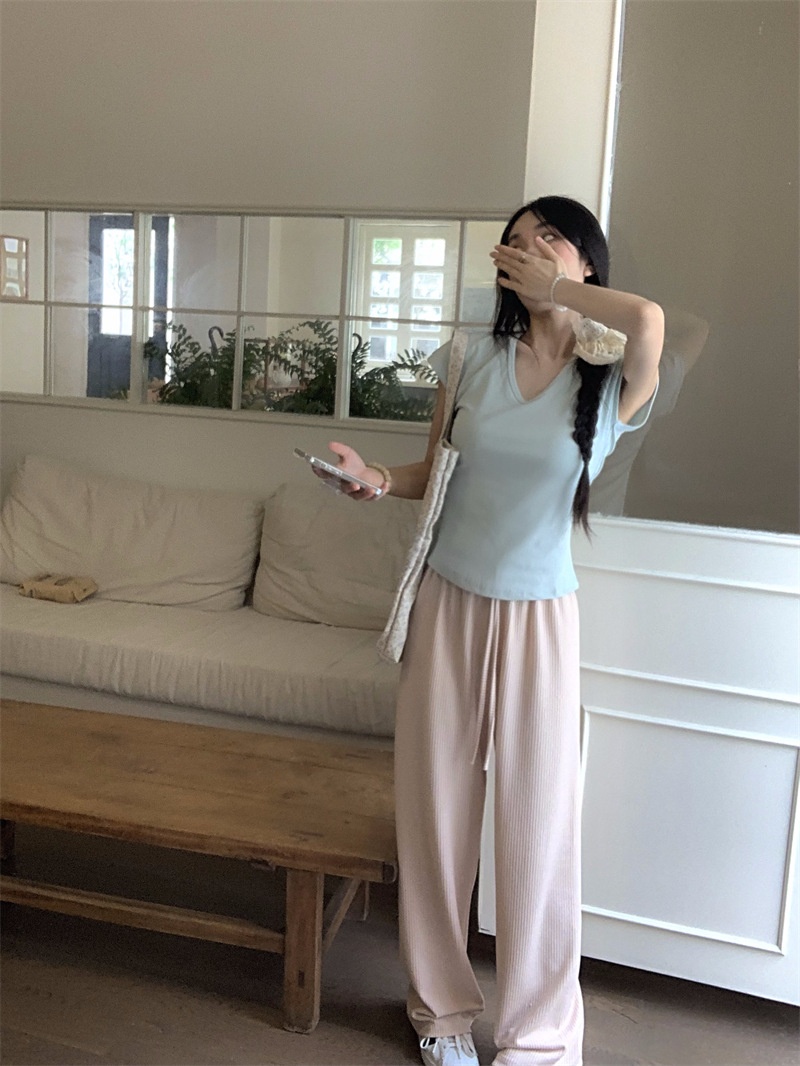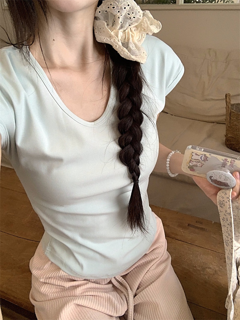 设计感V领薄荷绿T恤女夏季褶皱别致短袖不规则短款白色上衣ins潮