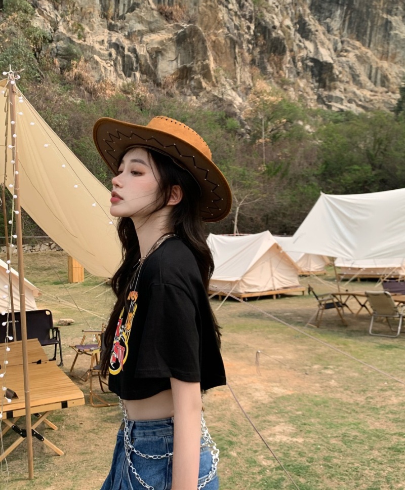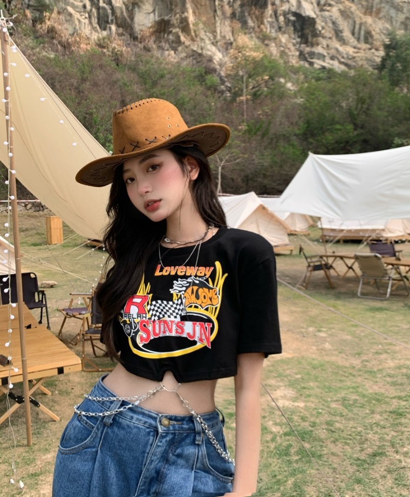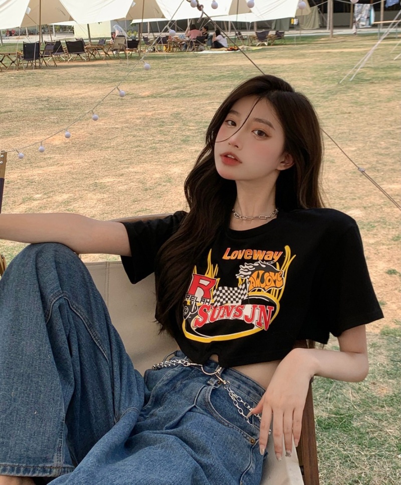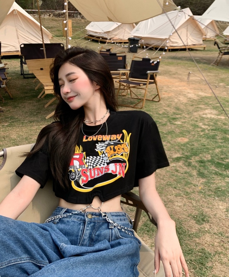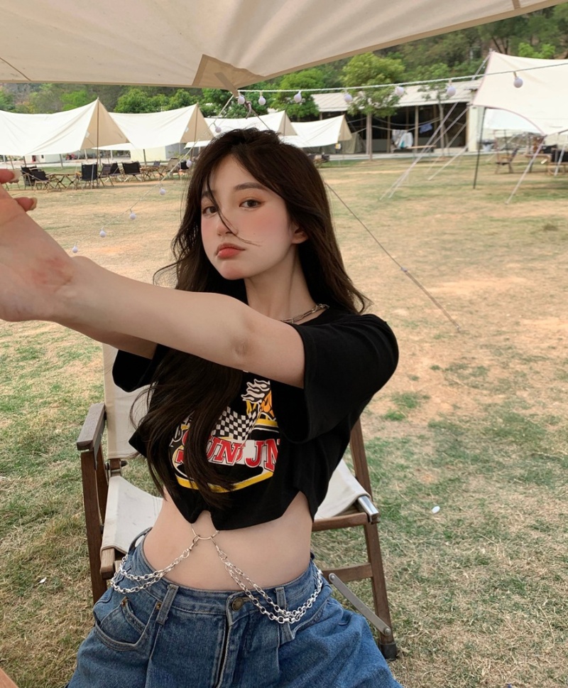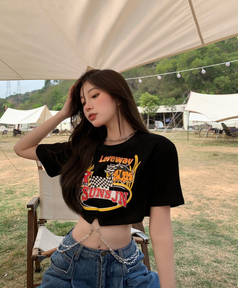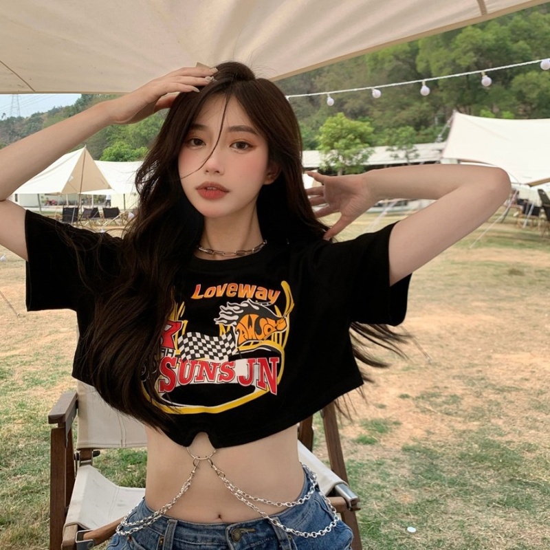 2025夏季新款辣妹百搭ins潮T恤女设计感链条短款露脐黑色短袖上衣