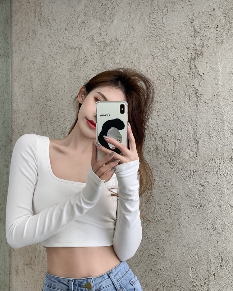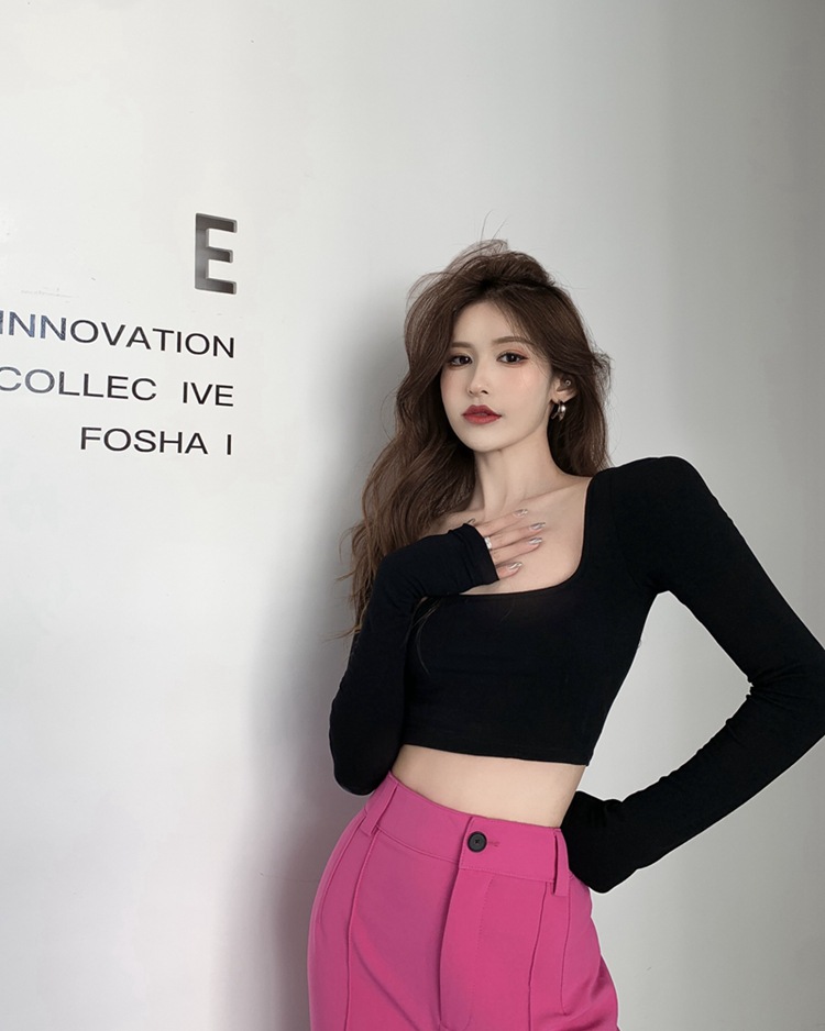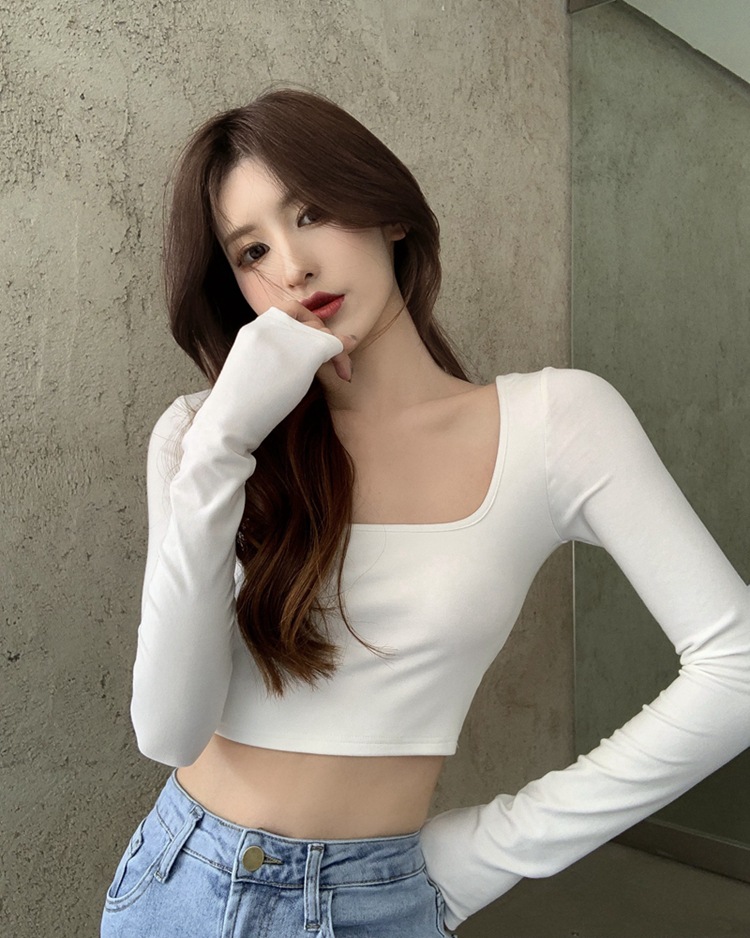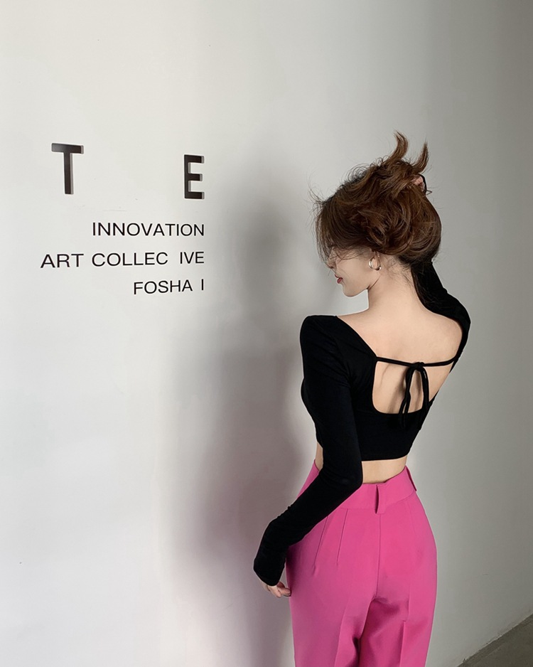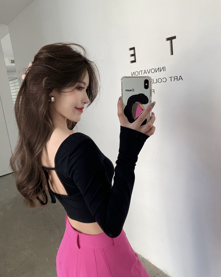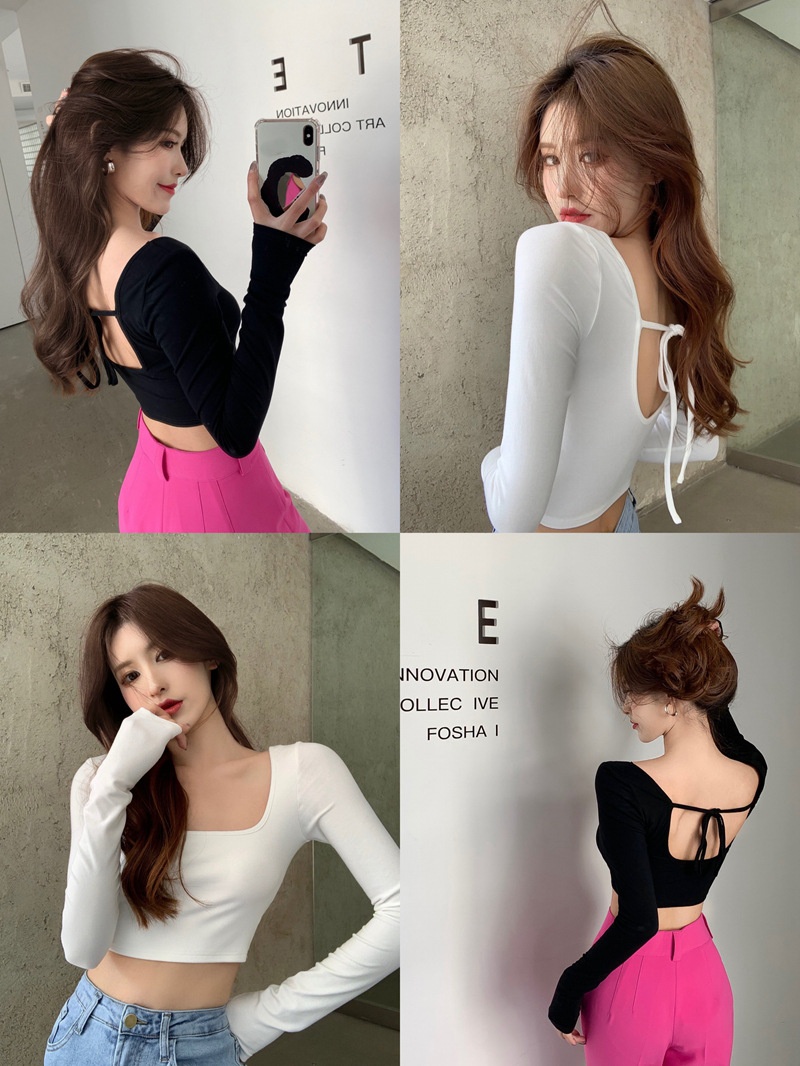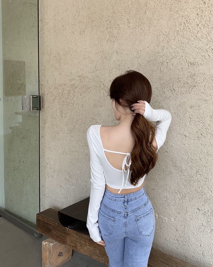 辣妹方领长袖T恤女2025秋季新款白色绑带短款露背修身打底衫上衣