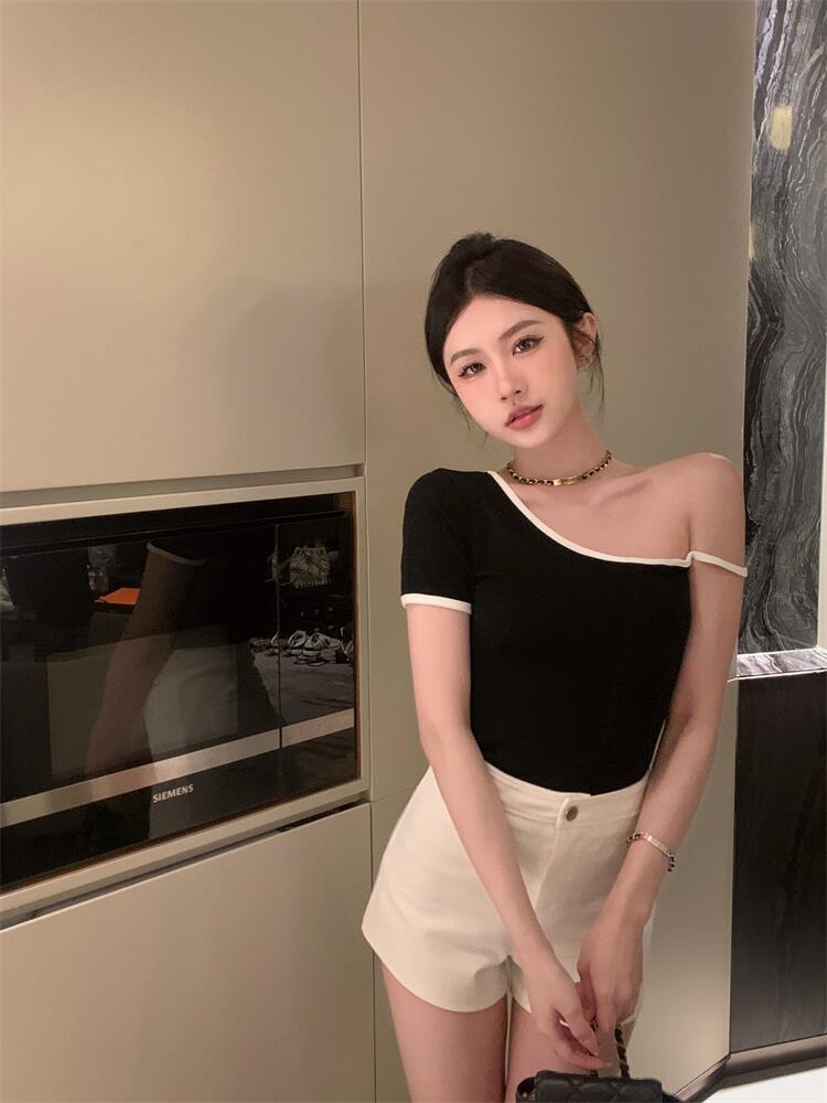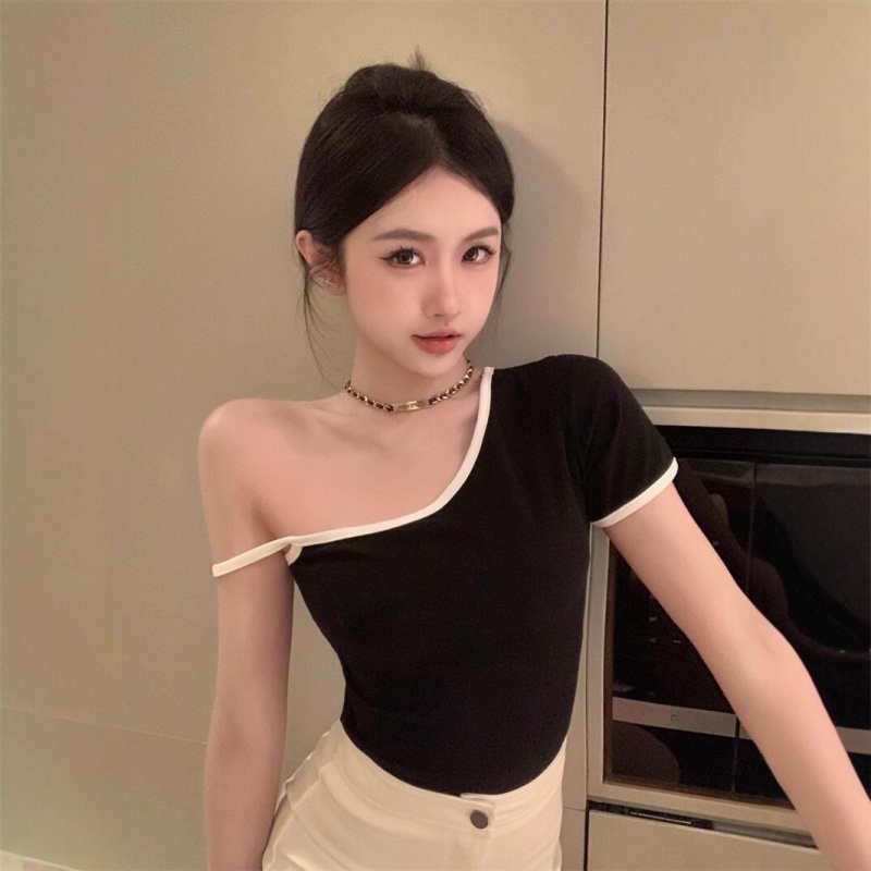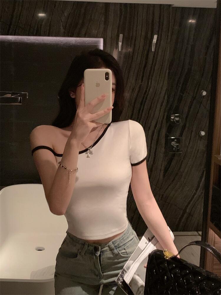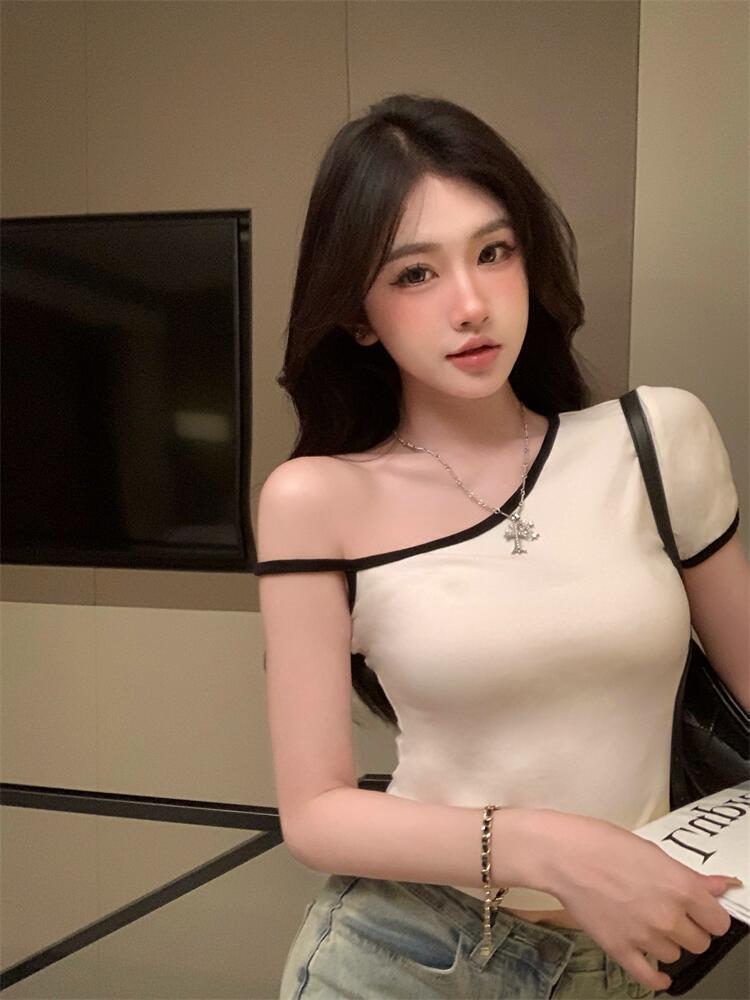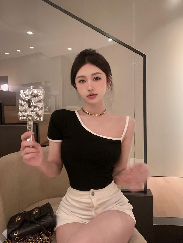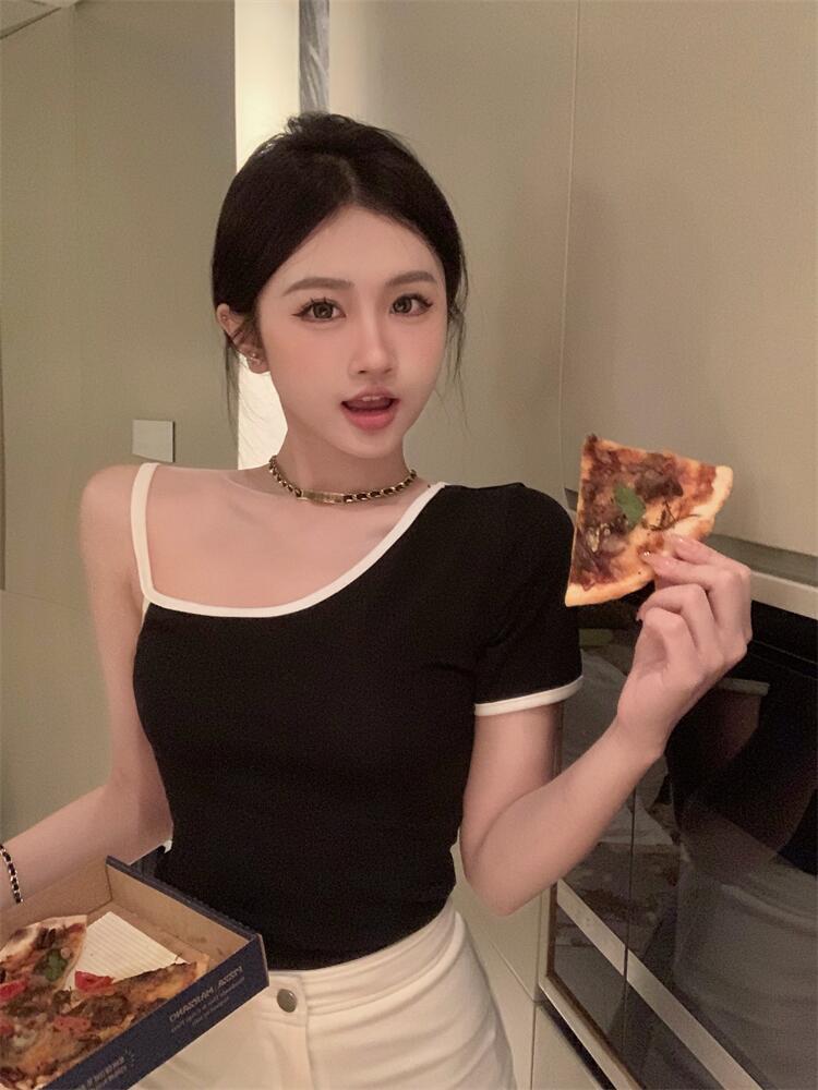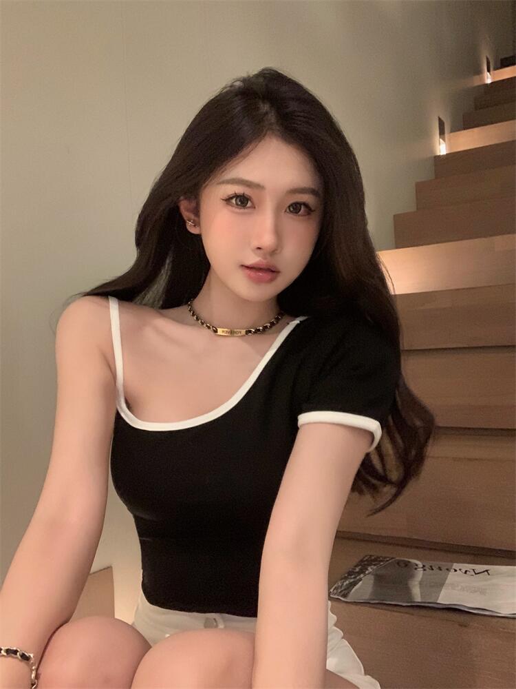 黑色辣妹吊带半袖T恤女2025夏季设计感独特别致修身露背短款上衣