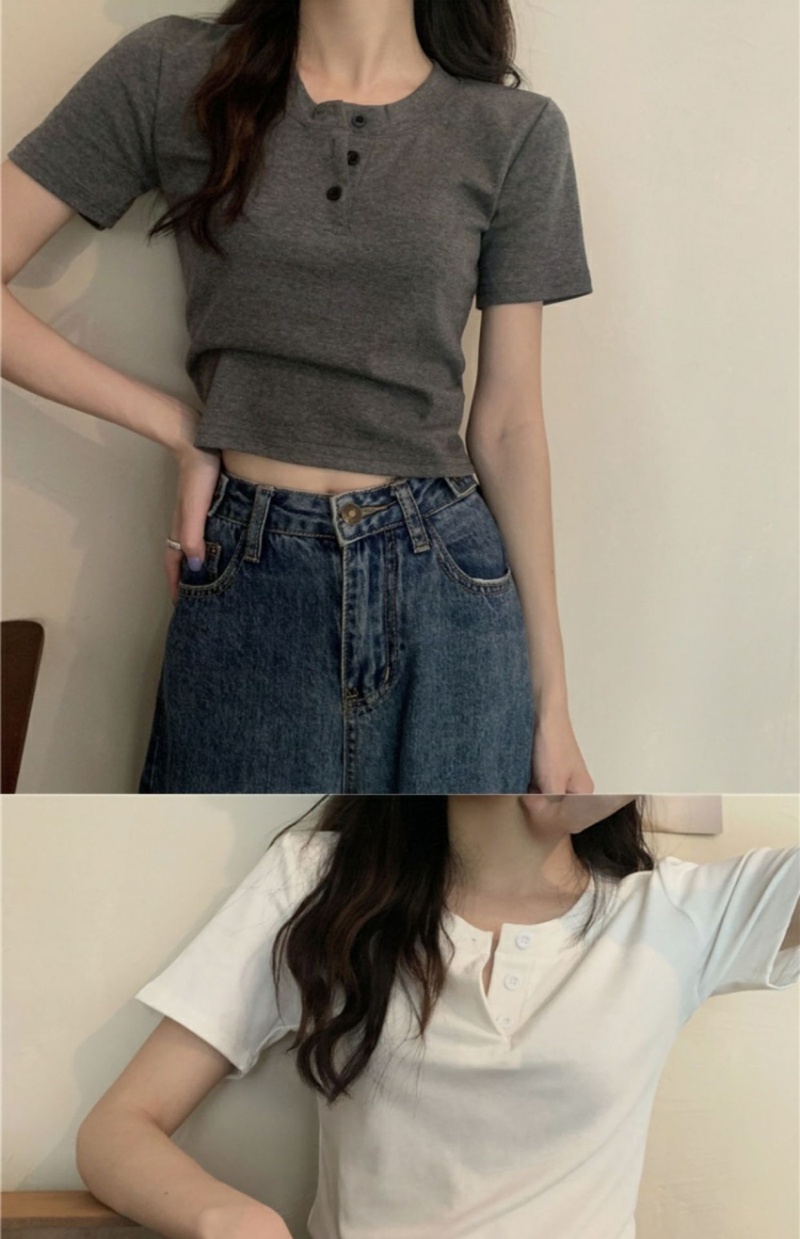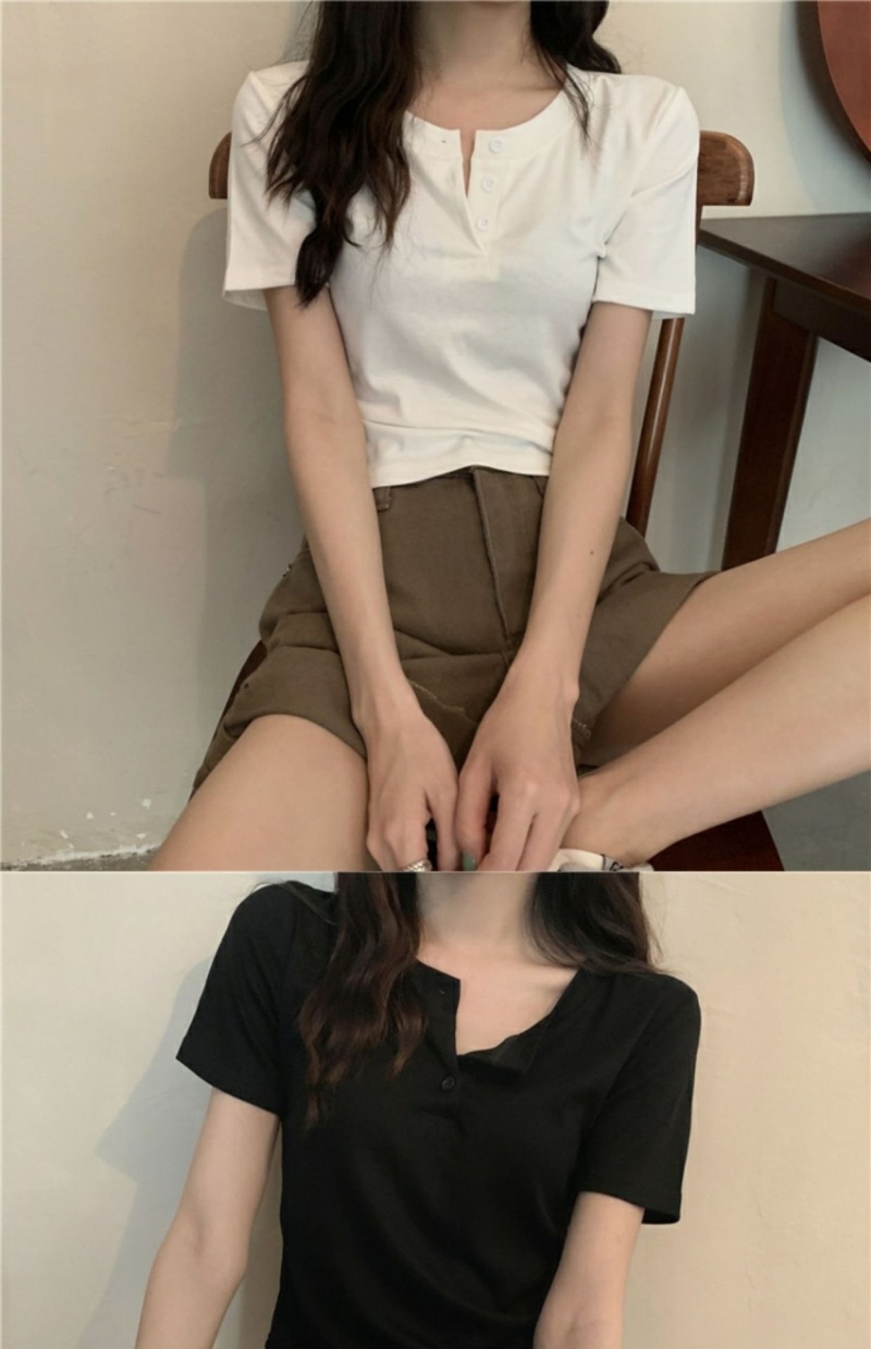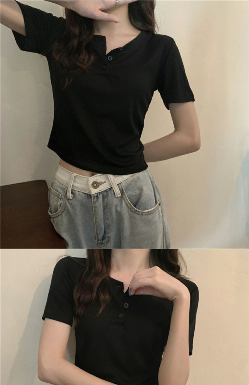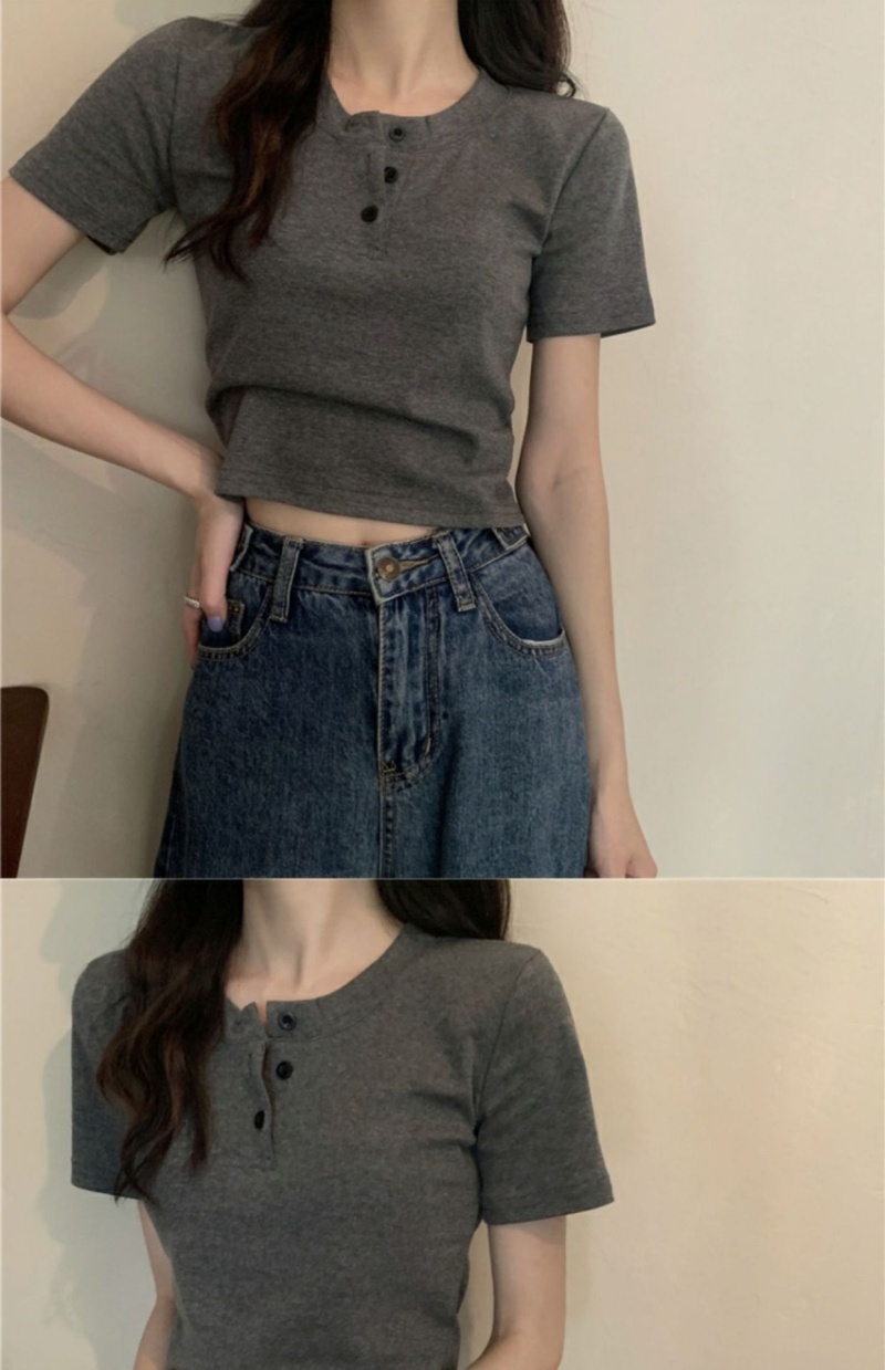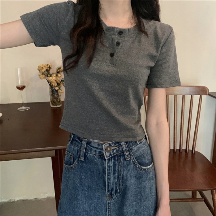 409#6535 超火设计感小众纽扣短袖T恤短款高腰修身甜酷上衣服