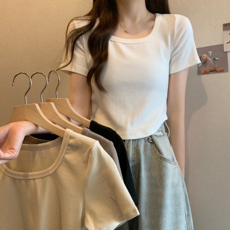 设计感修身显瘦弧形下摆短款上衣女2025夏季螺纹打底衫短袖t恤女
