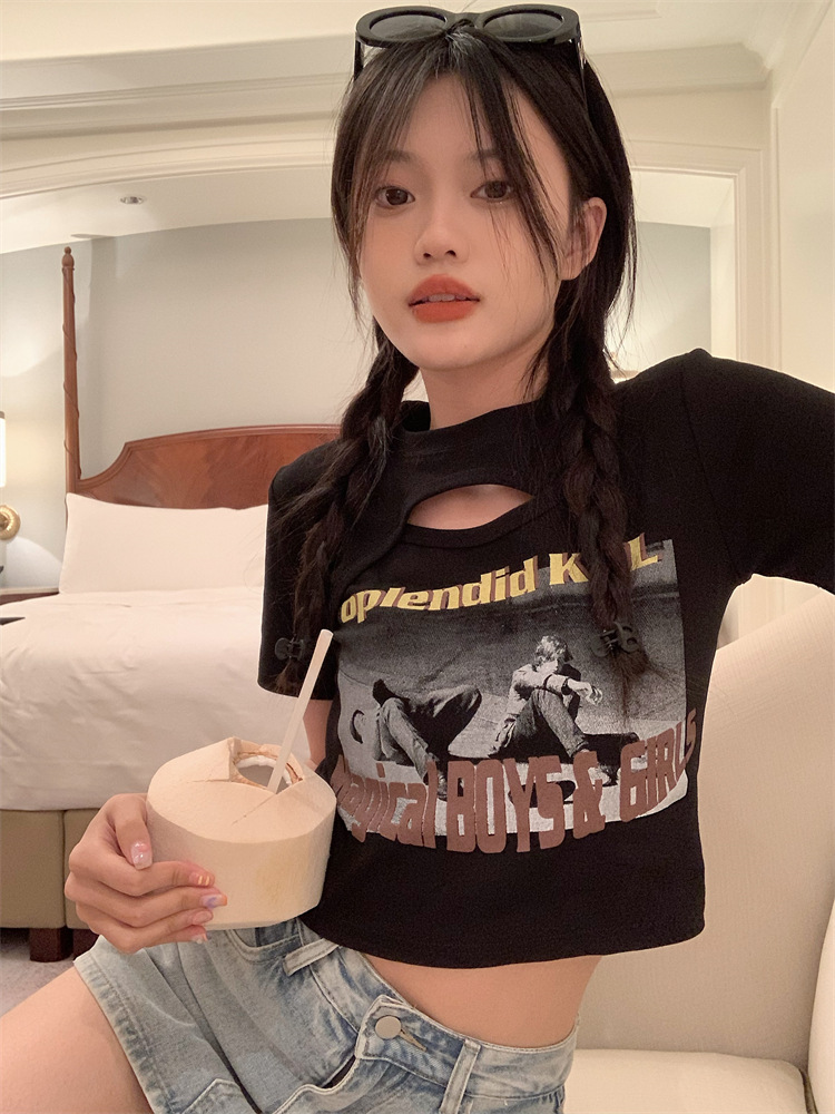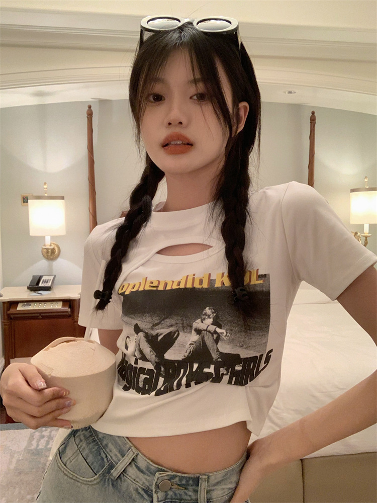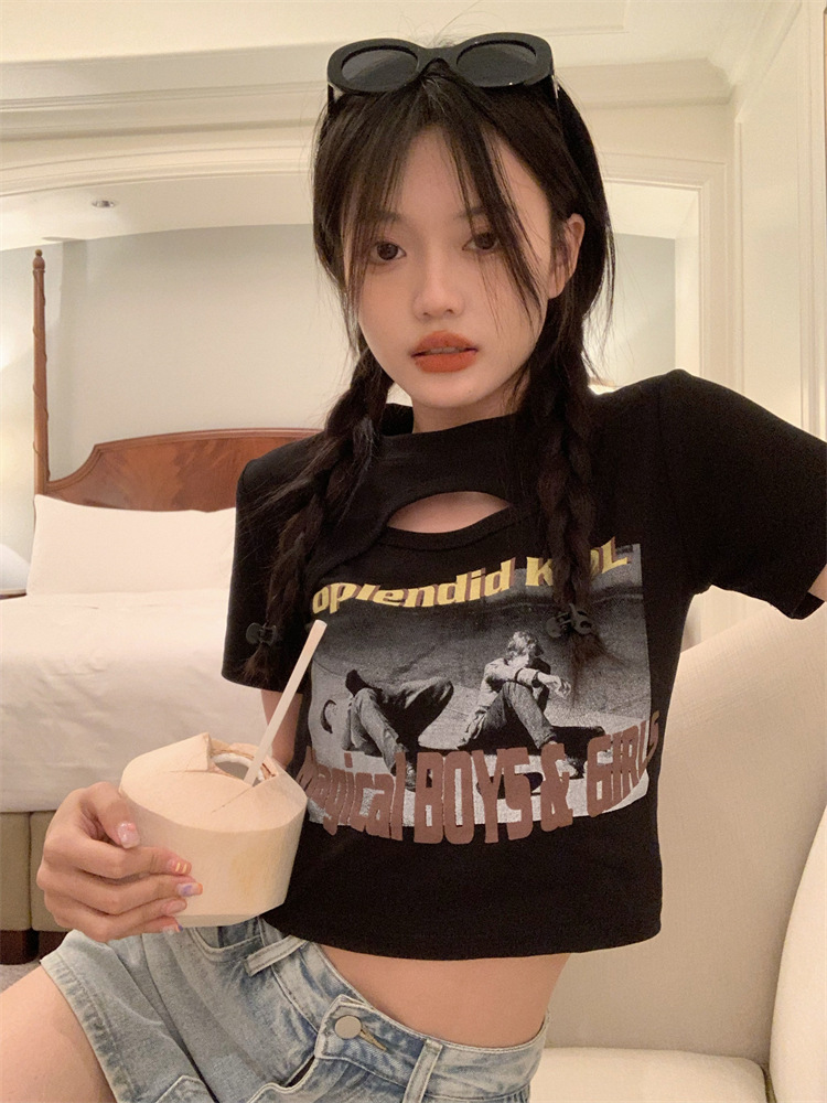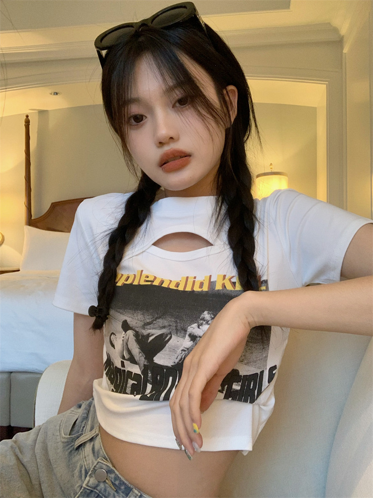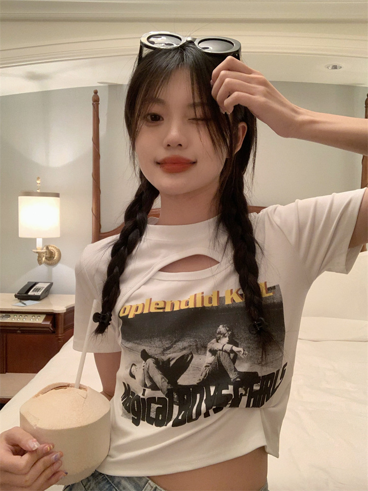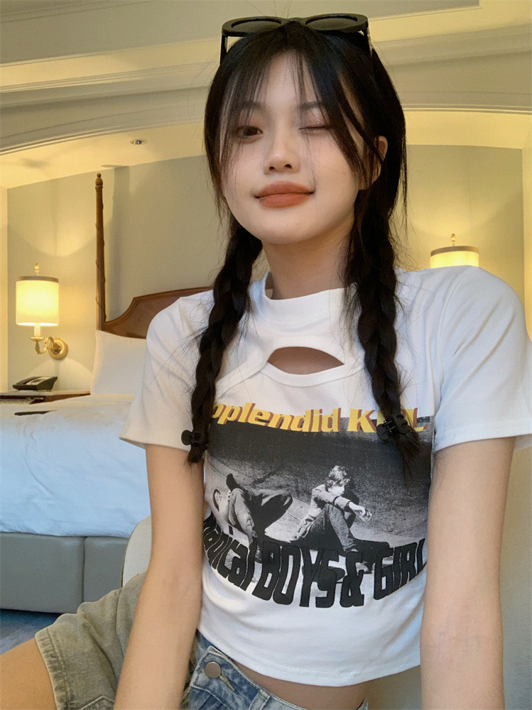 PPHOME休闲学妹~短袖T恤夏季复古美式镂空设计印花修身BM短款上衣