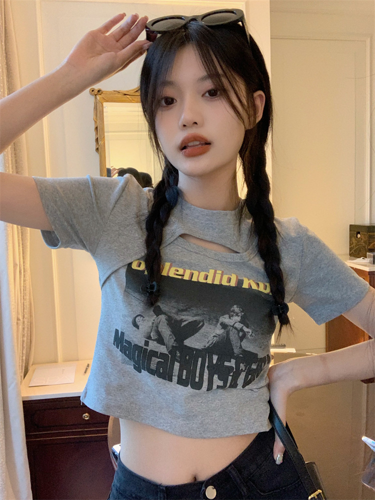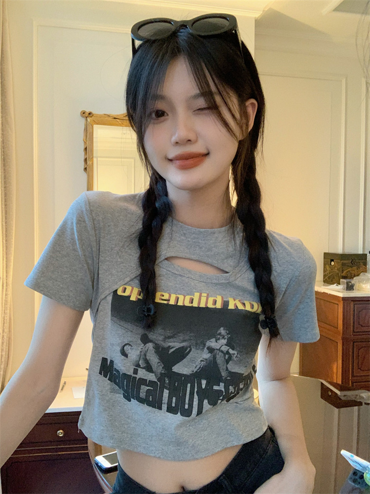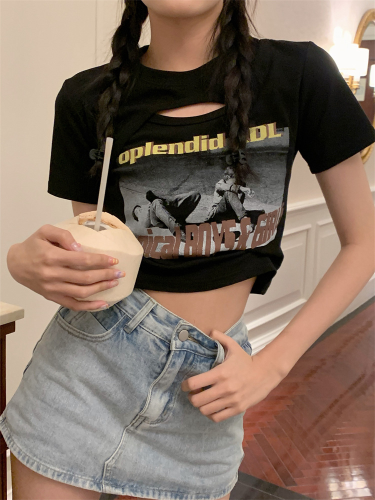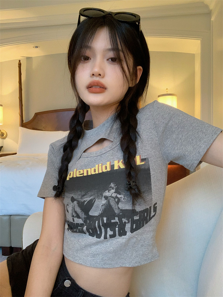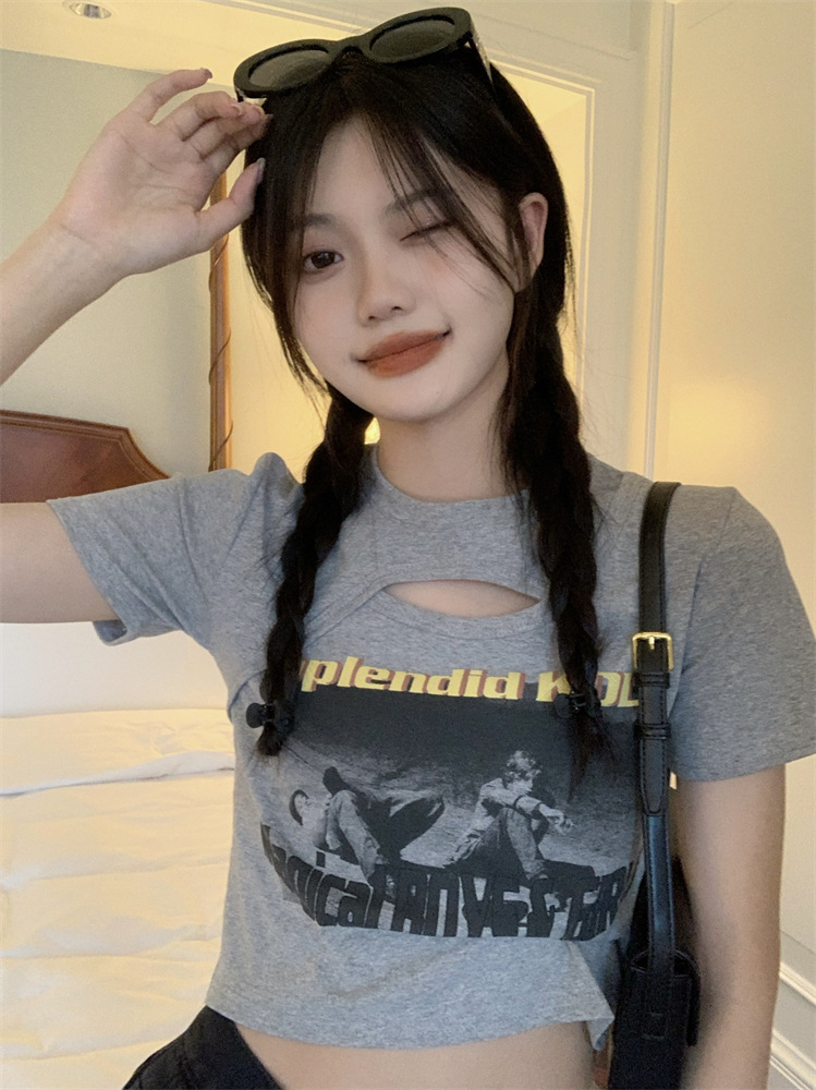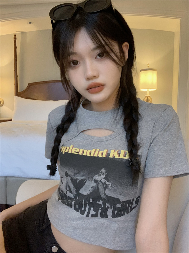 PPHOME休闲学妹~短袖T恤夏季复古美式镂空设计印花修身BM短款上衣