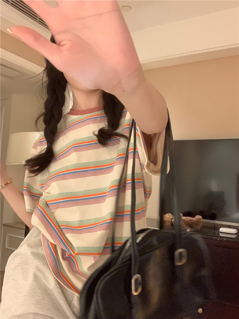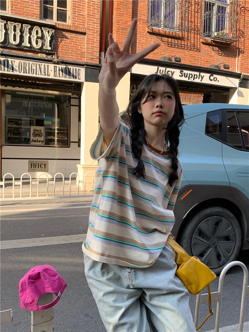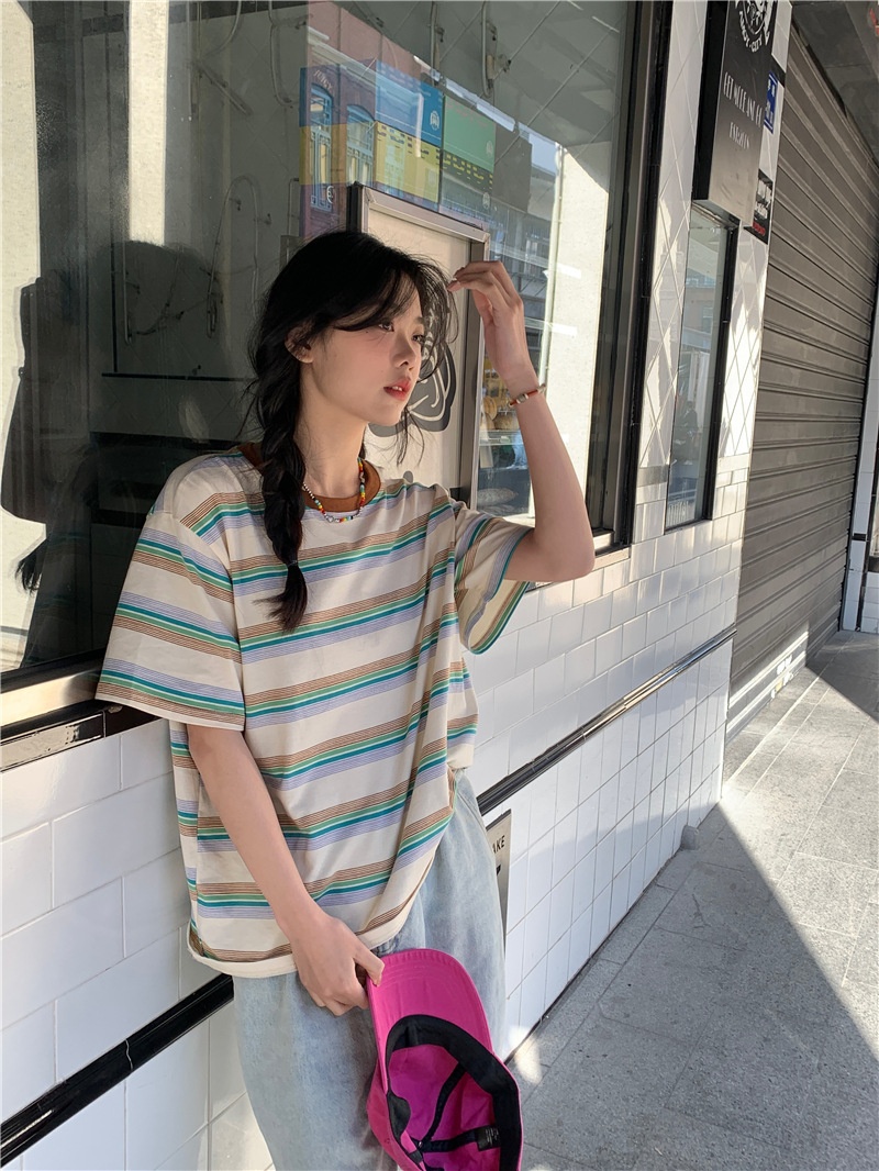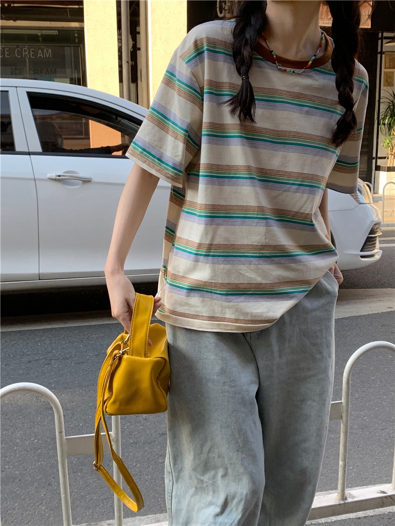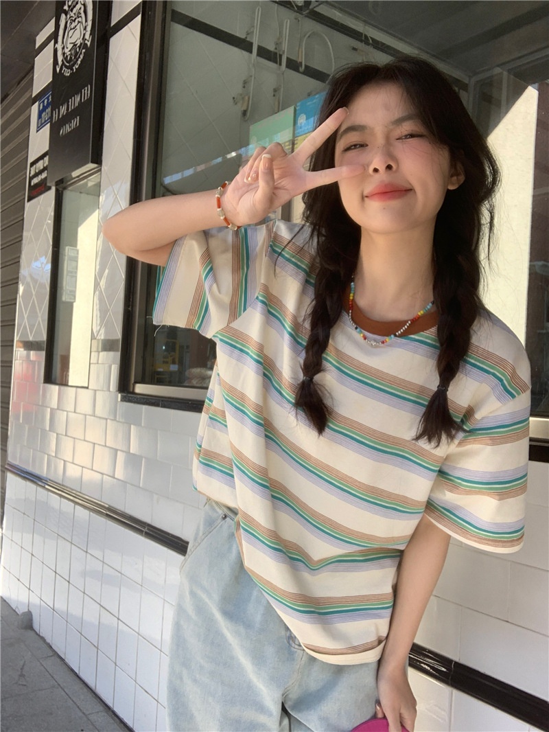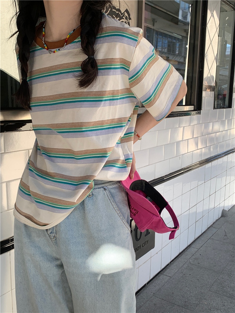 复古条纹圆领短袖t恤新款2025年女装夏季韩版宽松显瘦学生上衣潮