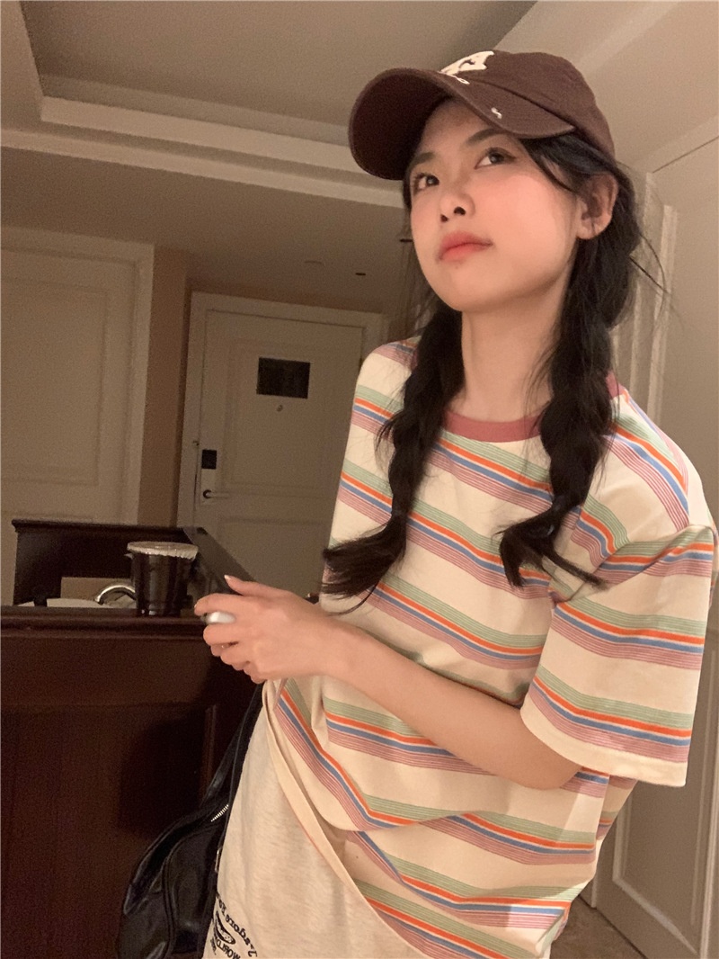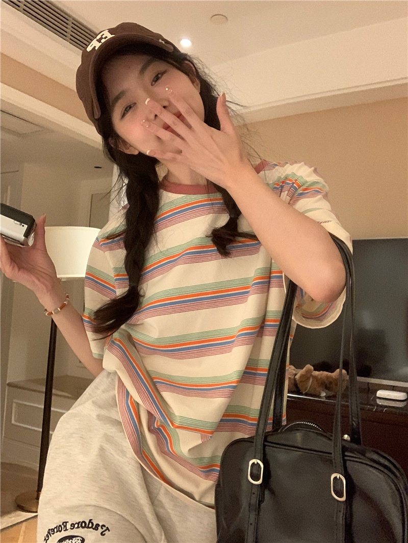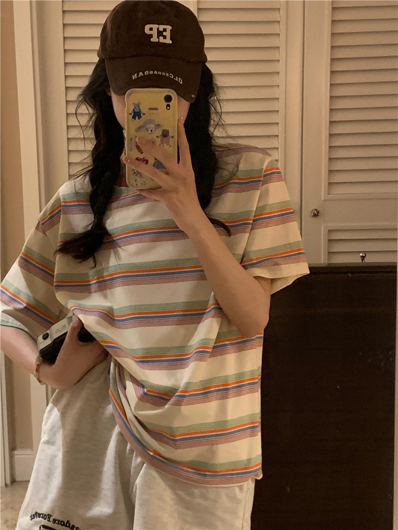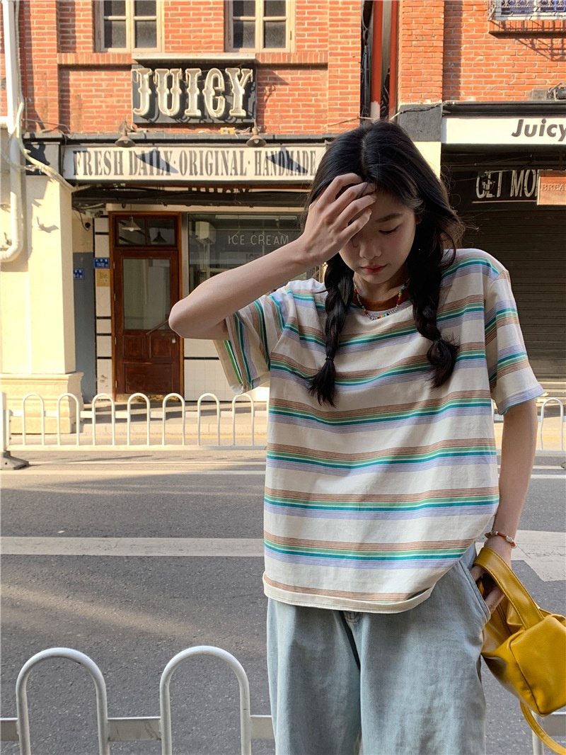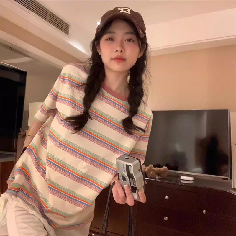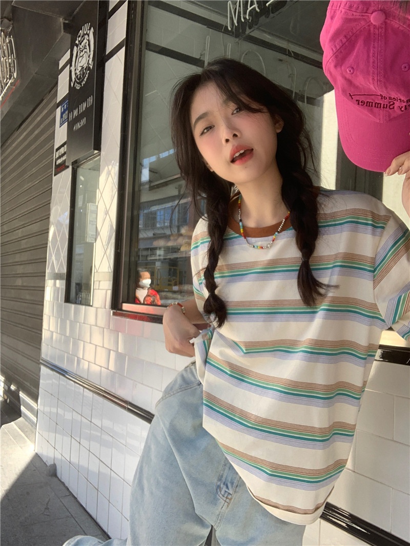 复古条纹圆领短袖t恤新款2025年女装夏季韩版宽松显瘦学生上衣潮