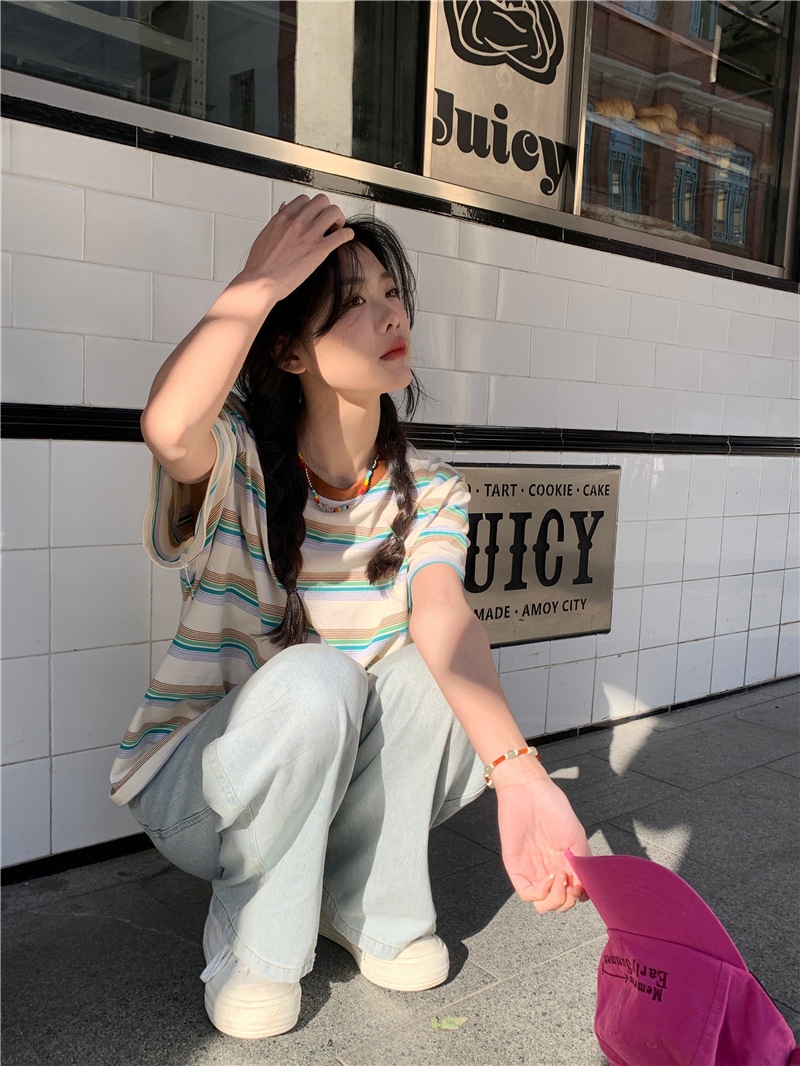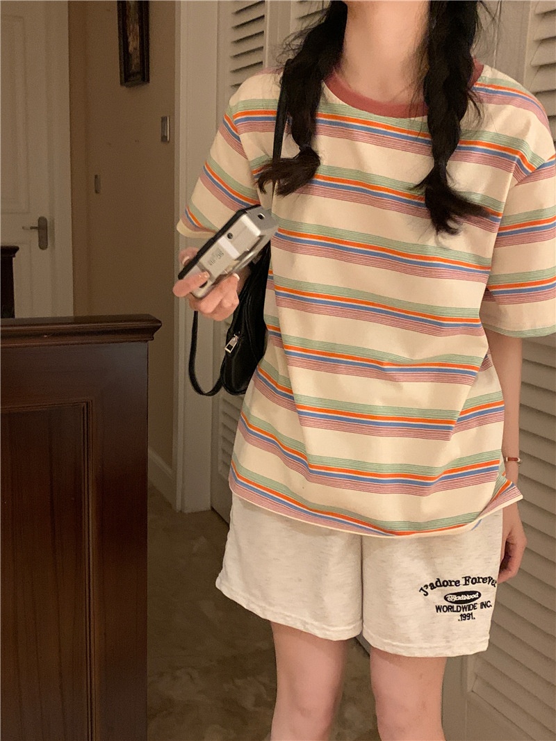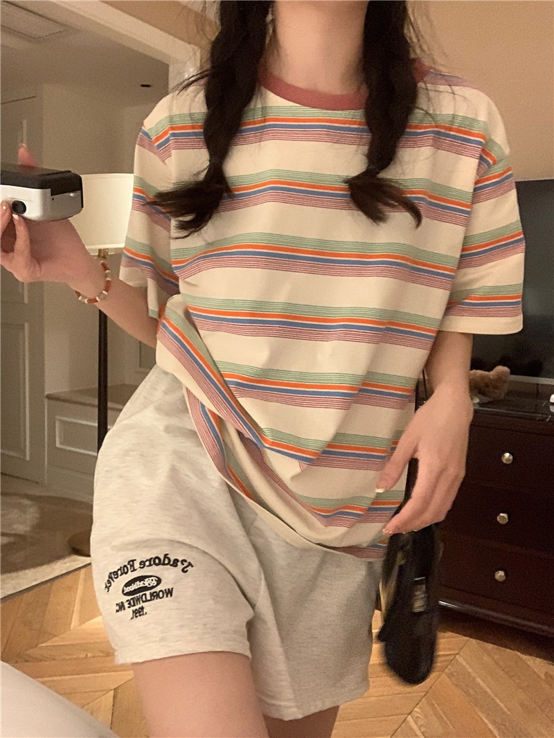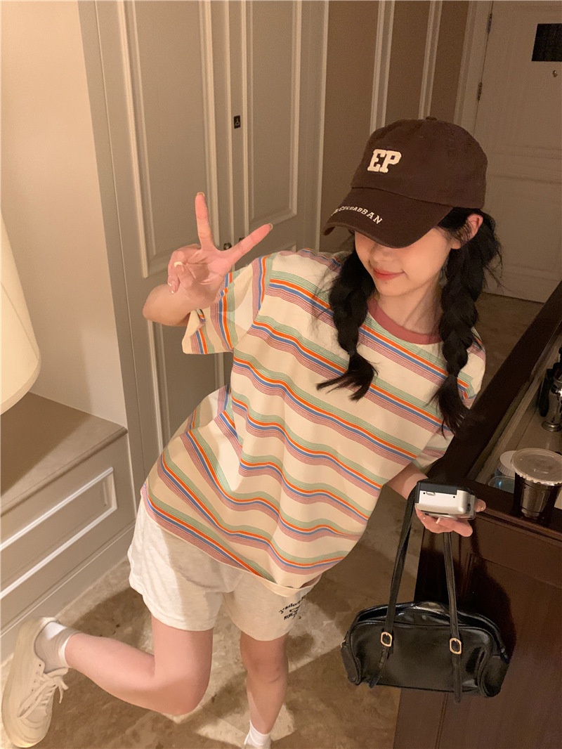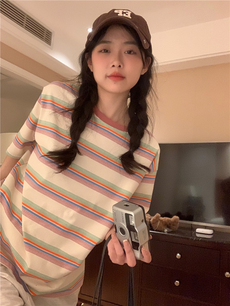 复古条纹圆领短袖t恤新款2025年女装夏季韩版宽松显瘦学生上衣潮