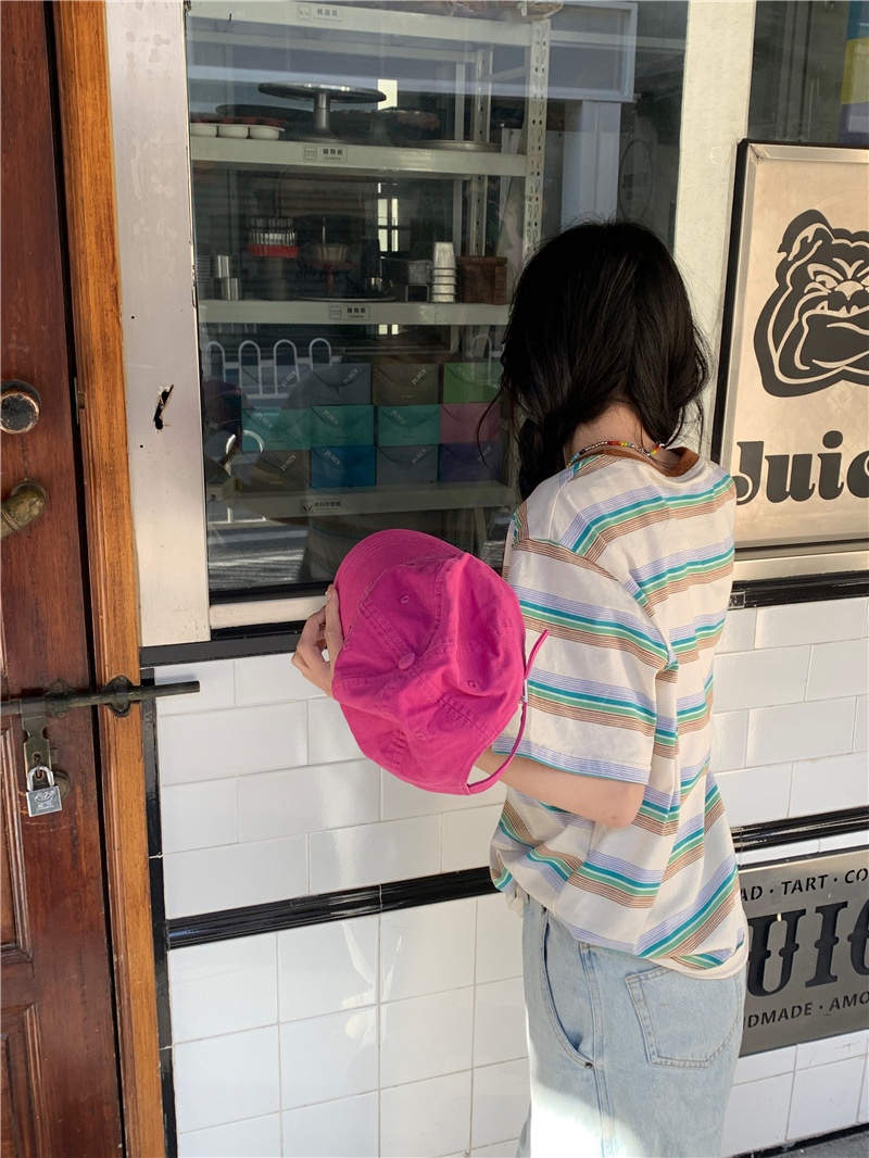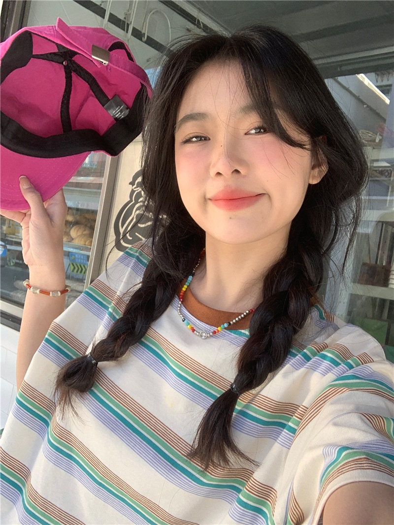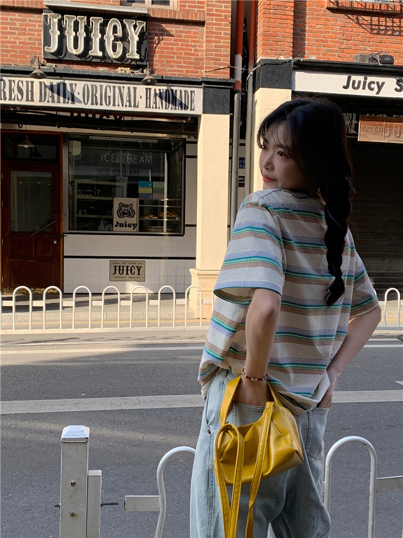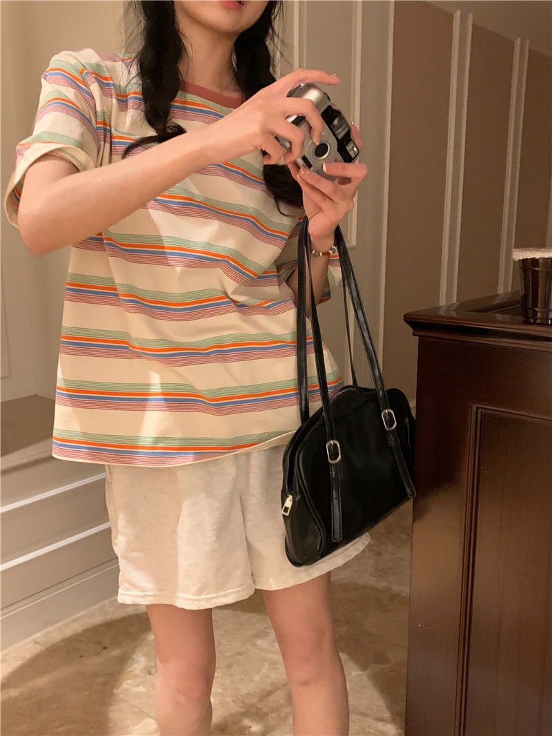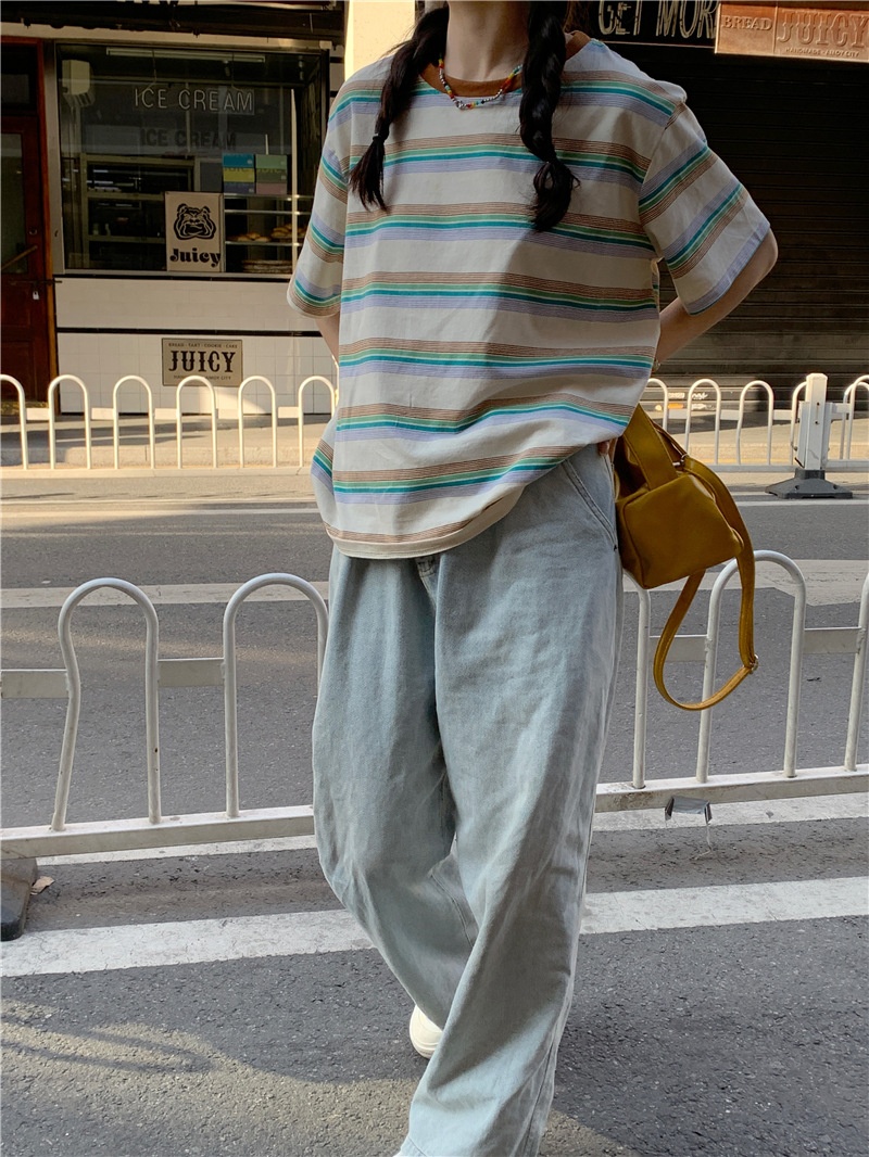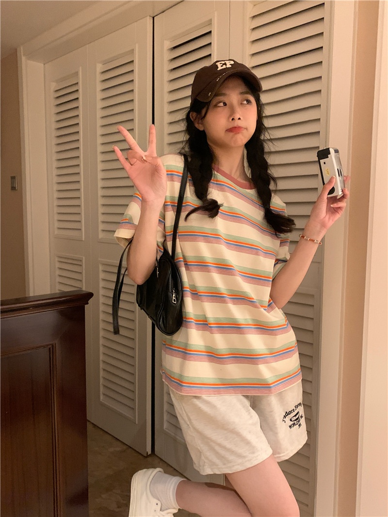 复古条纹圆领短袖t恤新款2025年女装夏季韩版宽松显瘦学生上衣潮