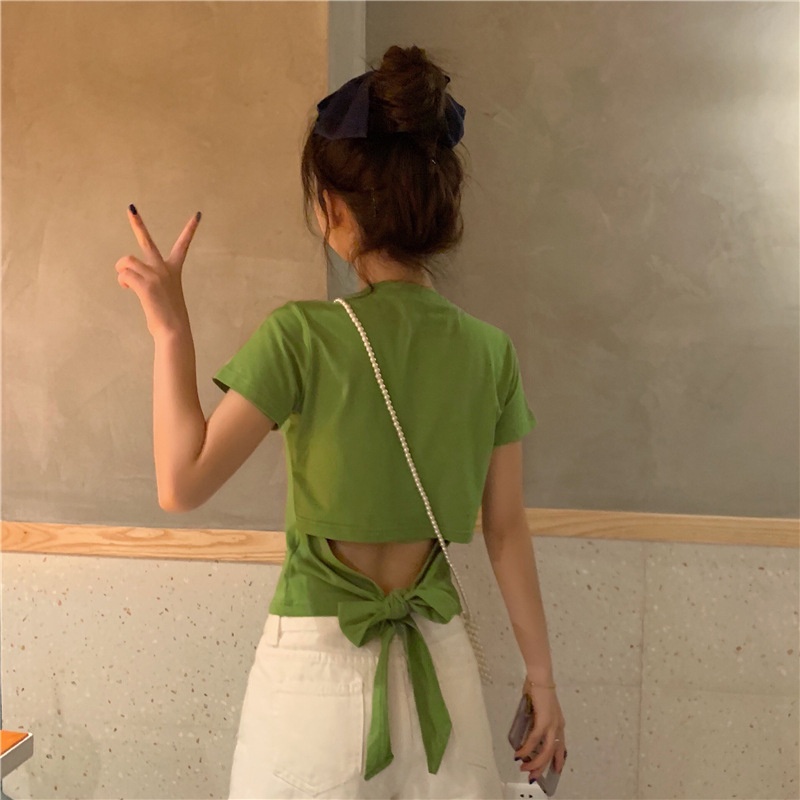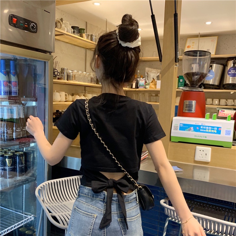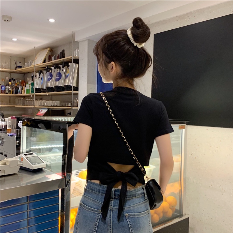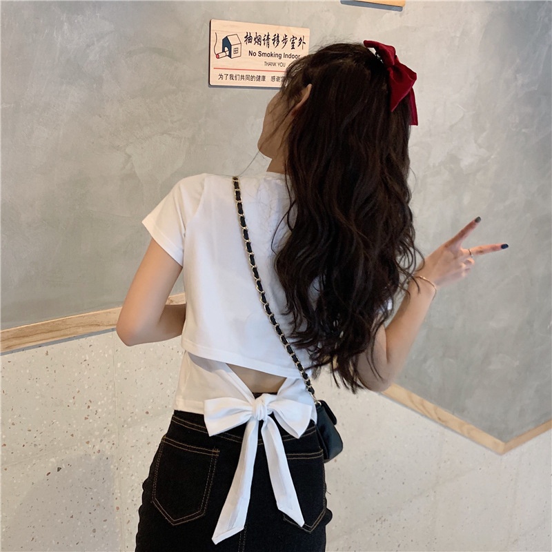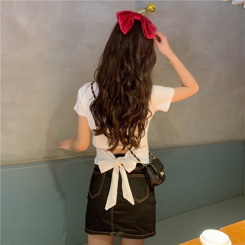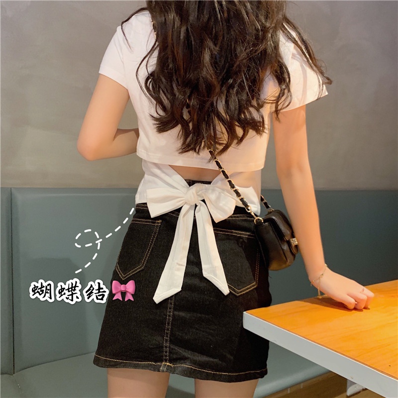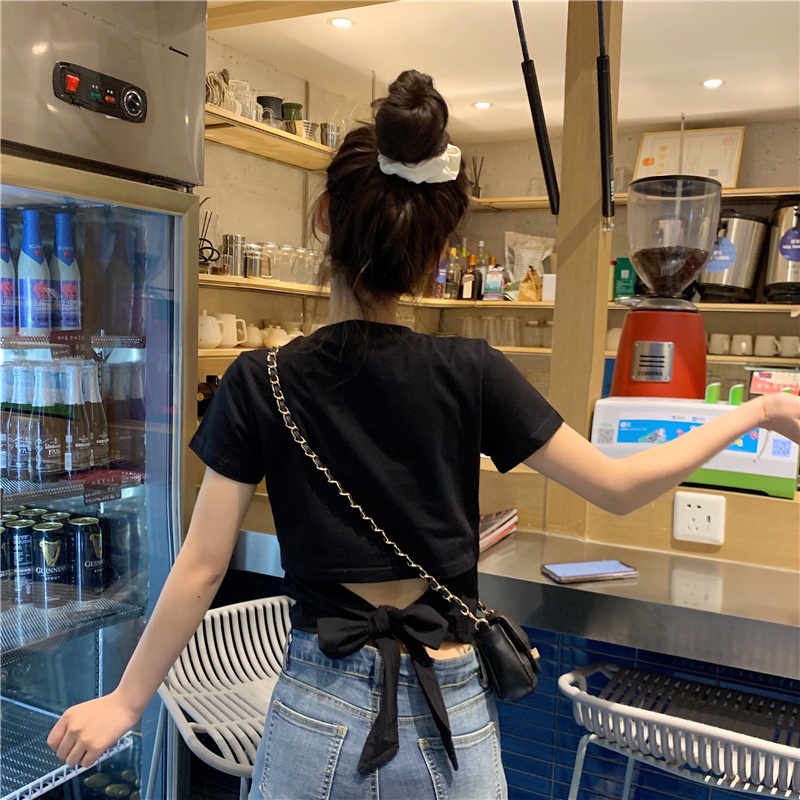 短袖t恤女衣服2025夏季新款辣妹露背蝴蝶结漏背短款设计感上衣潮
