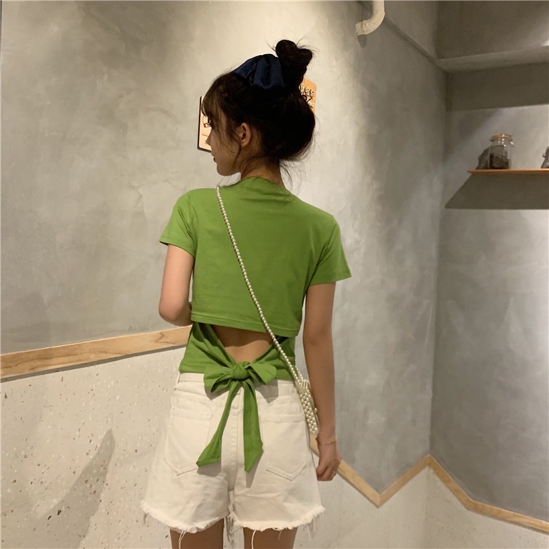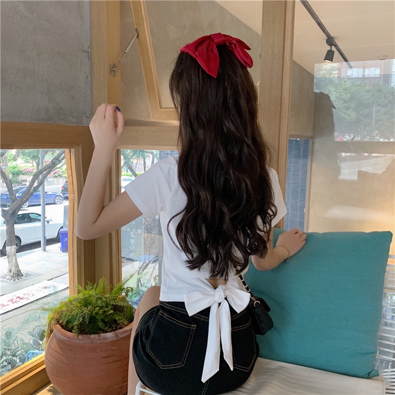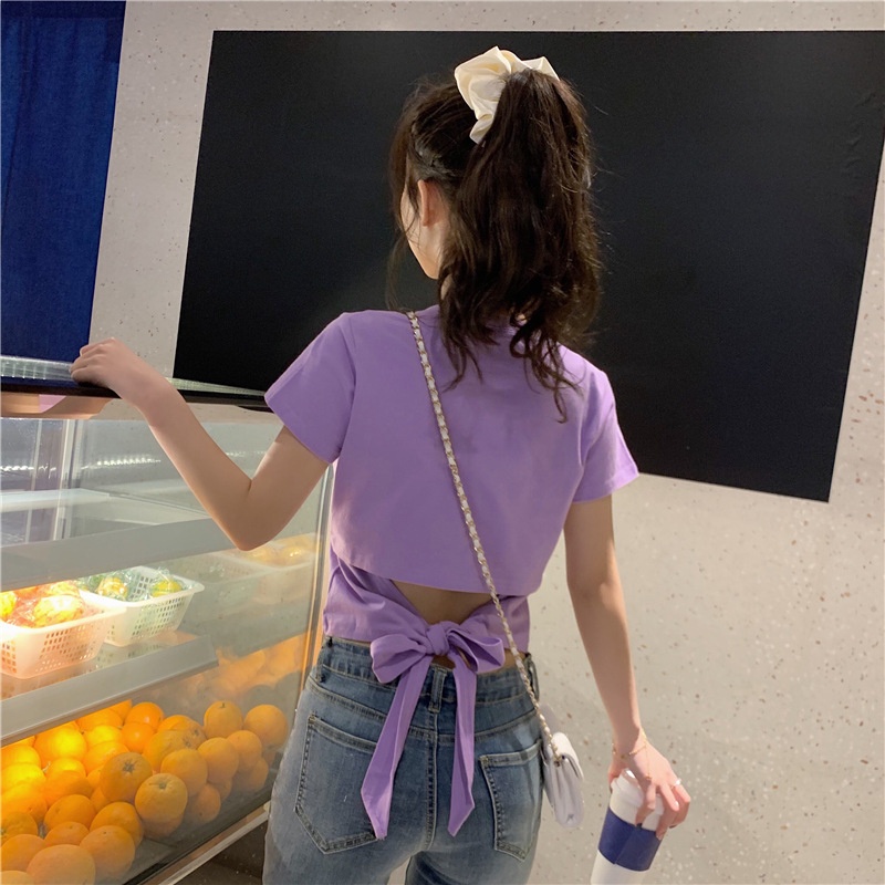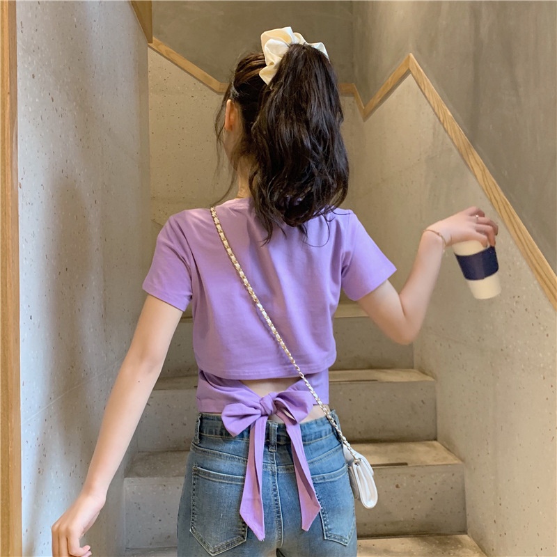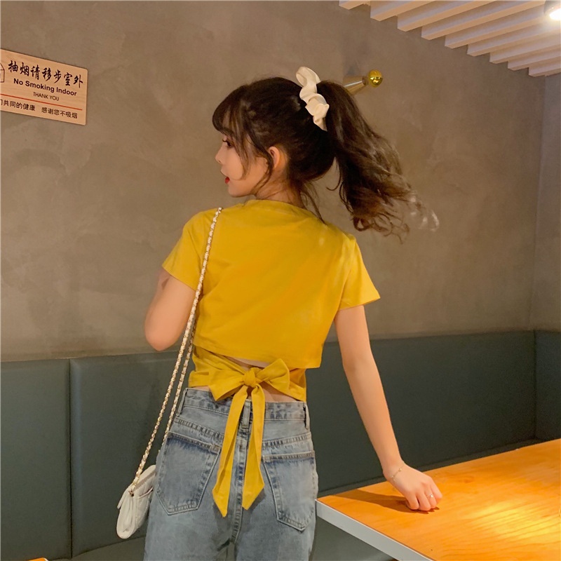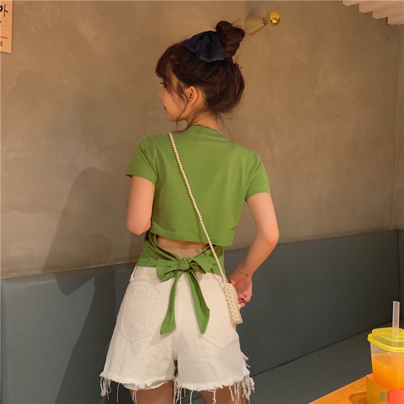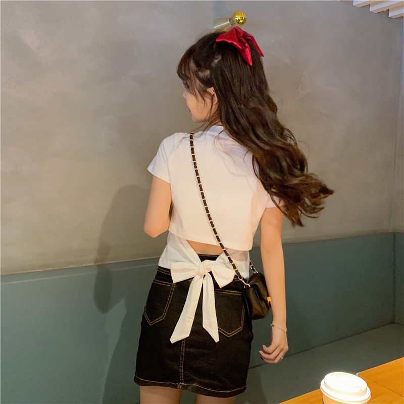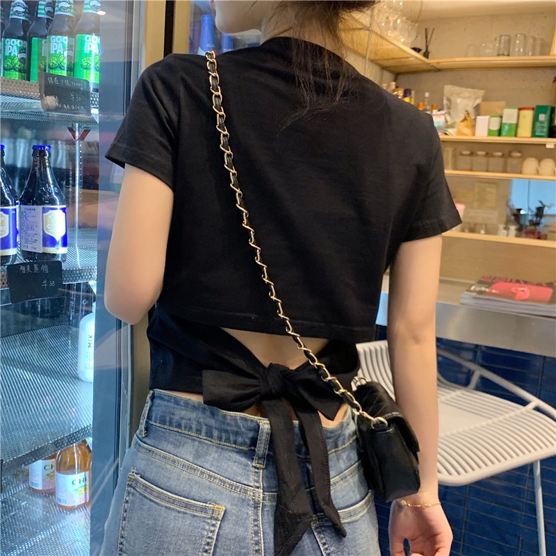短袖t恤女衣服2025夏季新款辣妹露背蝴蝶结漏背短款设计感上衣潮
