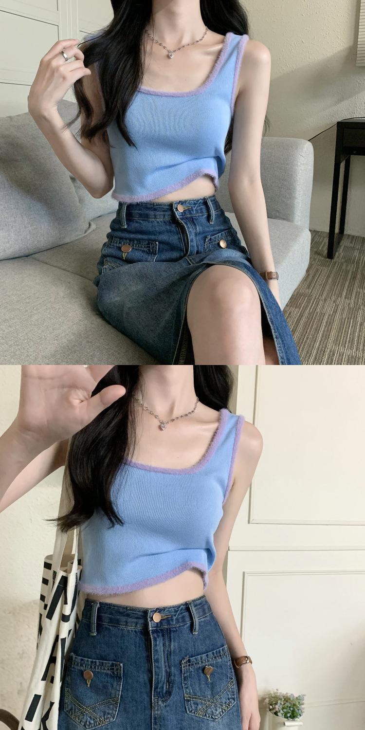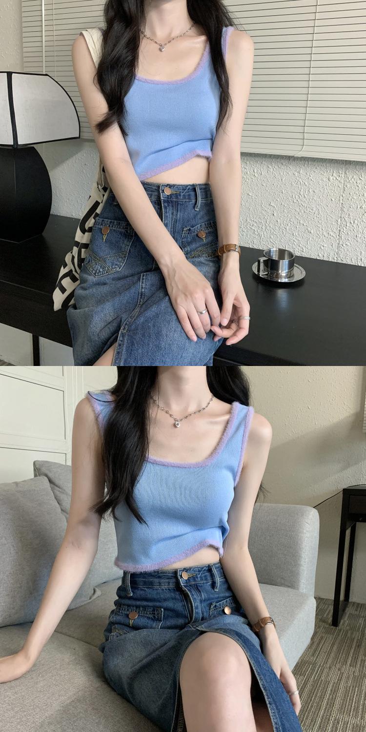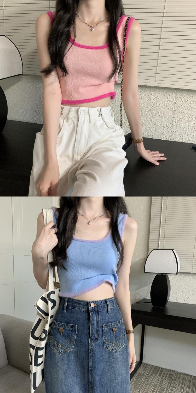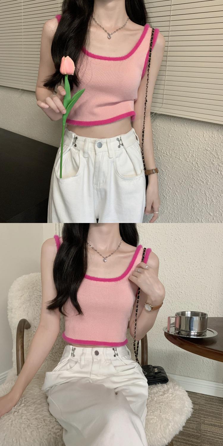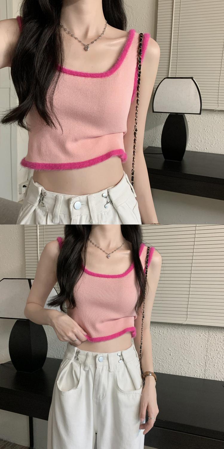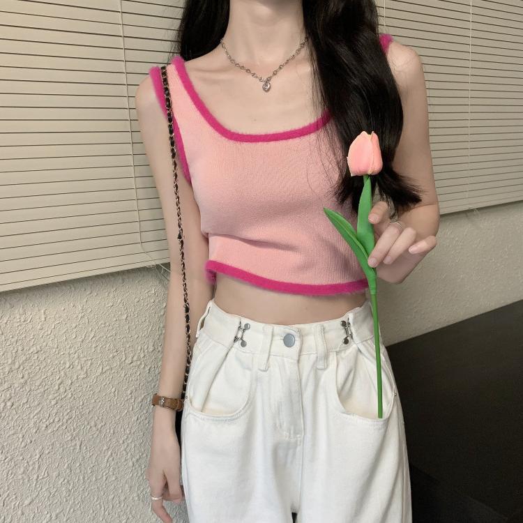韩版小个子拼色背心女内搭U领修身通勤风短款露背夏季款打底上衣