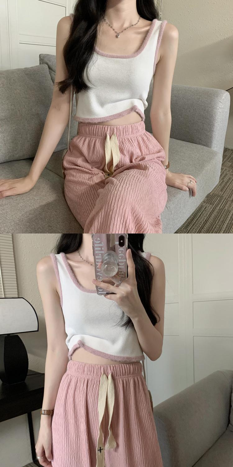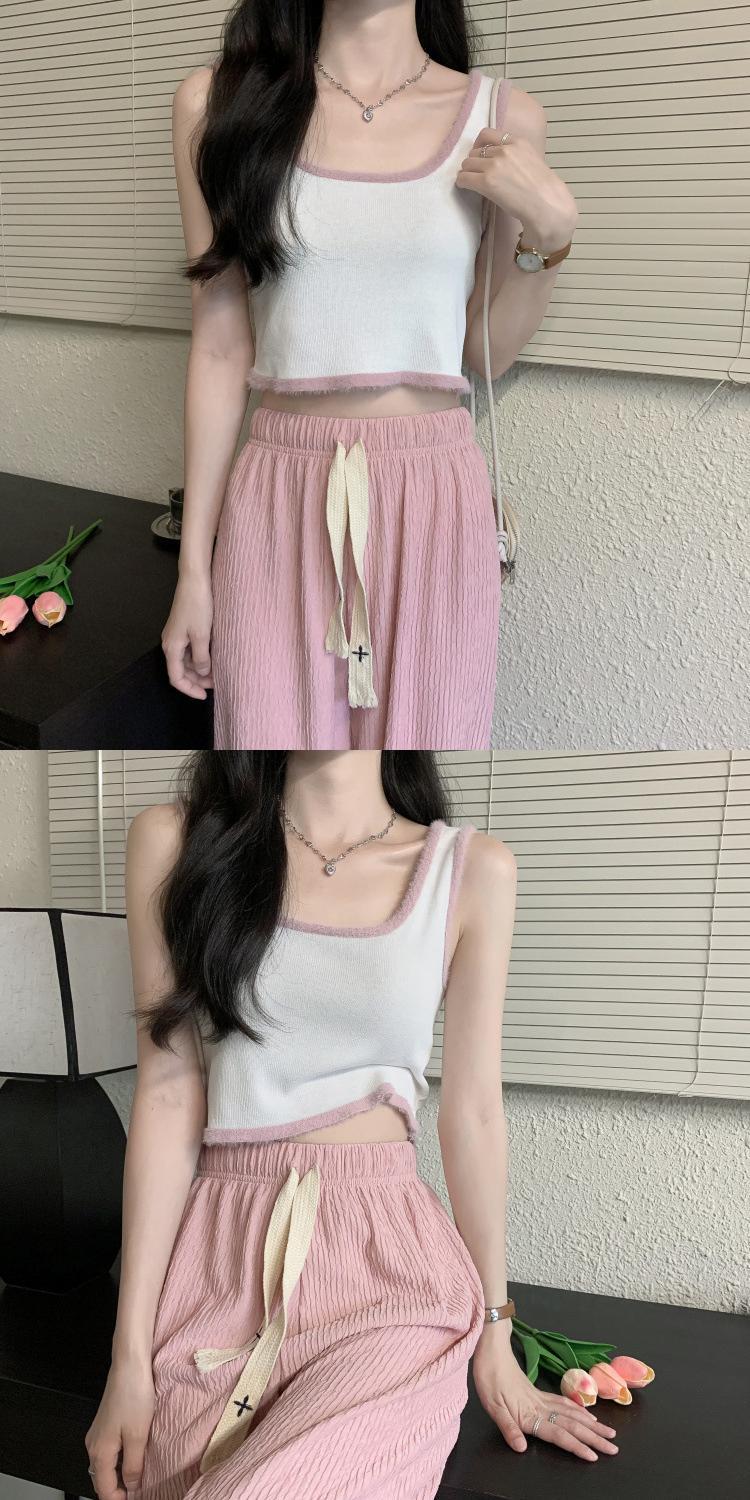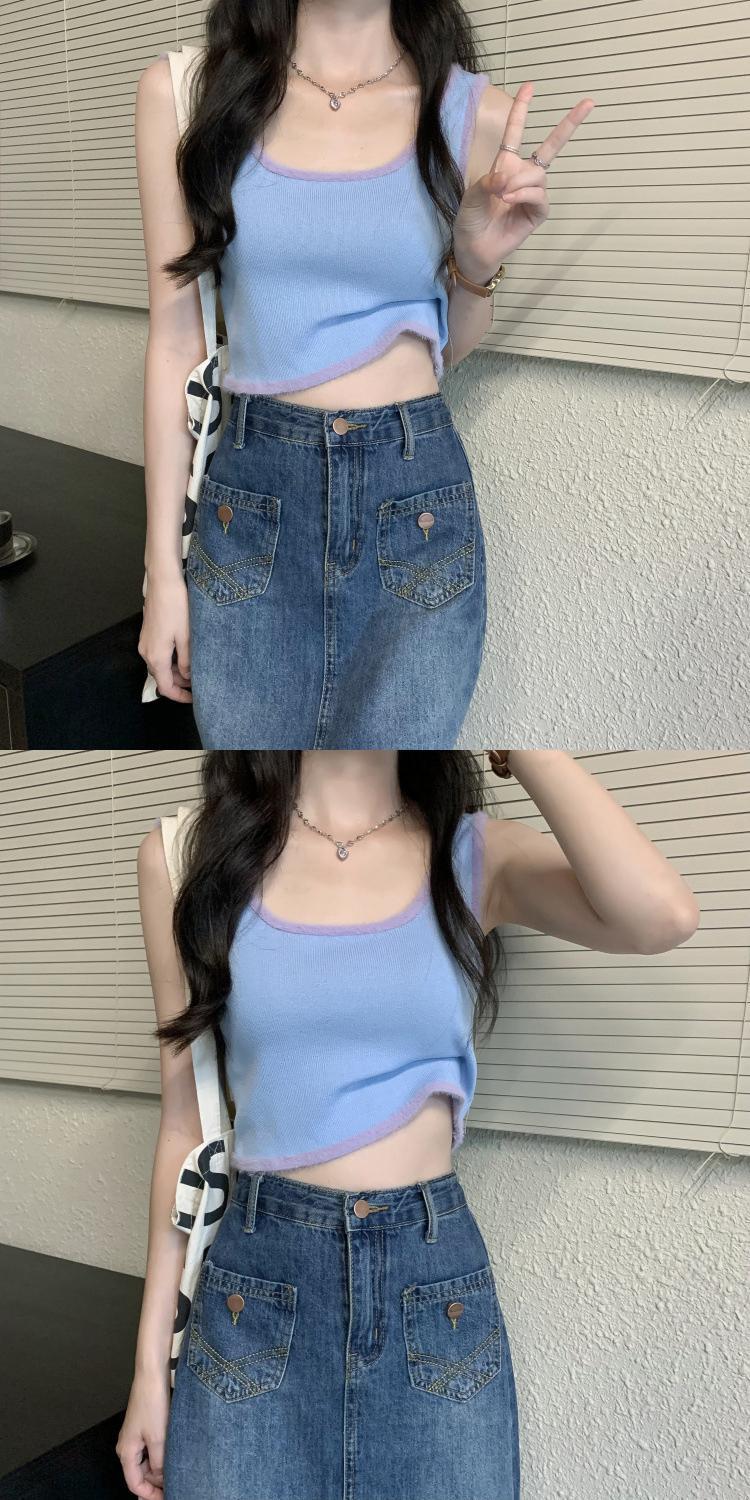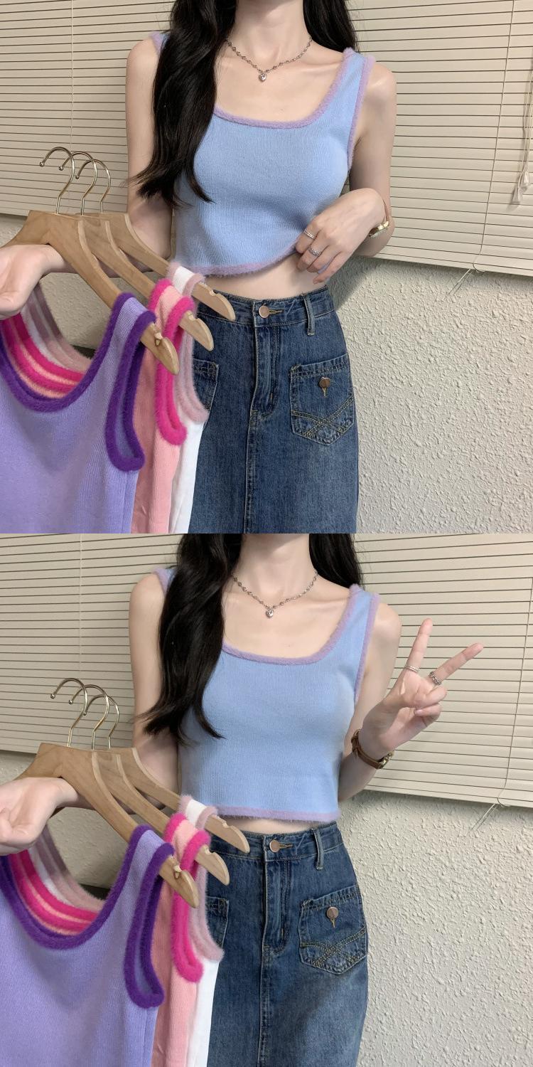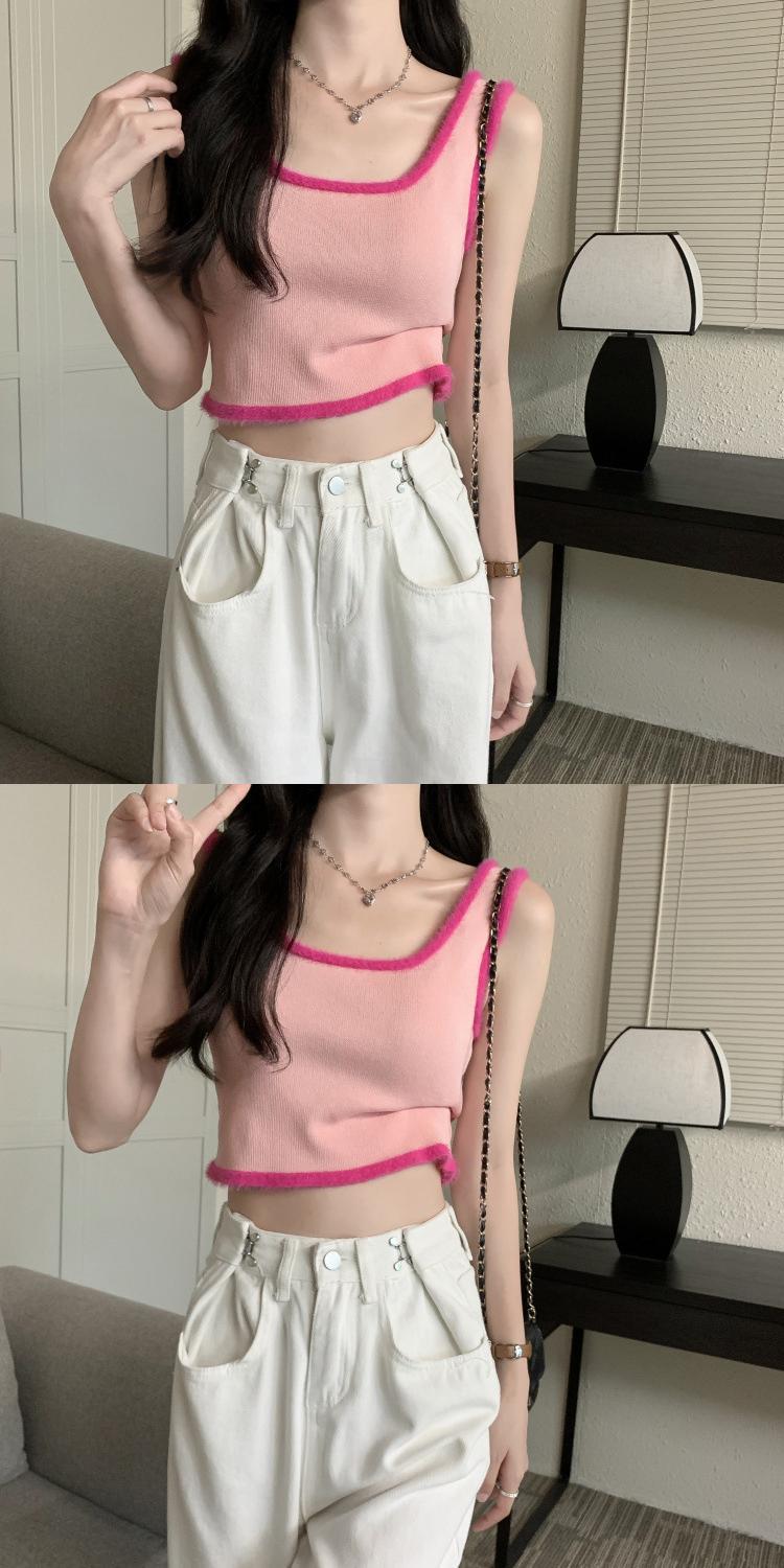 韩版小个子拼色背心女内搭U领修身通勤风短款露背夏季款打底上衣