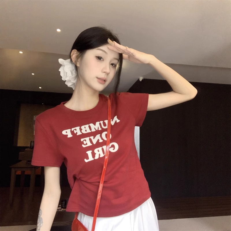 字母印花韩系短袖T恤女夏季2025新款修身显瘦正肩套头学生上衣ins