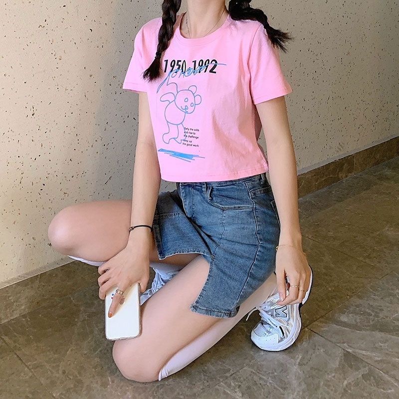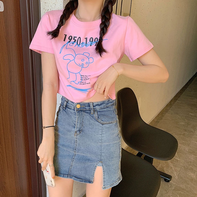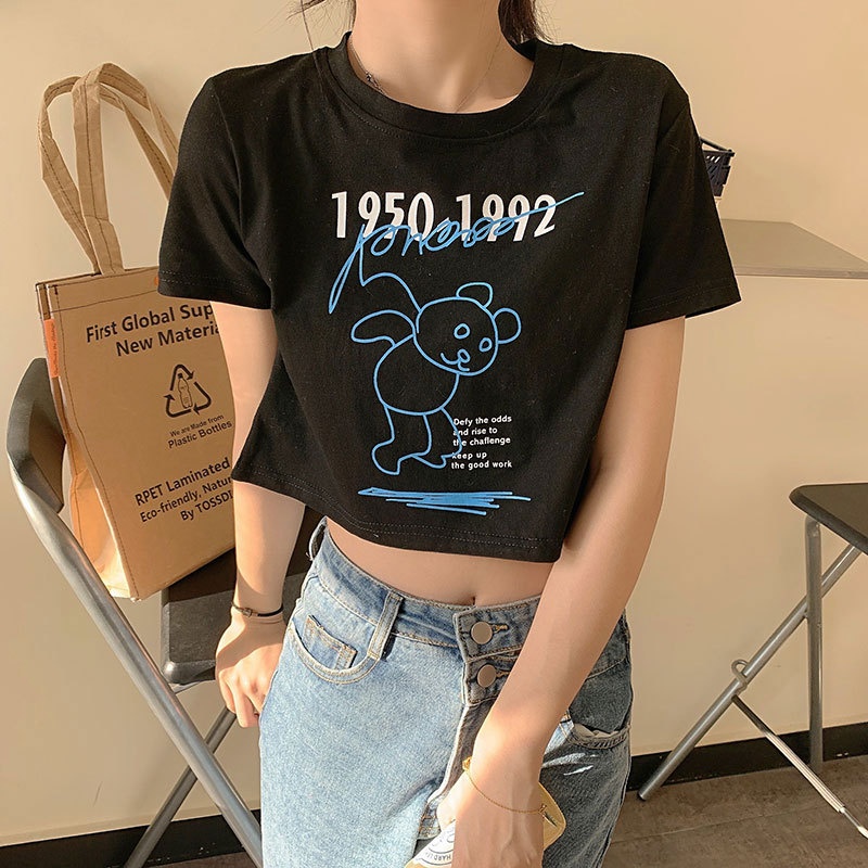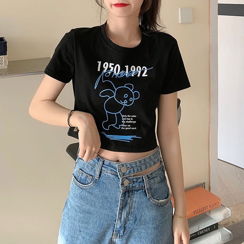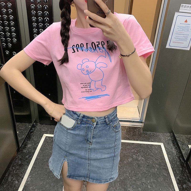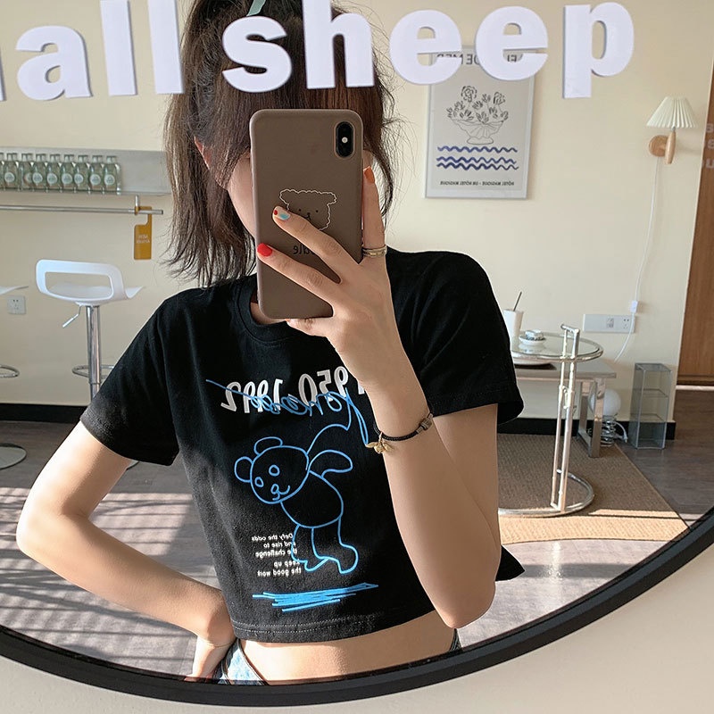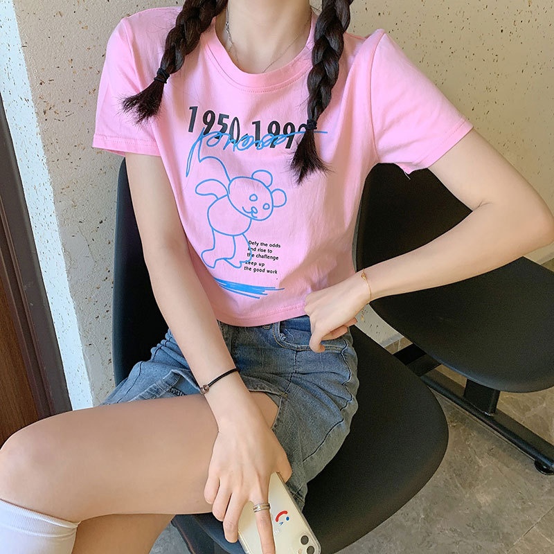 小熊印花短款t恤女2025夏新款修身韩版高腰露脐短袖上衣跨境女装