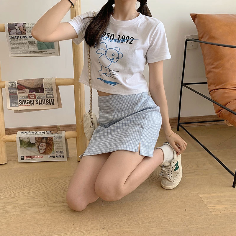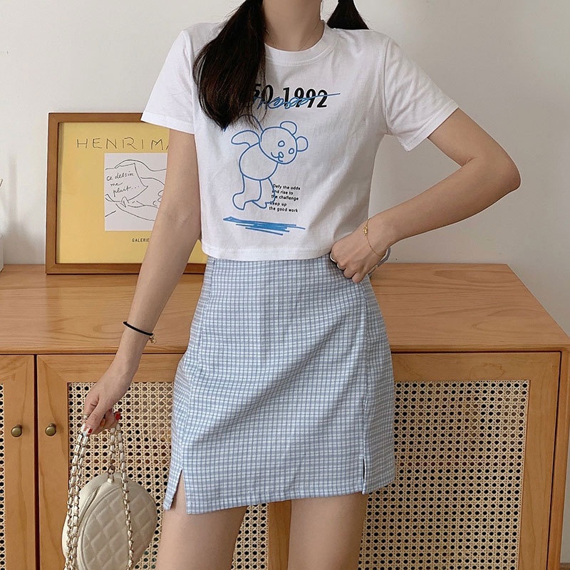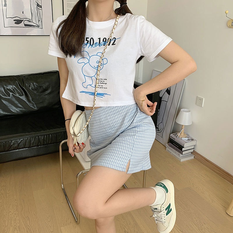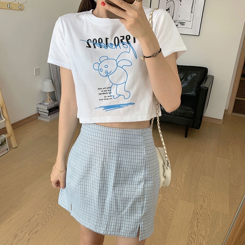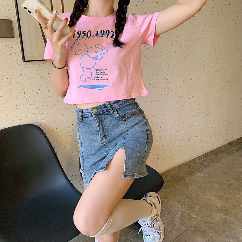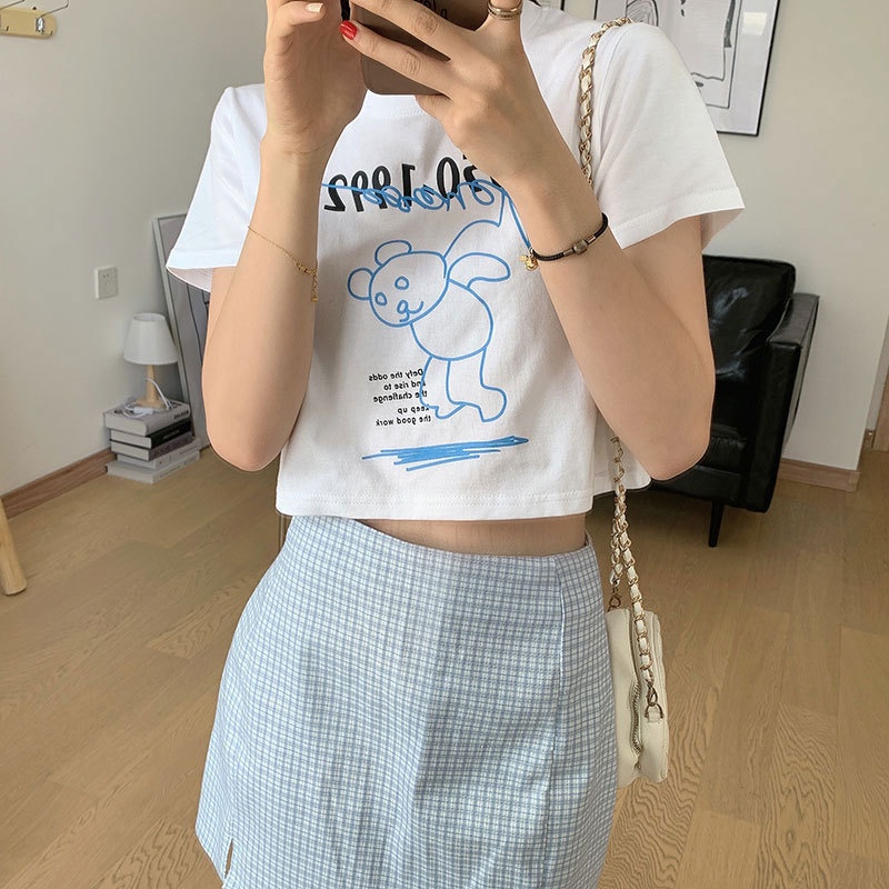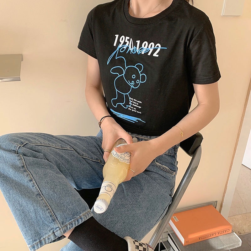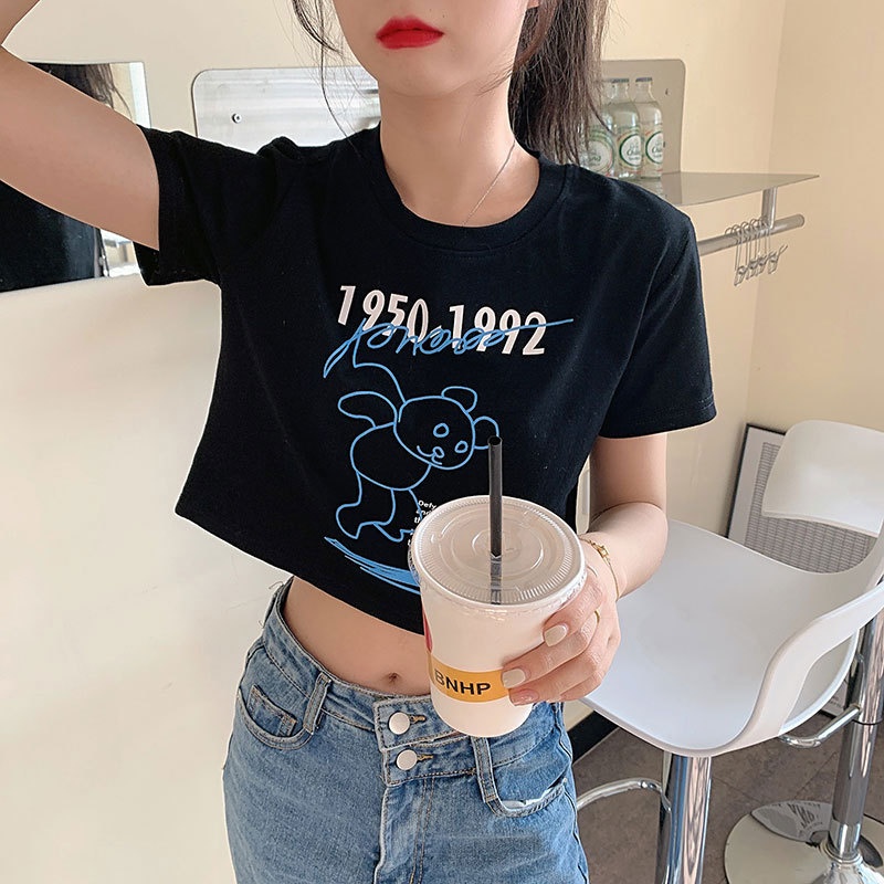 小熊印花短款t恤女2025夏新款修身韩版高腰露脐短袖上衣跨境女装