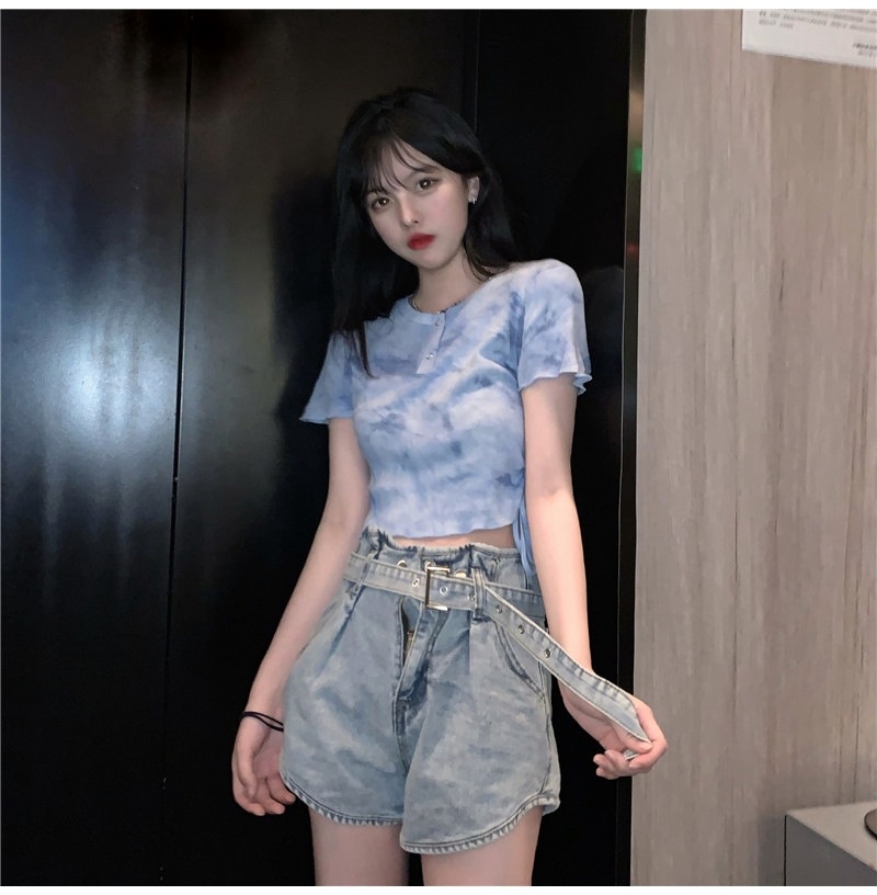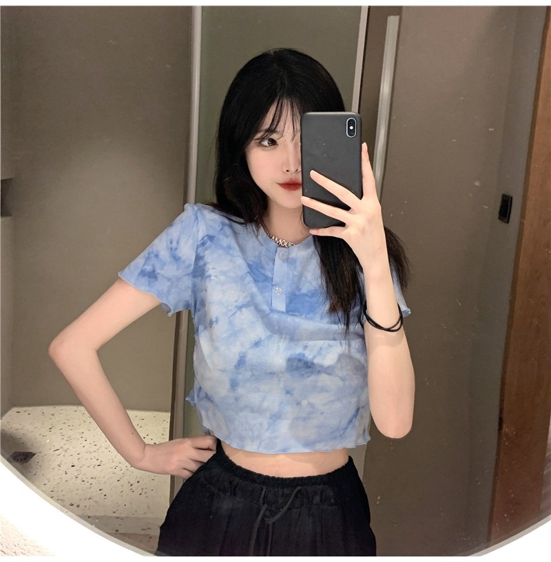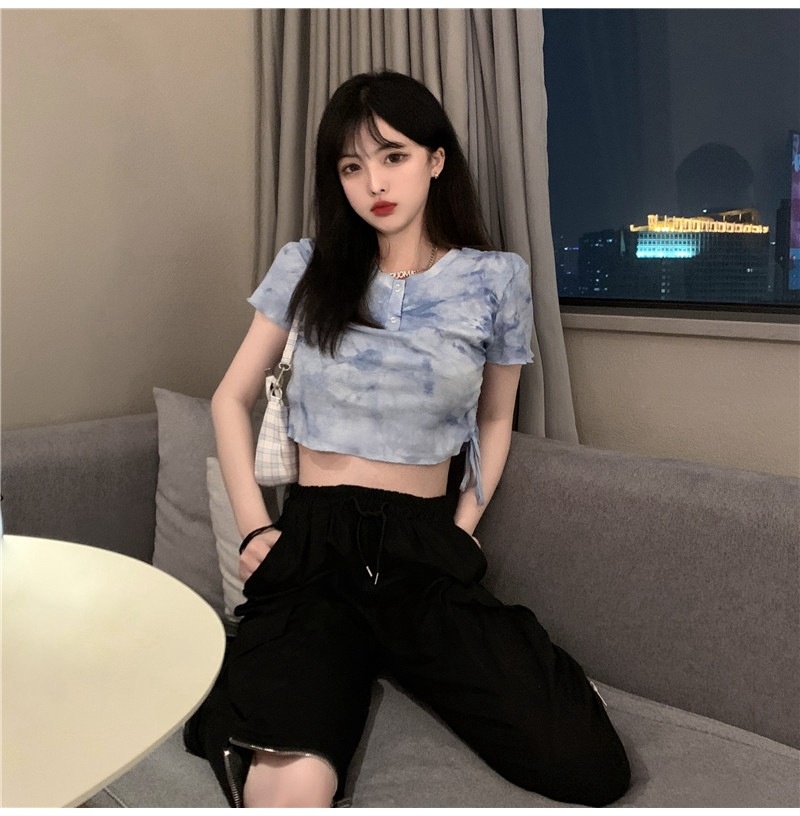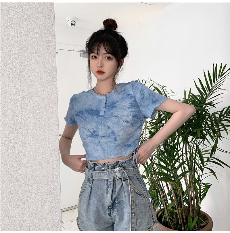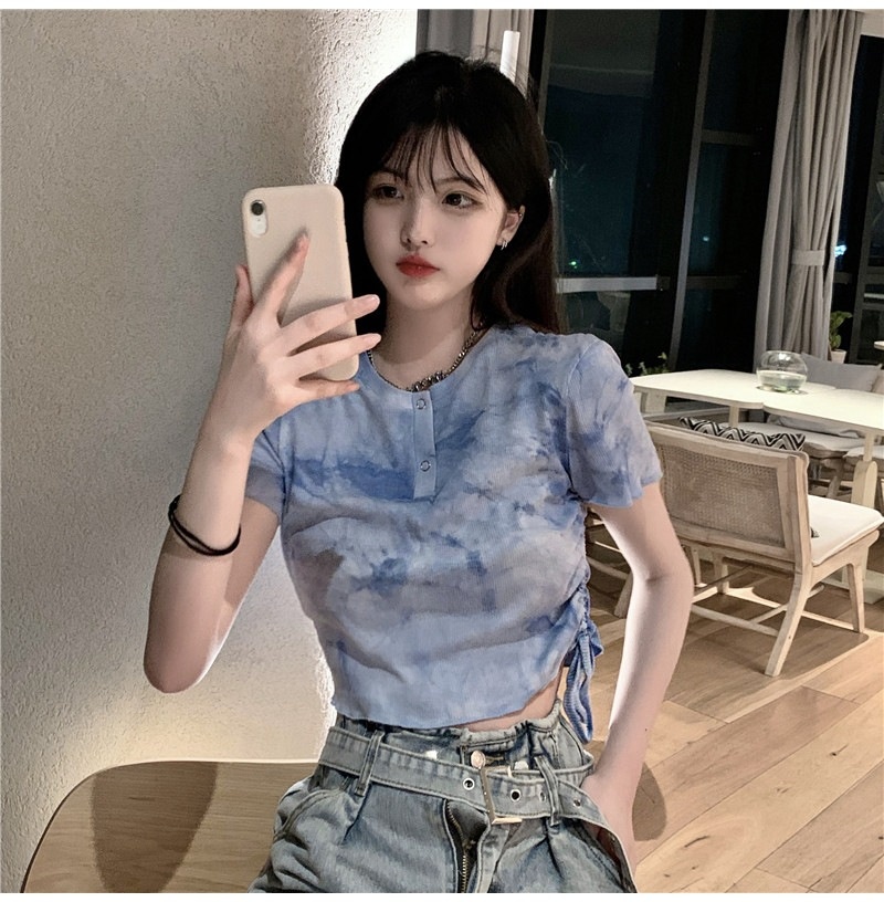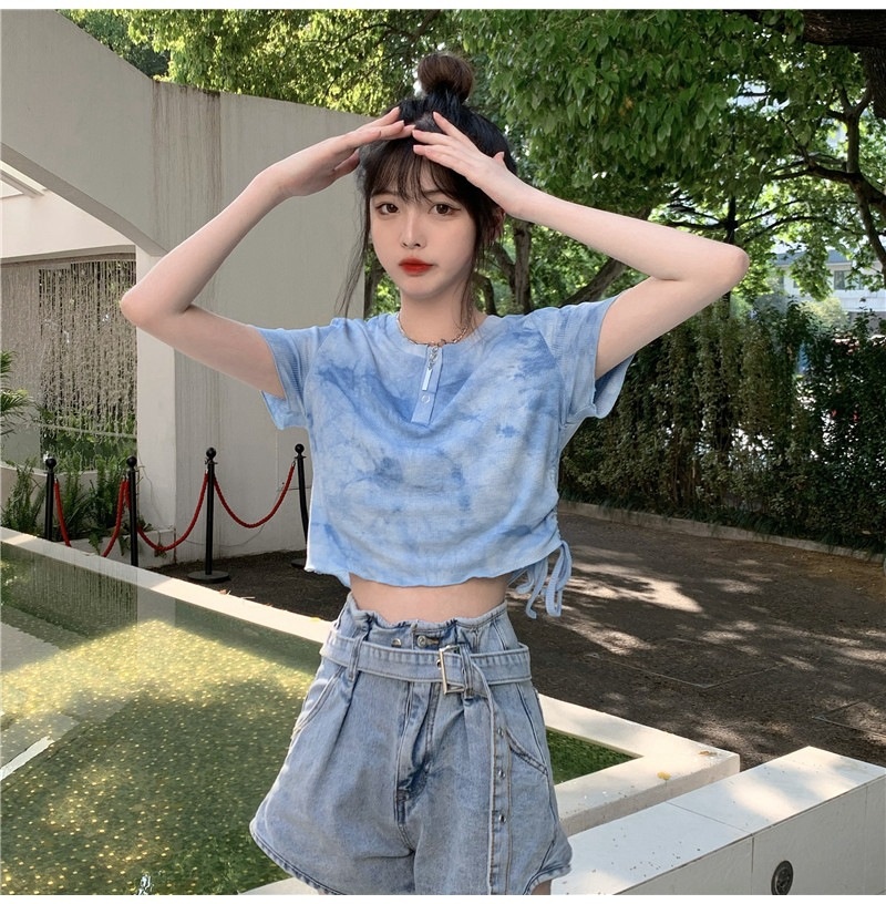 设计感字母扎染抽绳短袖T恤女2025新款宽松短款高腰辣妹上衣ins潮