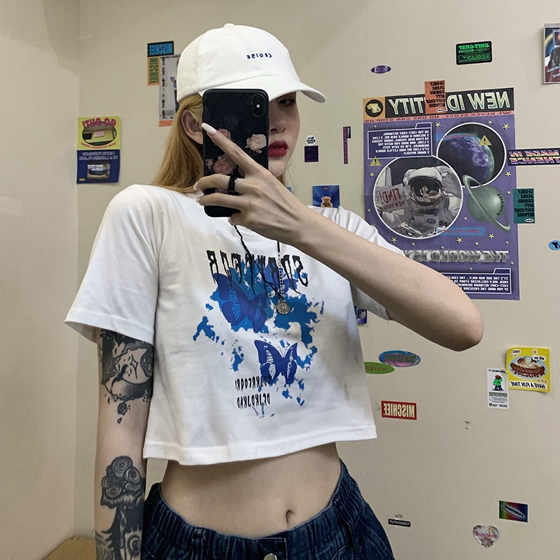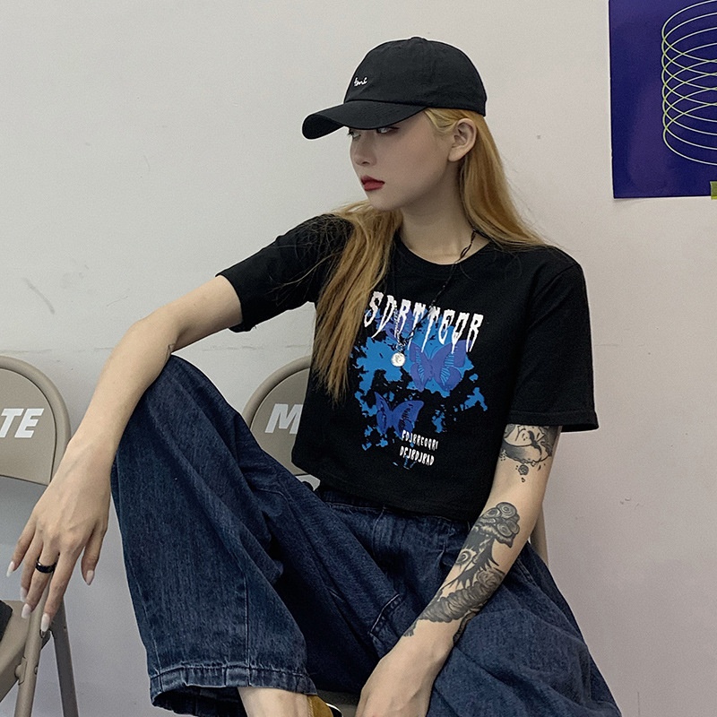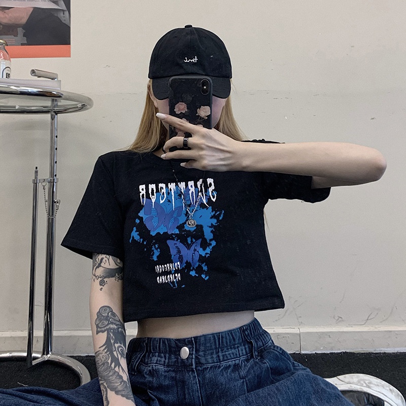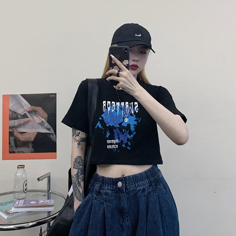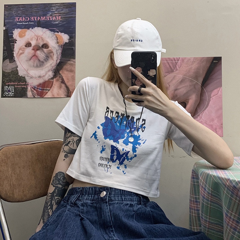 2025年夏季新款韩版ins复古蝴蝶印花短款露脐上衣修身短袖T恤女潮