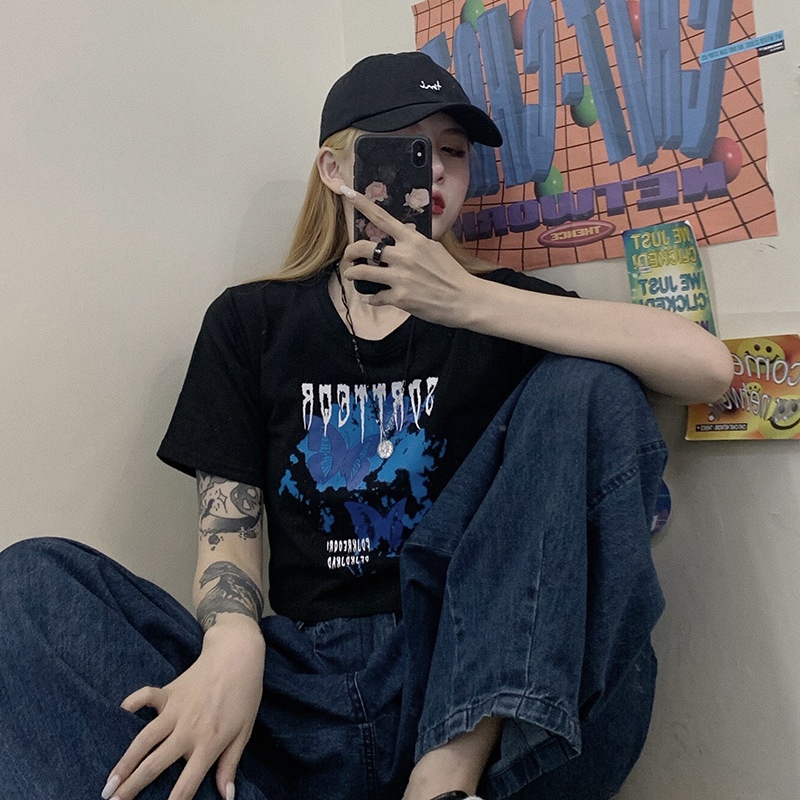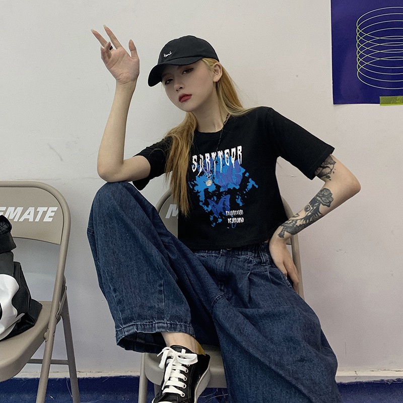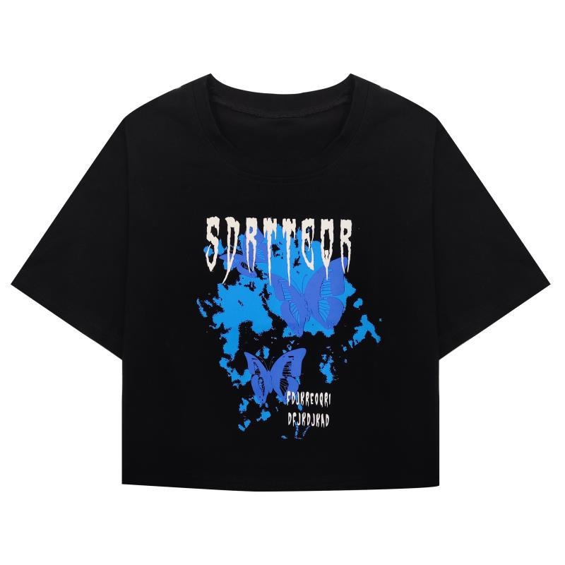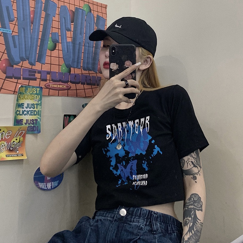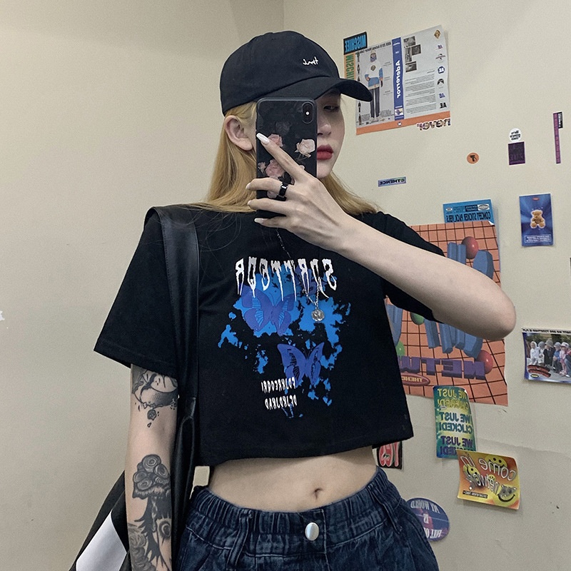 2025年夏季新款韩版ins复古蝴蝶印花短款露脐上衣修身短袖T恤女潮