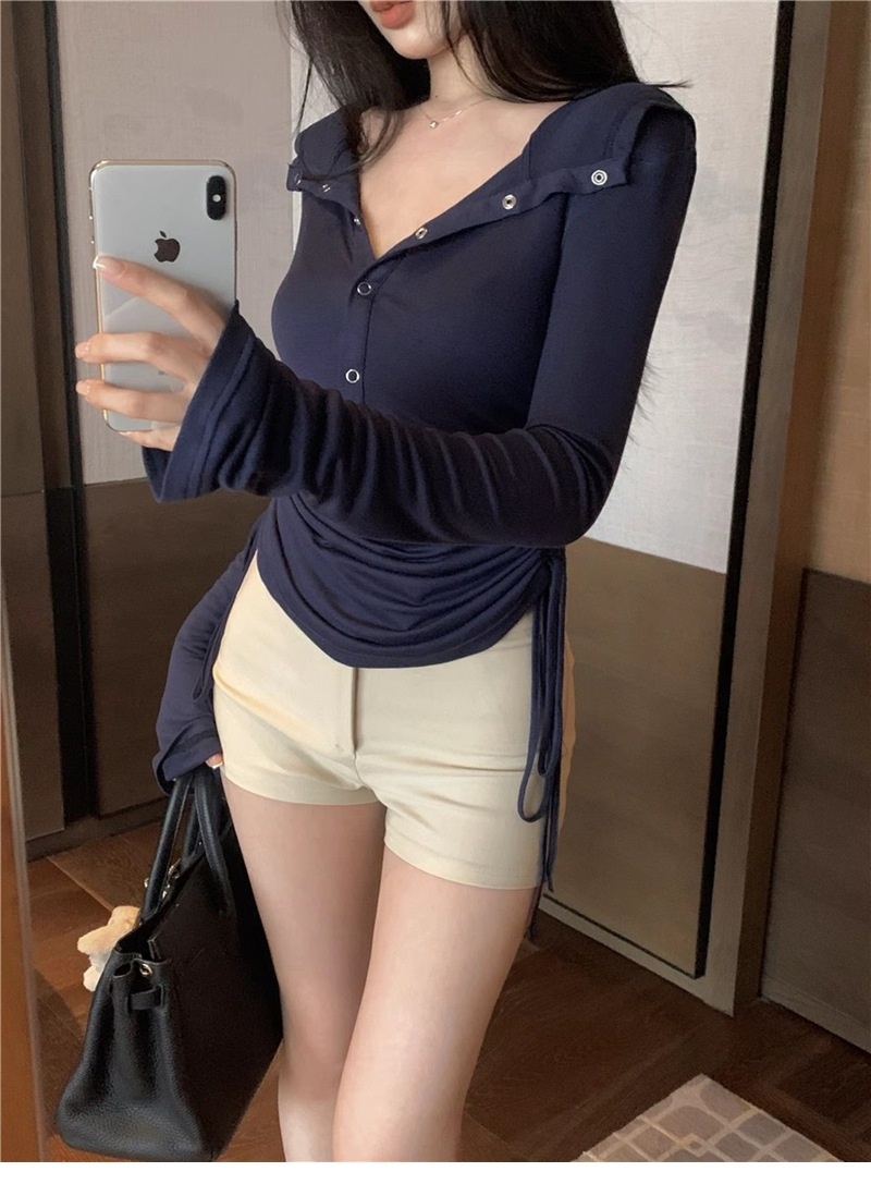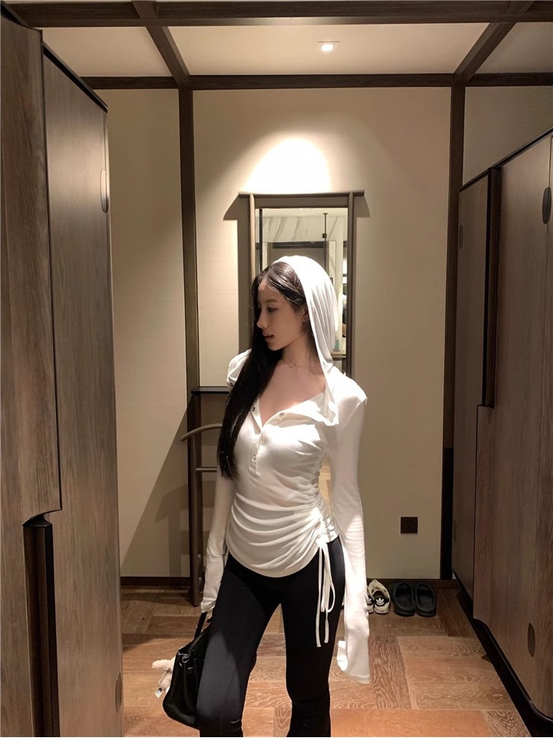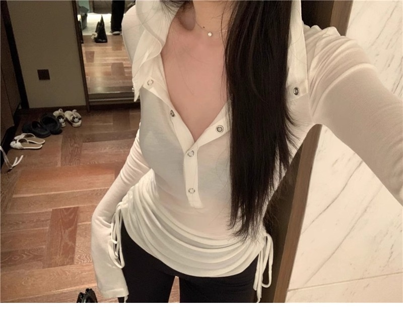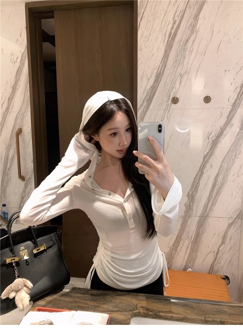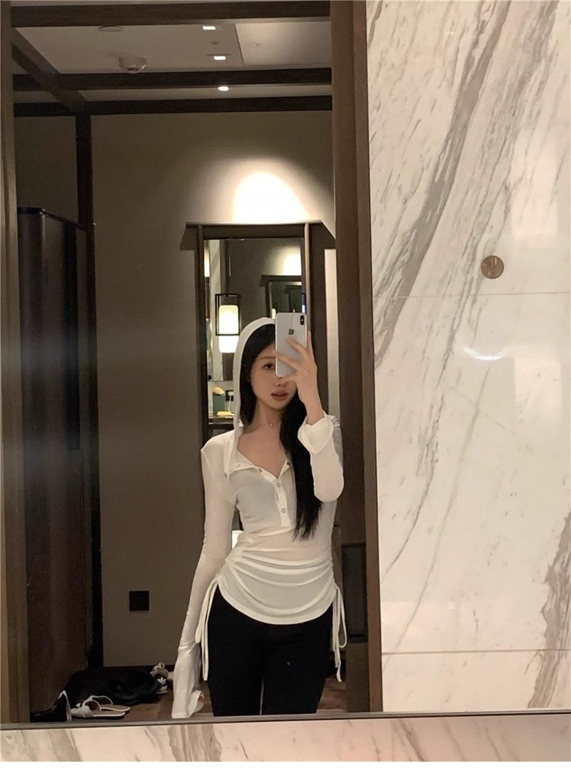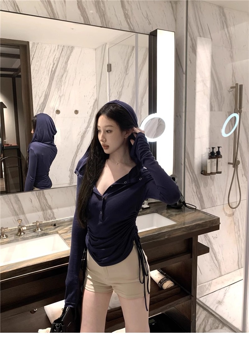 甜辣妹连帽长袖t恤女2025早秋设计感抽绳褶皱修身内搭打底衫上衣