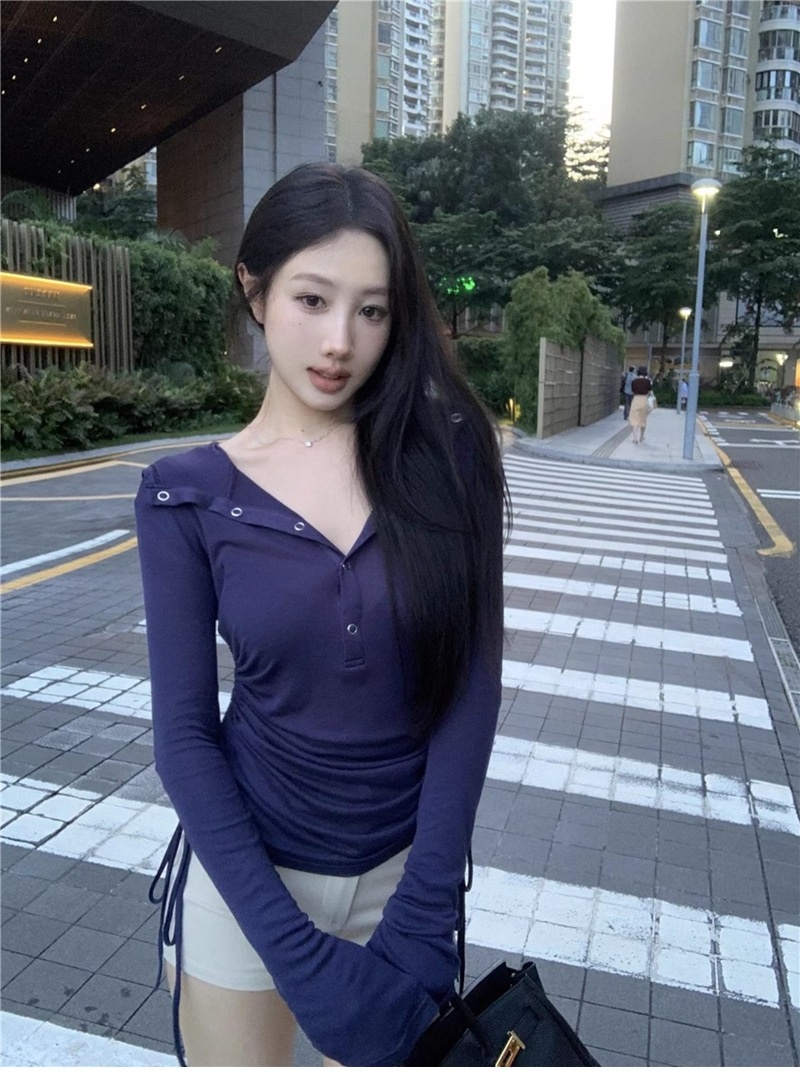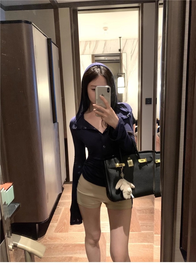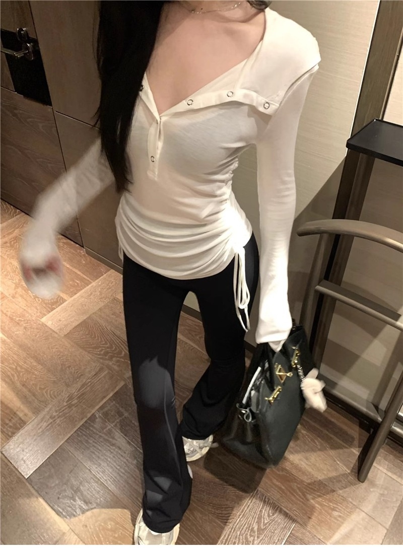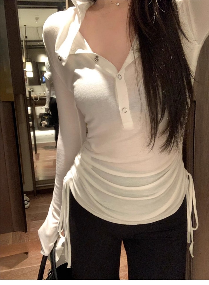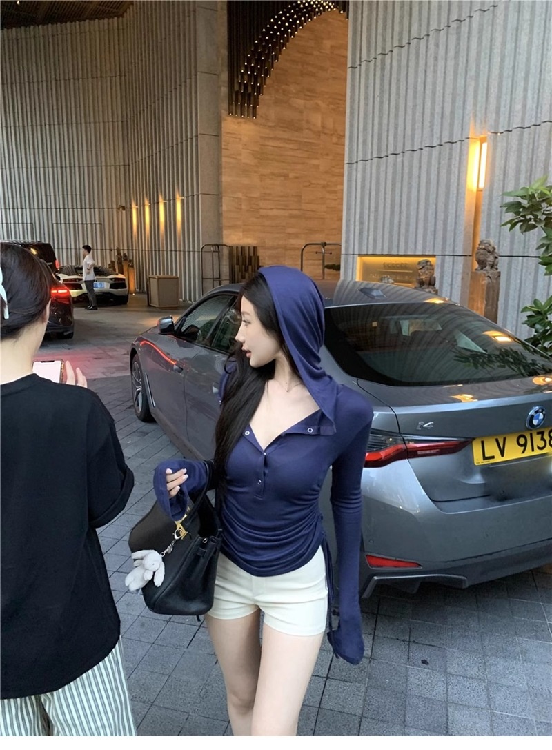 甜辣妹连帽长袖t恤女2025早秋设计感抽绳褶皱修身内搭打底衫上衣