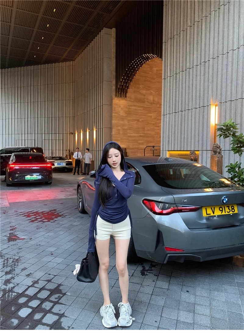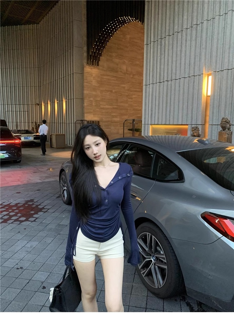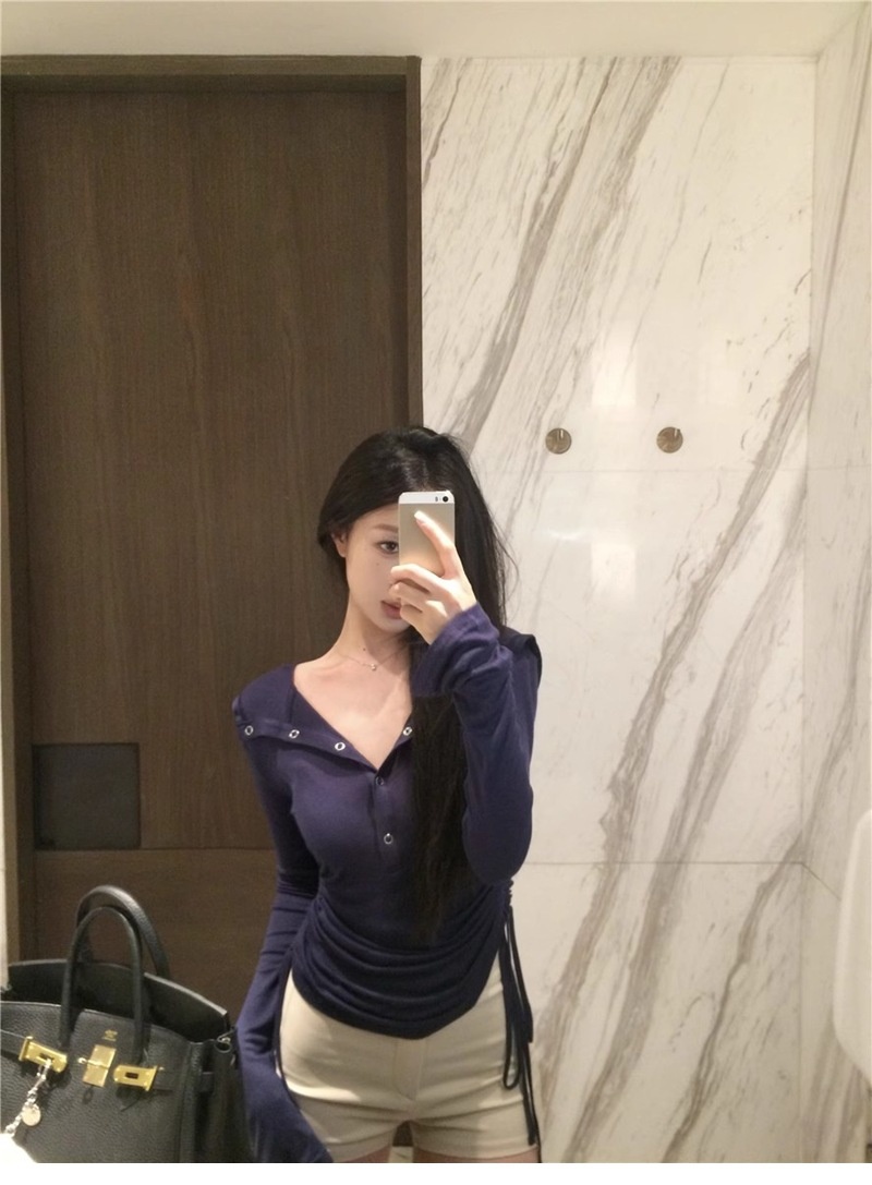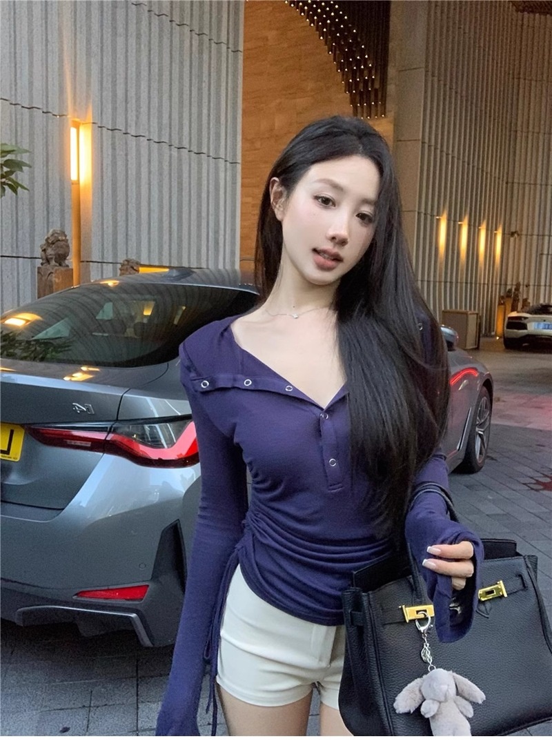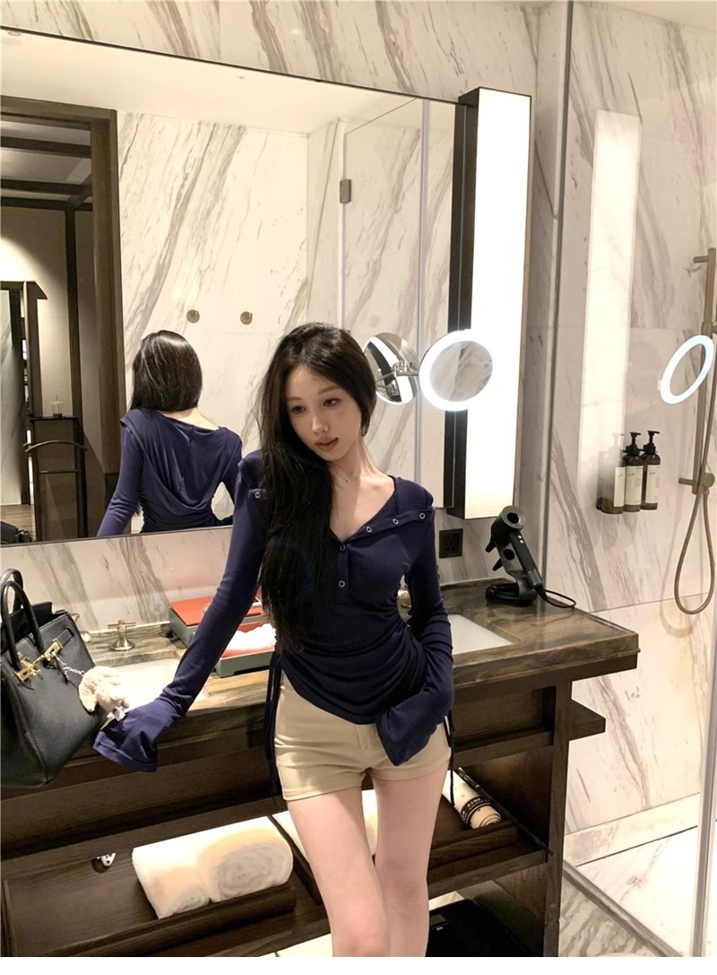 甜辣妹连帽长袖t恤女2025早秋设计感抽绳褶皱修身内搭打底衫上衣