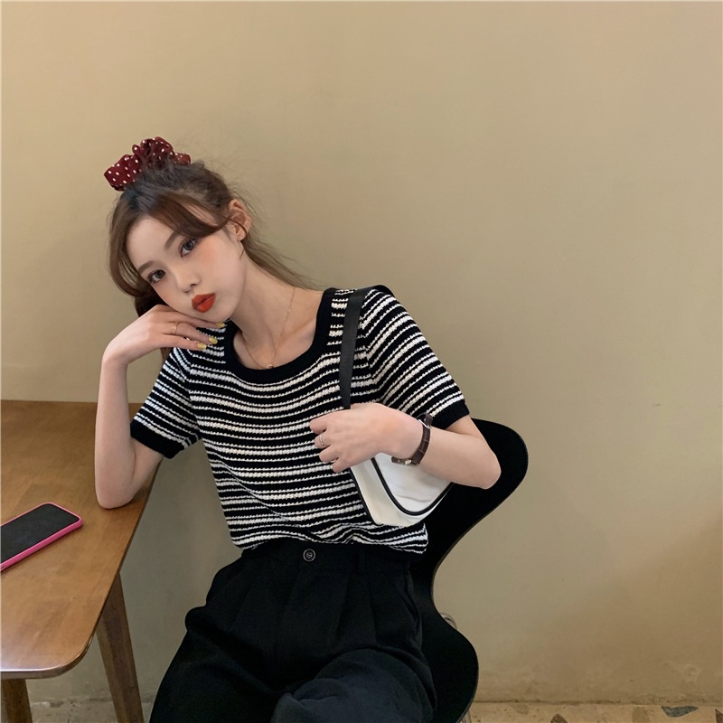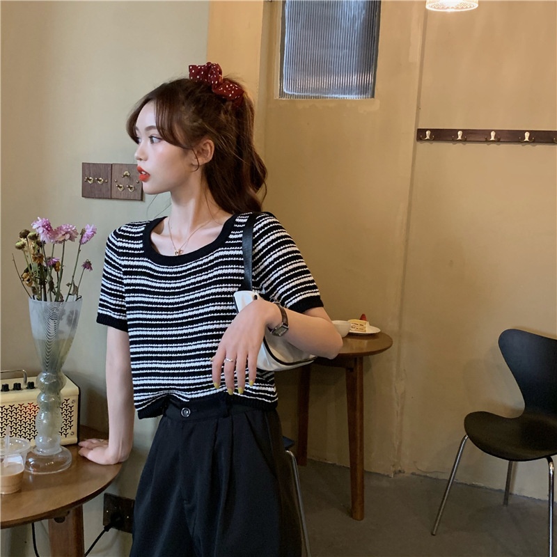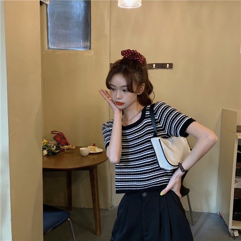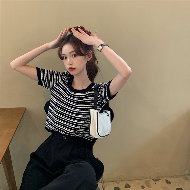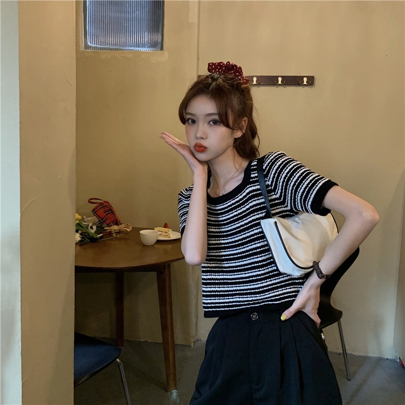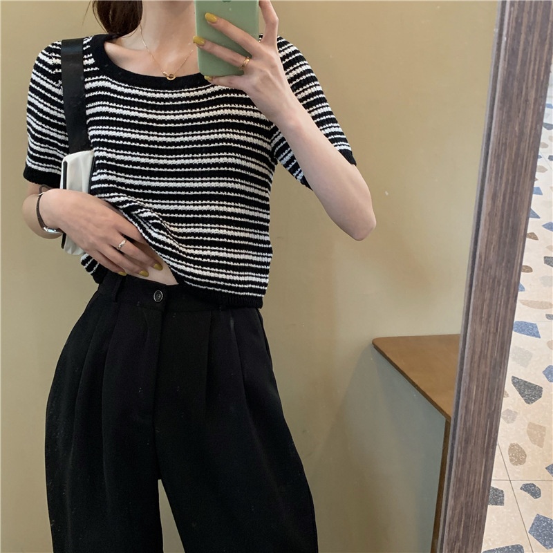 黑白条纹针织衫T恤女短款短袖上衣夏季2025新款高腰韩版宽松ins潮