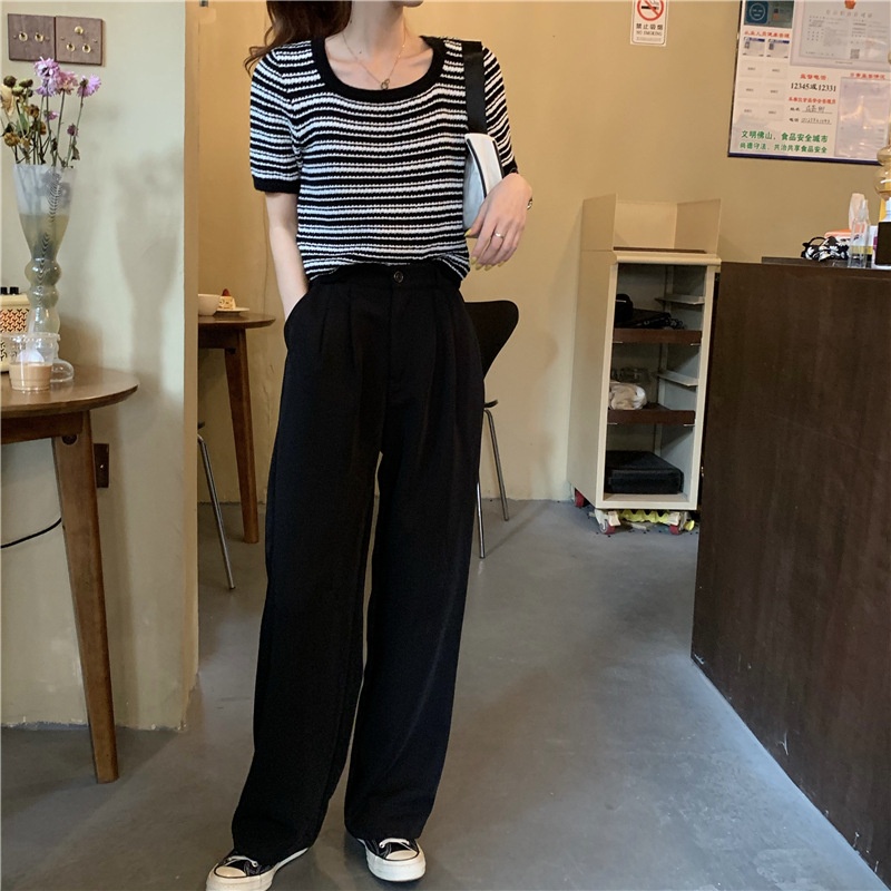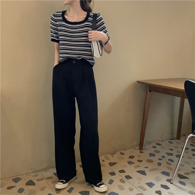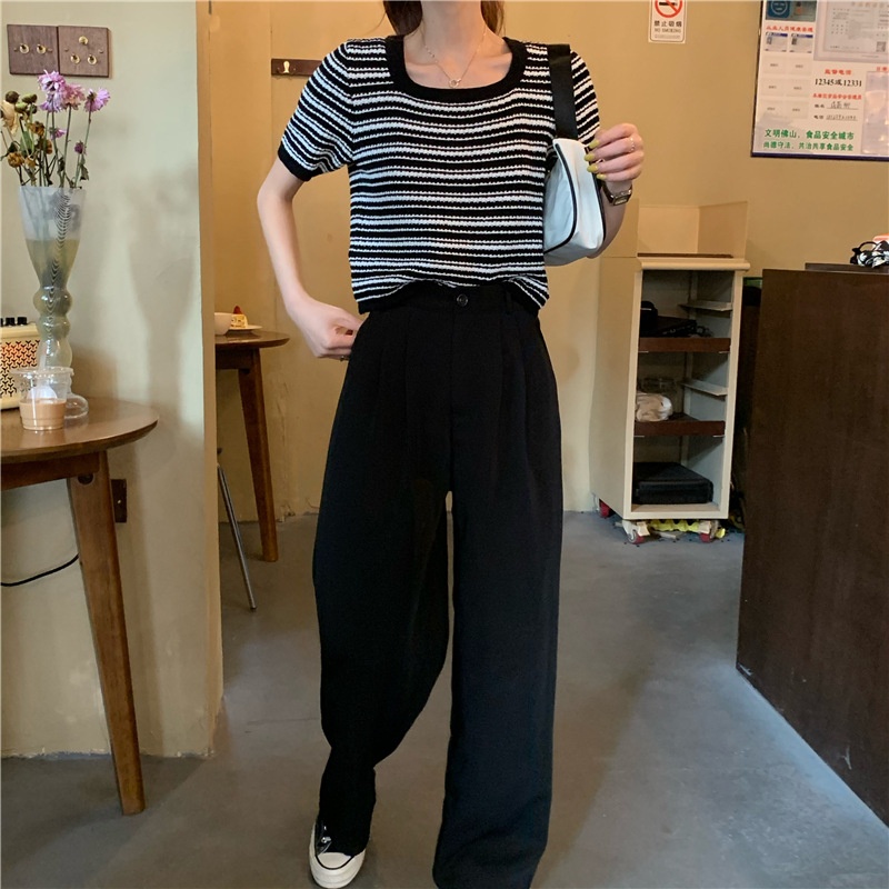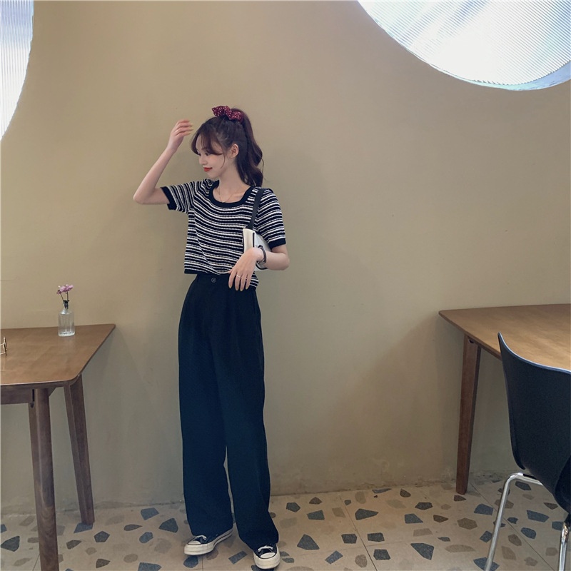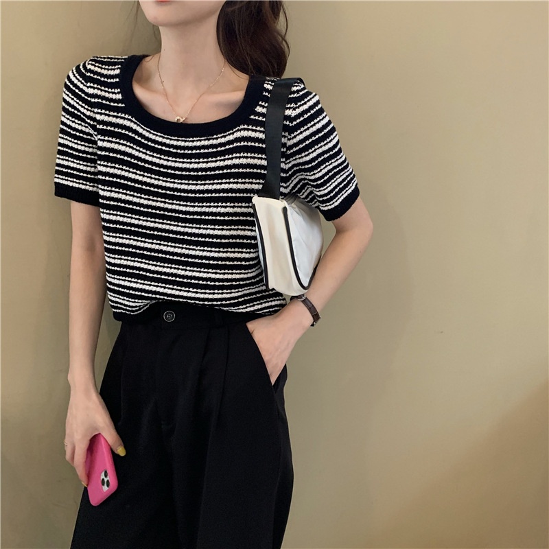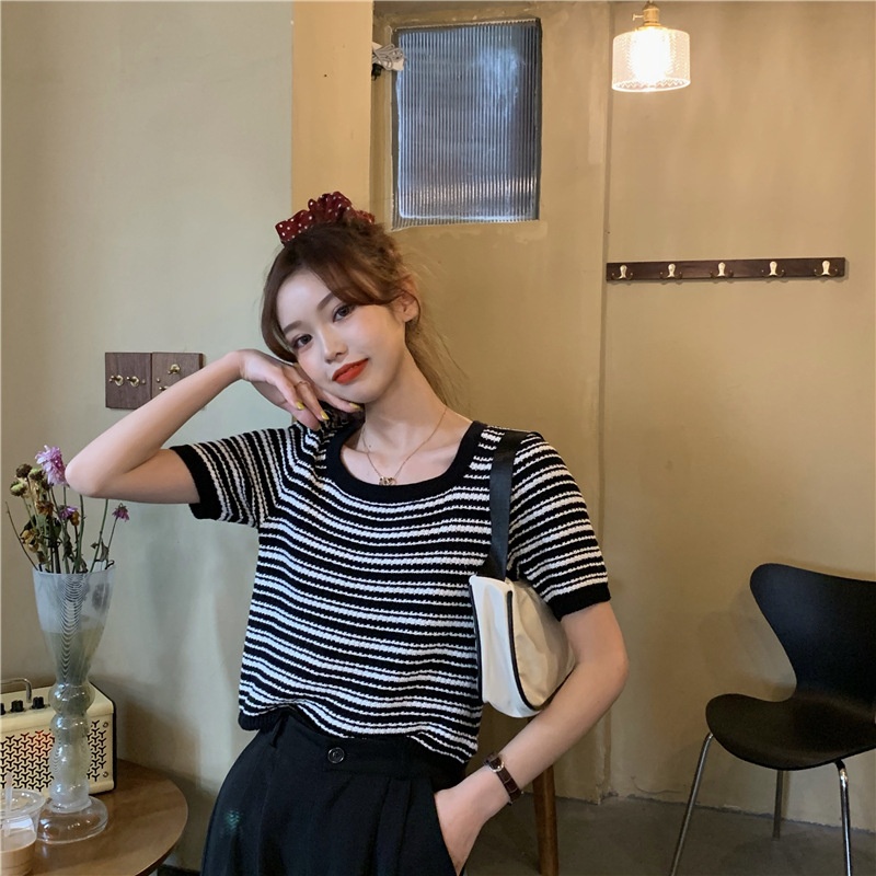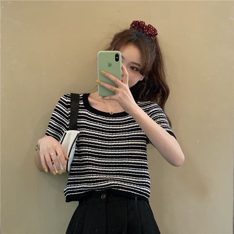 黑白条纹针织衫T恤女短款短袖上衣夏季2025新款高腰韩版宽松ins潮