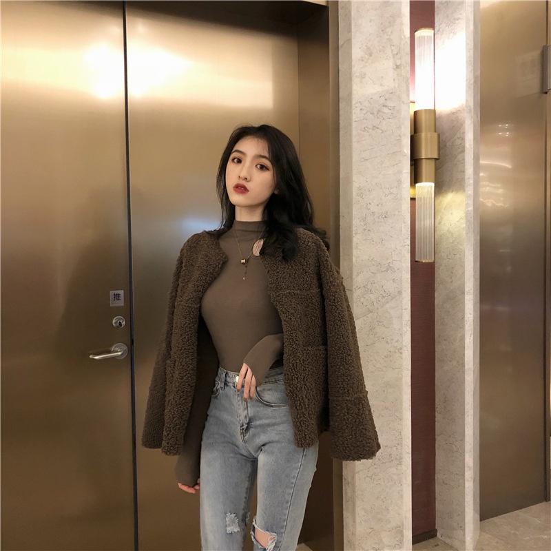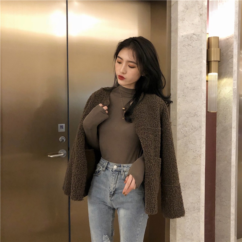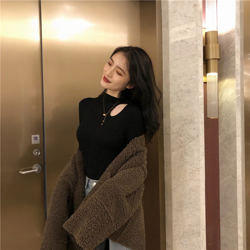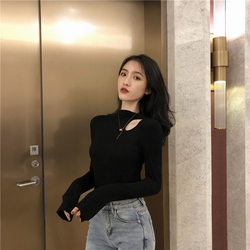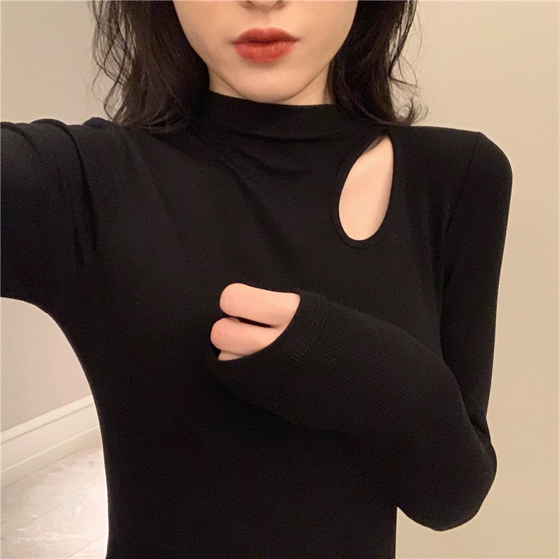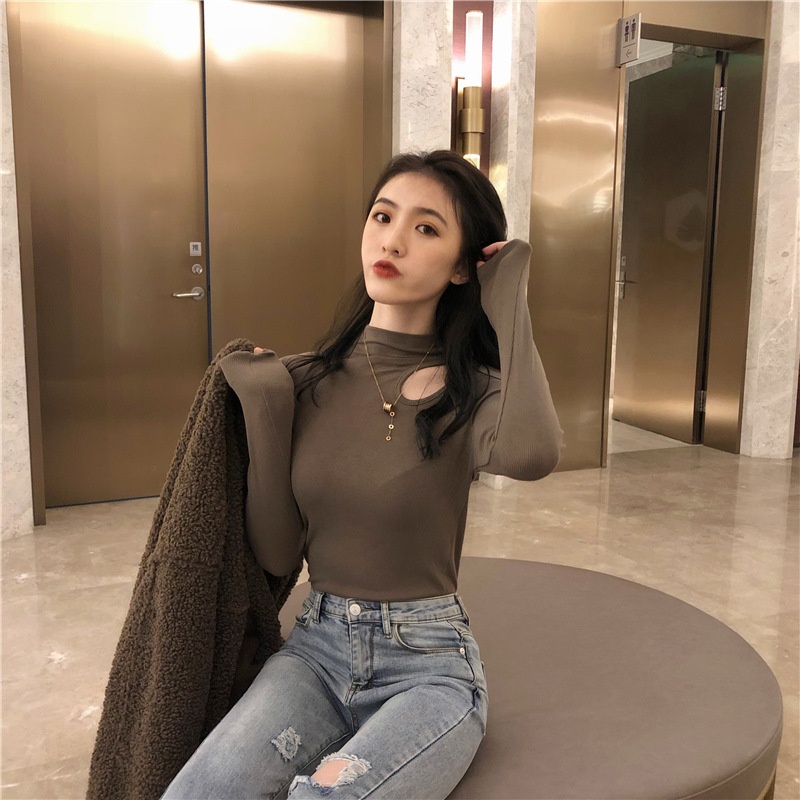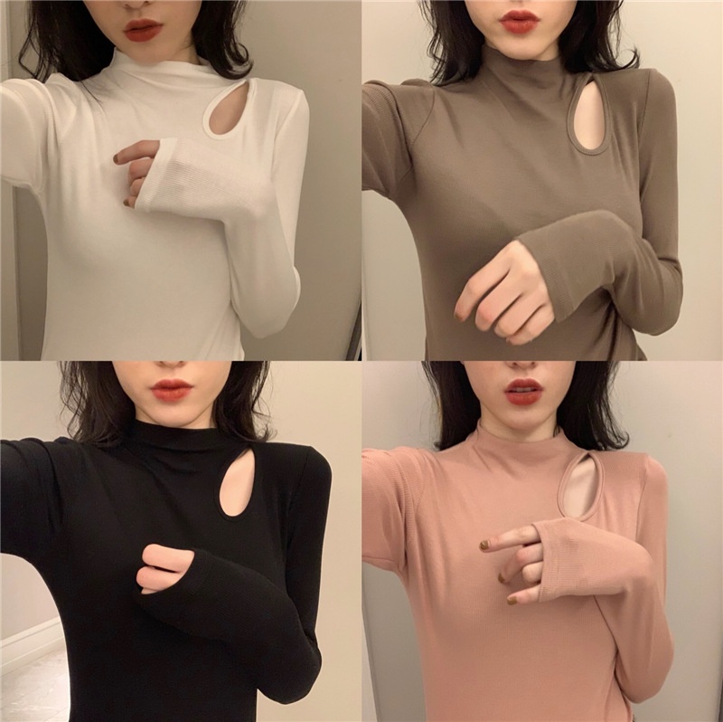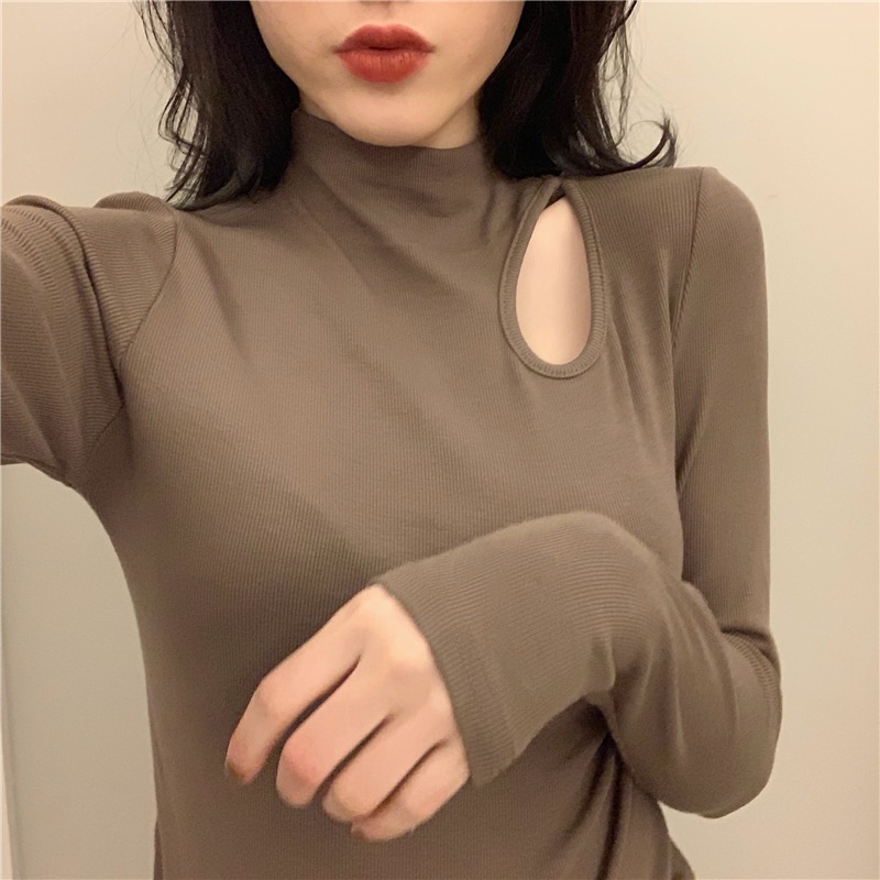 螺纹半高领打底衫女秋冬季洋气内搭修身小心机上衣露锁骨长袖T恤